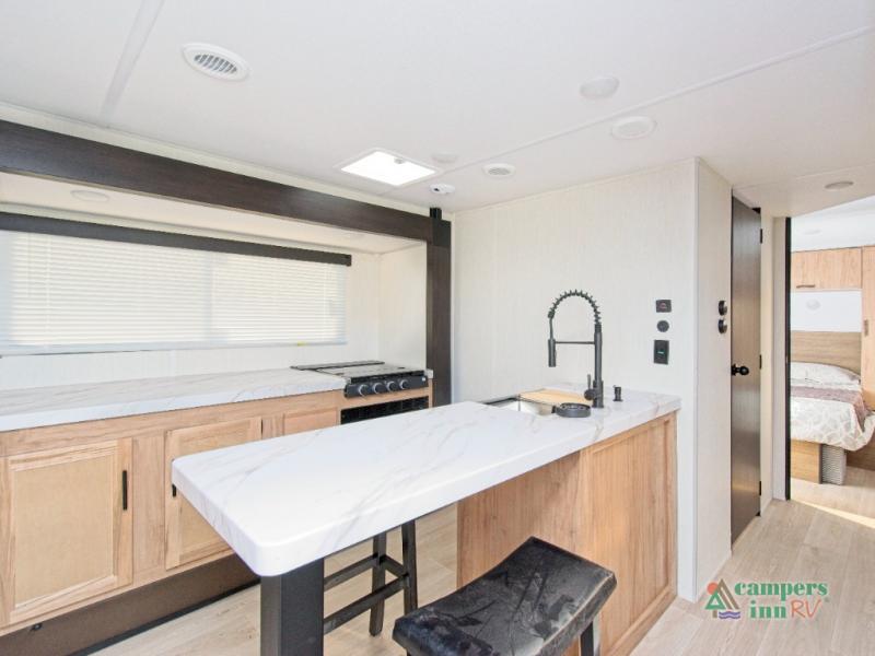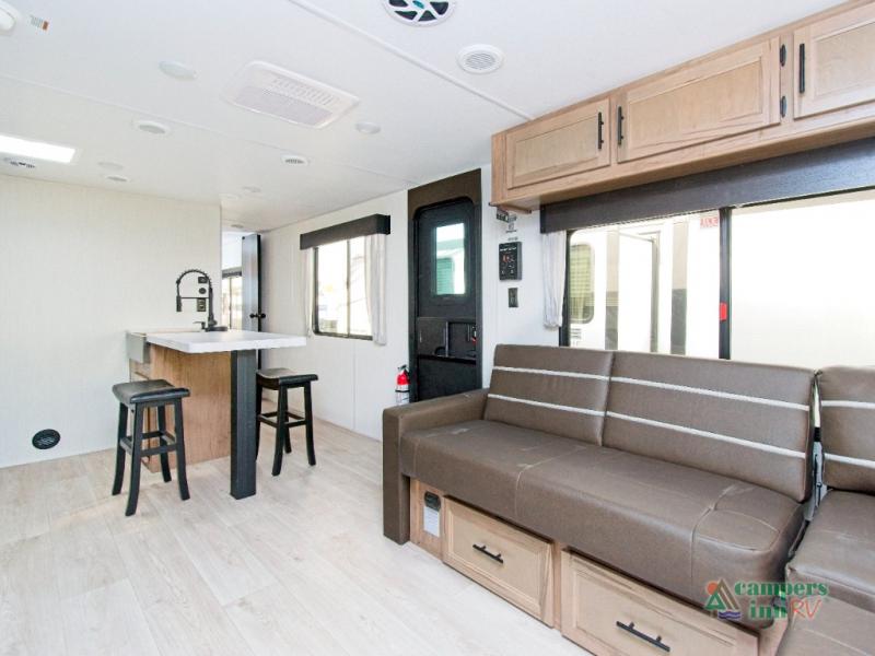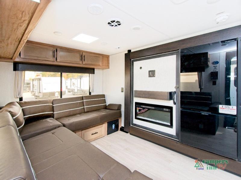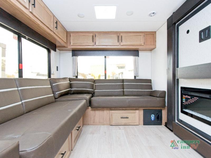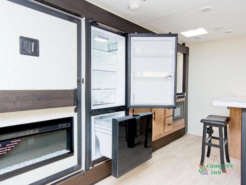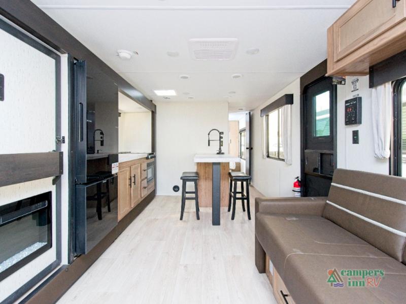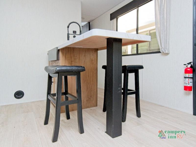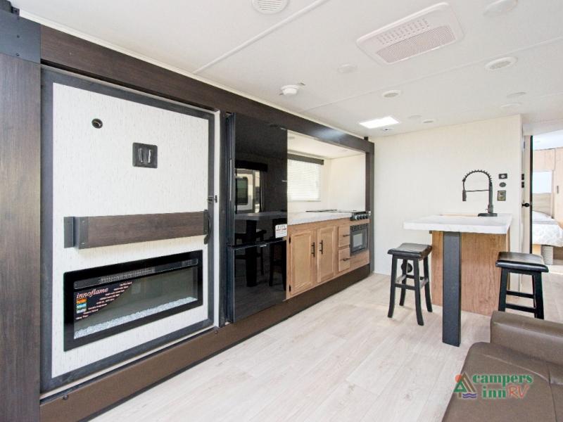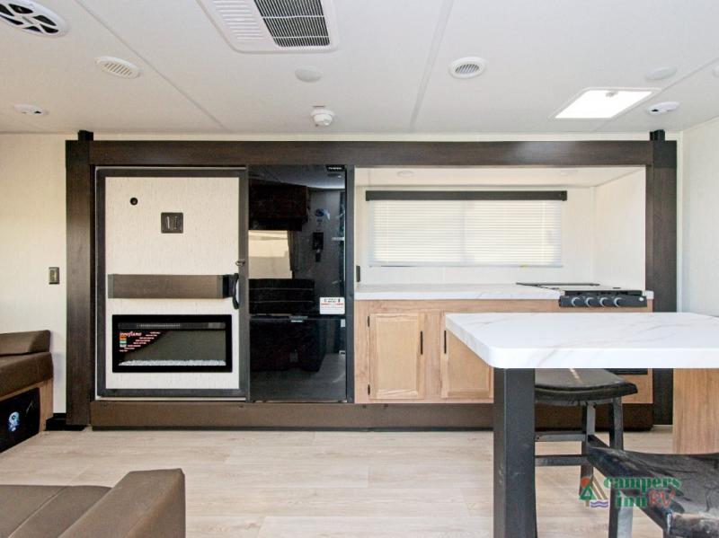 In the kitchen, you’ll find a premium setup with a 12V refrigerator, plenty of counter space, and an air fryer for quick, delicious meals. The fireplace creates a warm, inviting atmosphere, with a hidden pantry tucked behind it for added storage. Gather your family and friends in the comfortable living area, where the L-shaped sofa provides plenty of seating. The island peninsula adds even more prep space, complete with two bar stools for casual dining or chatting with the chef.