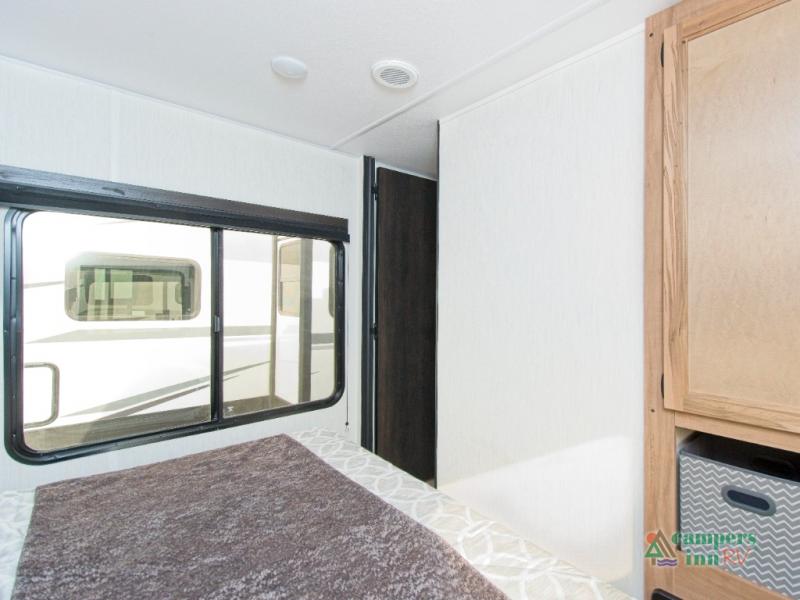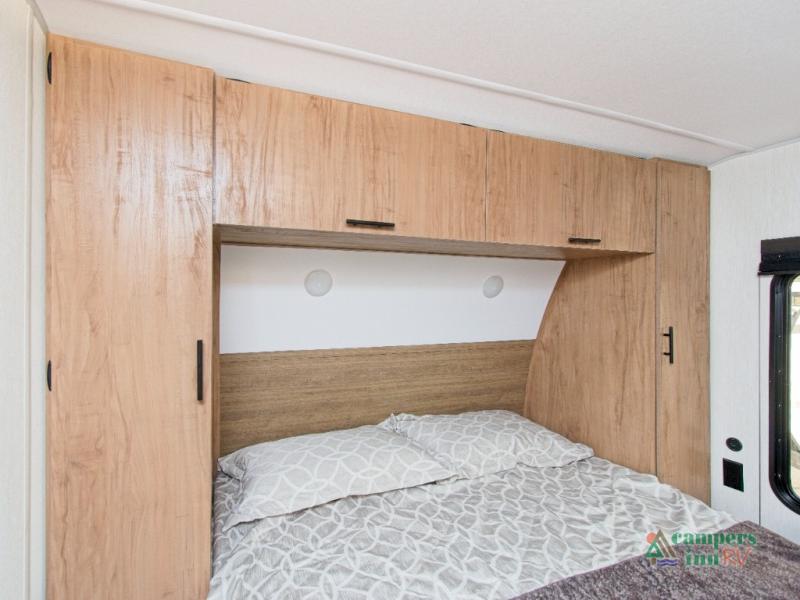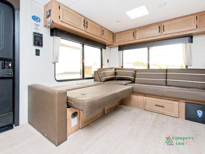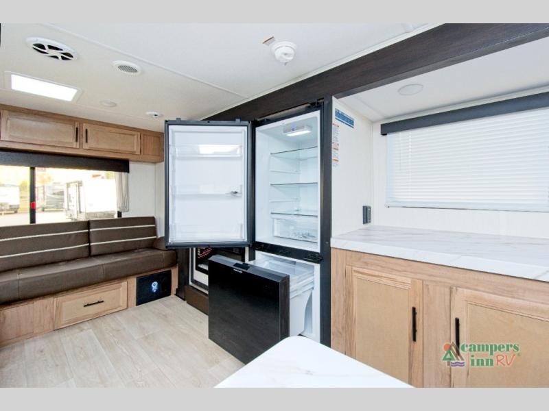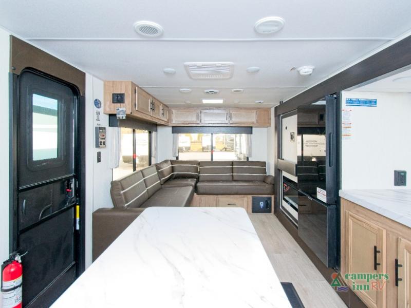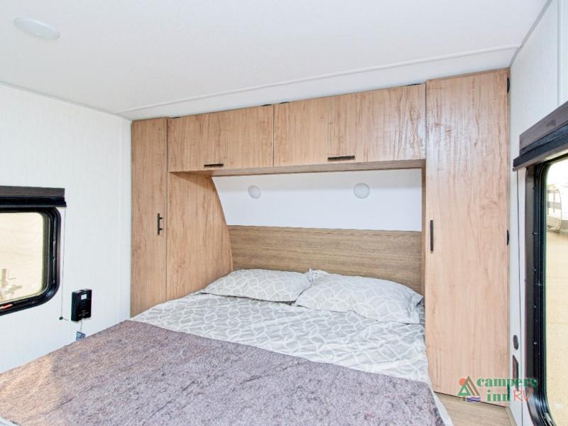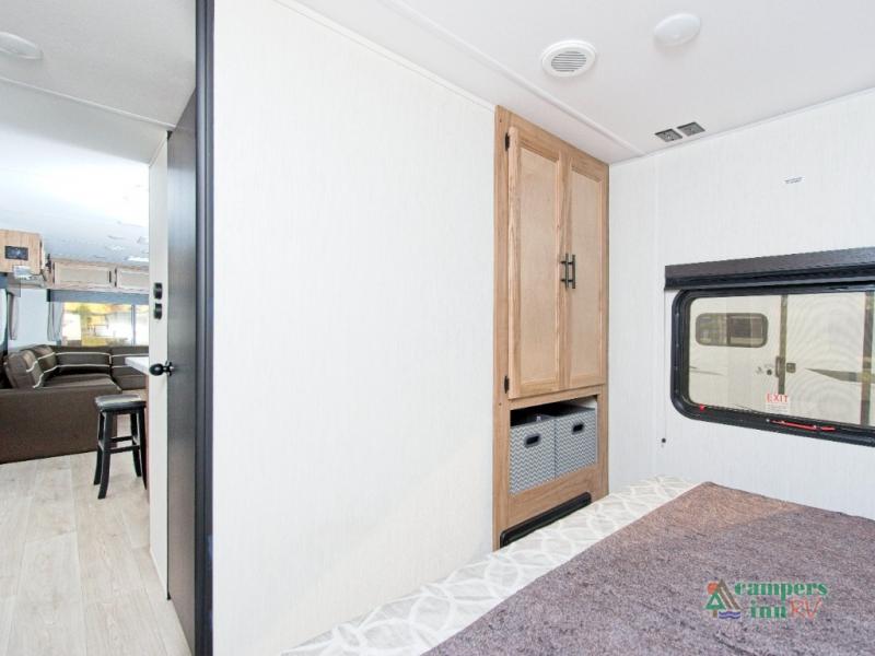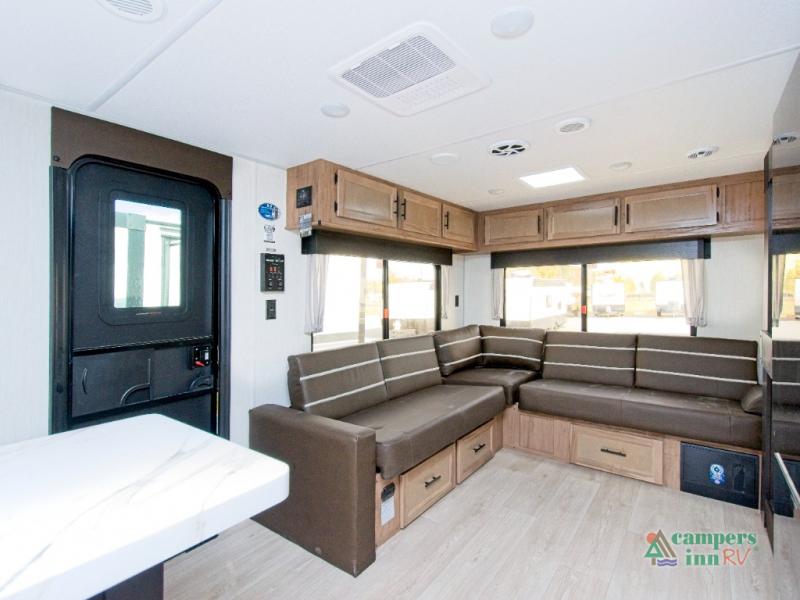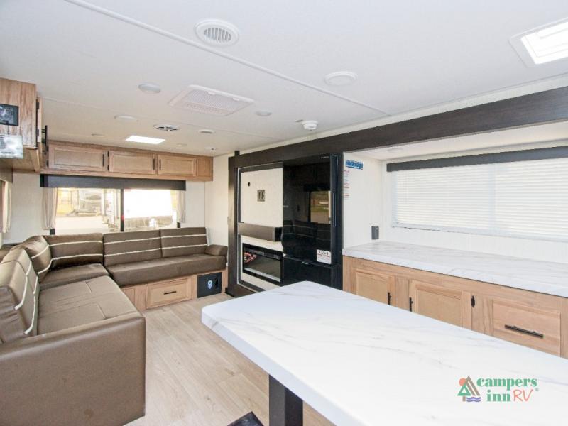 In the kitchen, you’ll find a premium setup with a 12V refrigerator, plenty of counter space, and an air fryer for quick, delicious meals. The fireplace creates a warm, inviting atmosphere, with a hidden pantry tucked behind it for added storage. Gather your family and friends in the comfortable living area, where the L-shaped sofa provides plenty of seating. The island peninsula adds even more prep space, complete with two bar stools for casual dining or chatting with the chef.