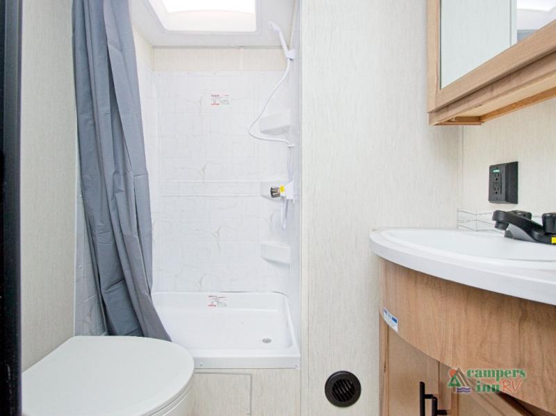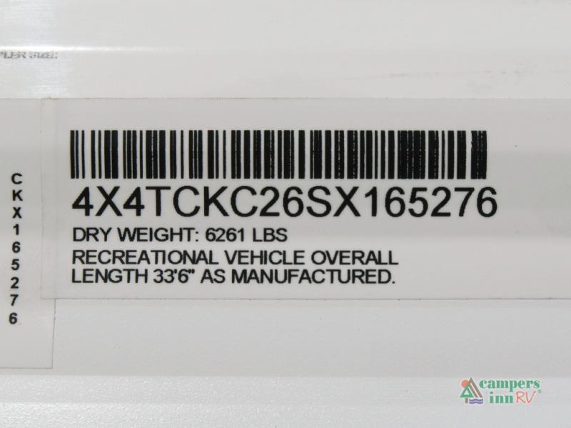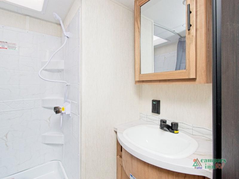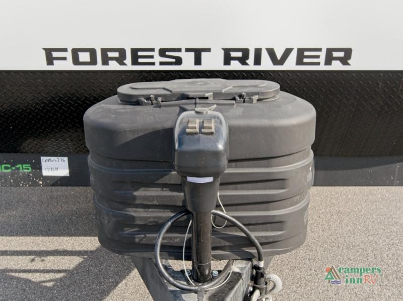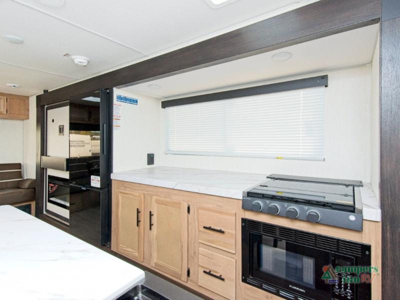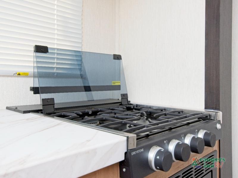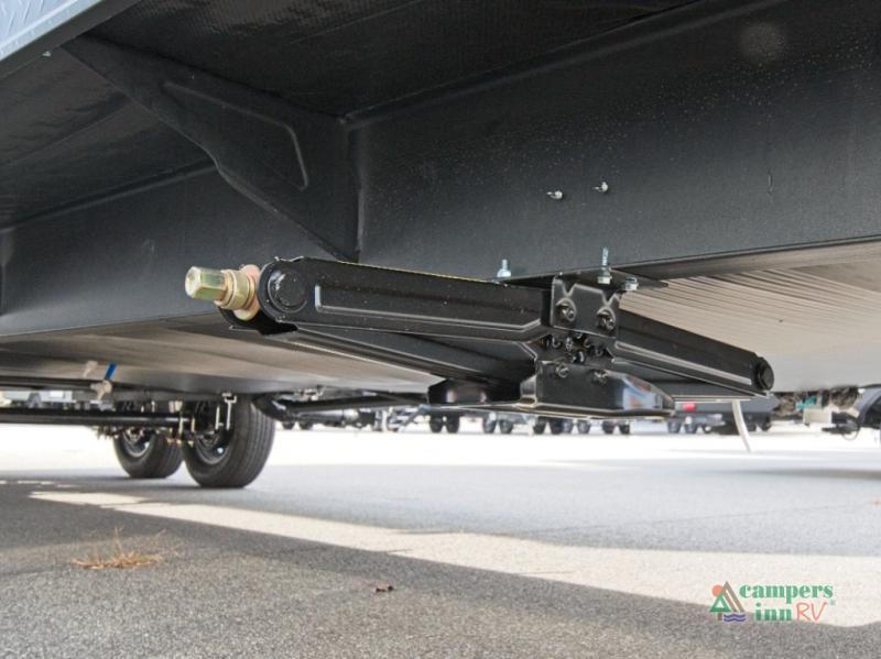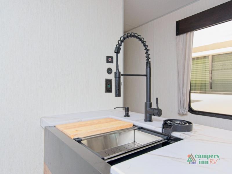 Inside, the stainless steel kitchen suite and premium bedding ensemble with comforter create a luxurious, home-like feel. The trailer also features a black waste tank flush-out kit, outside shower with hot and cold water, and an armored underbelly tank enclosure for year-round comfort and protection. Plus, enjoy the convenience of an RV grill quick connect for easy outdoor cooking.