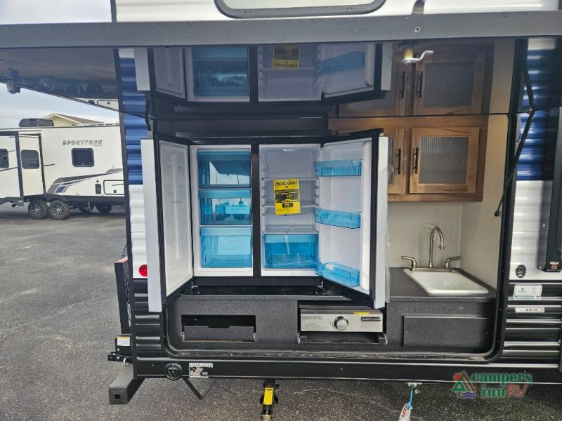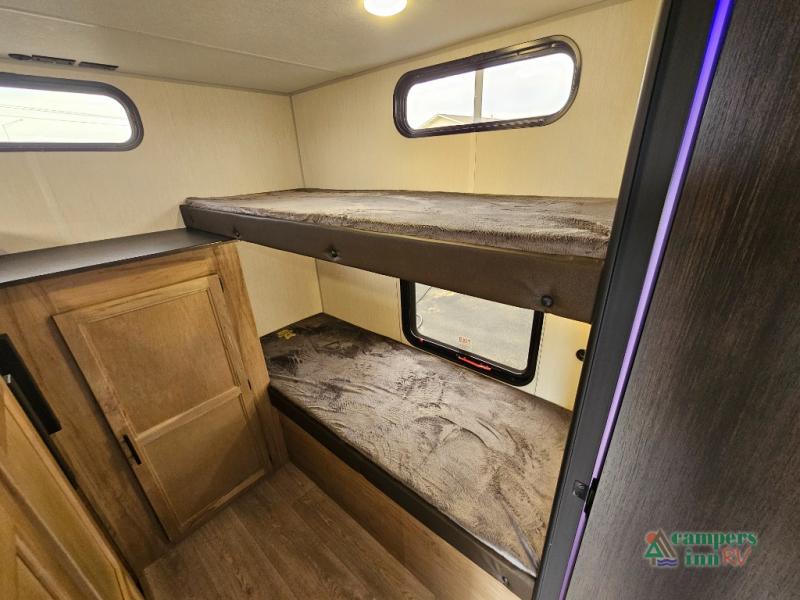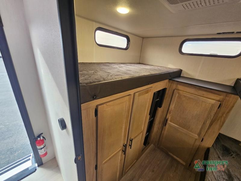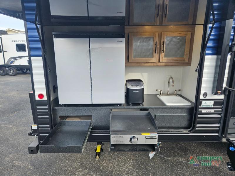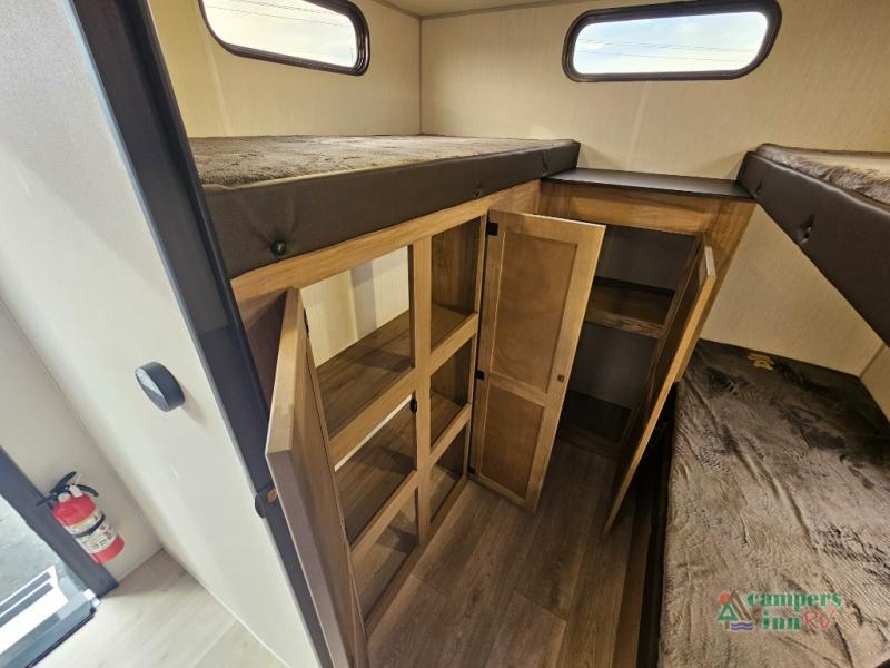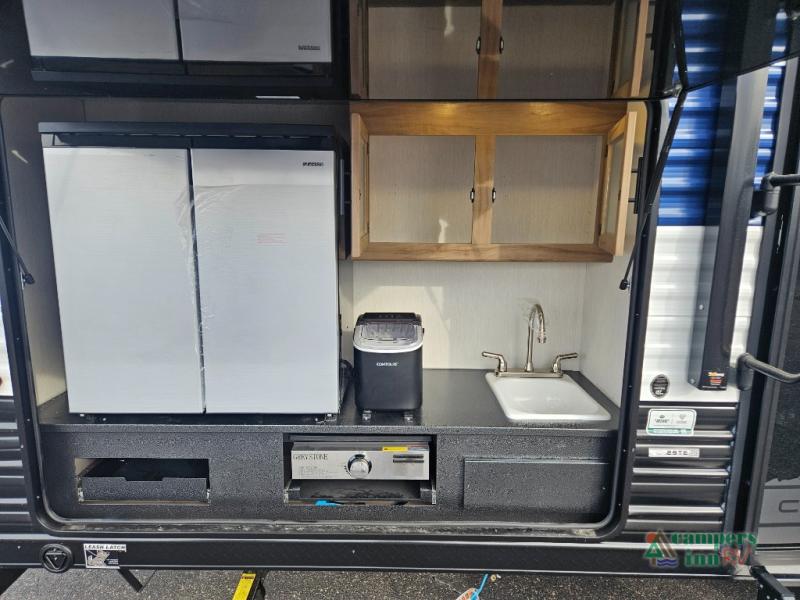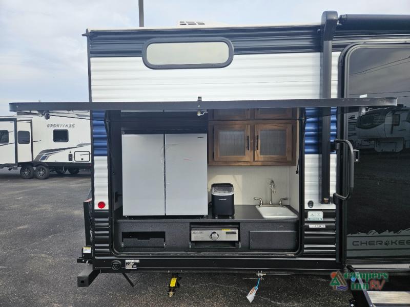 Your larger family will love spending weekends away with this Cherokee Grey Wolf travel trailer as their home away from home. This model offers lots of sleeping space with three bunk beds in the rear private bunkhouse. In the front, there is a master suite with wardrobes and nightstands on either side of the RV king bed, and it even has private access to the dual-entry bath. The two entry doors will make accessing the trailer easy for everyone, and you will appreciate the abundant storage throughout this unit including large overhead cabinets, a spacious pantry, and numerous outside storage compartments for all of your outdoor gear. There's even an outside bar & grill!