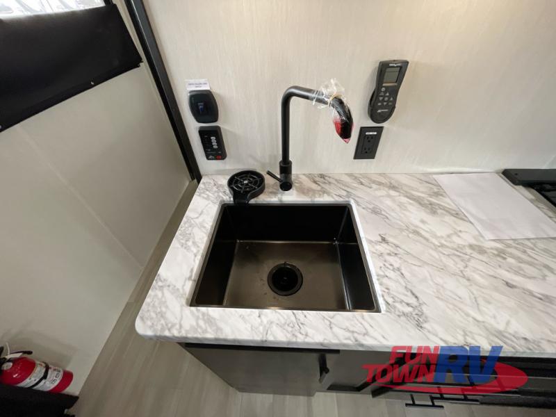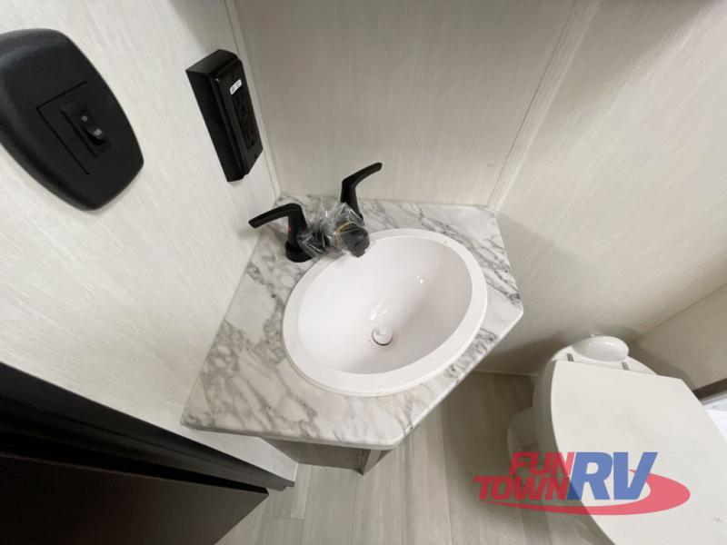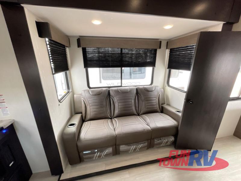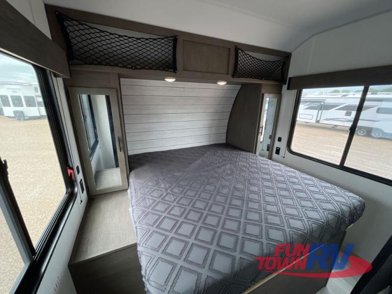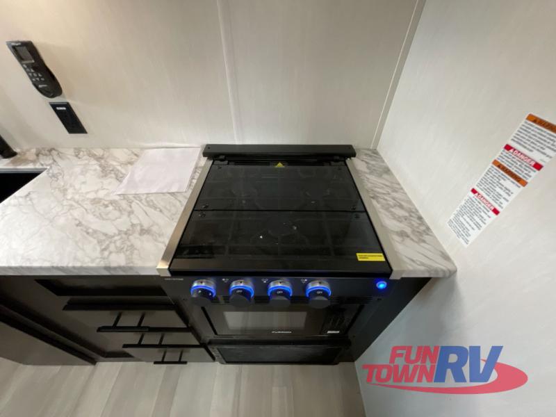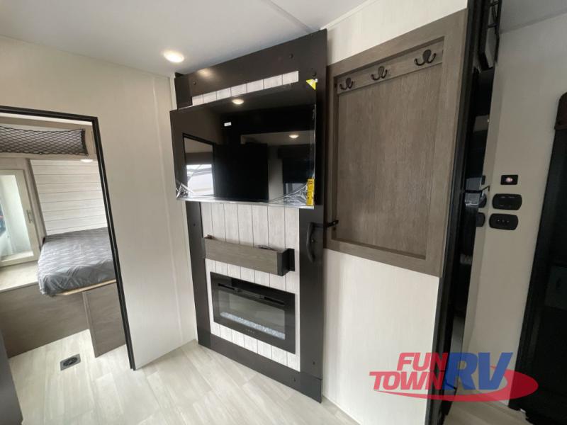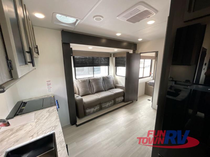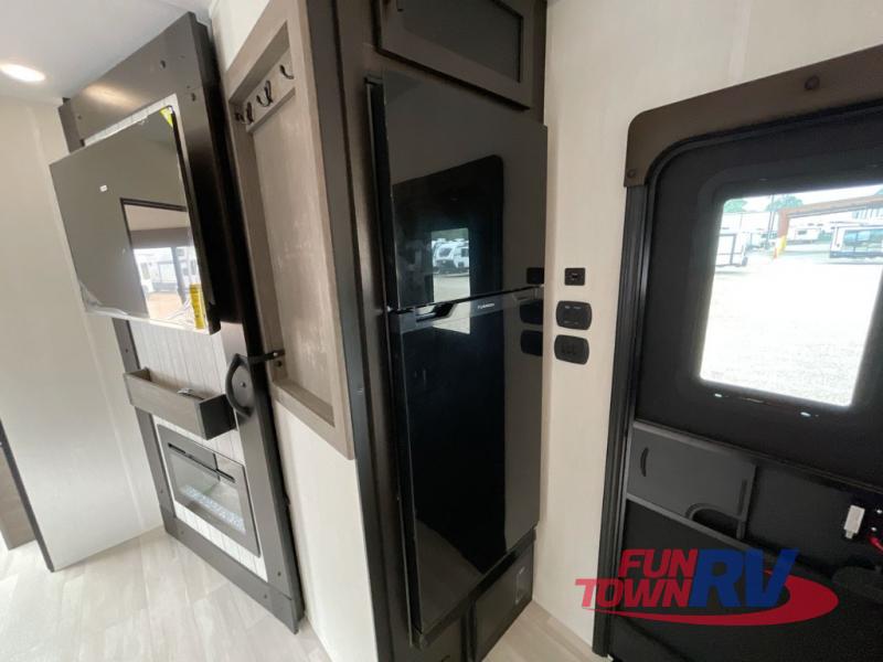 You can't go wrong in this spacious toy hauler with a 12' 6" garage! There is a flip-up counter with stools where you can eat each day, or you can take your plate outdoors to eat under the 21' power awning. The combined kitchen and living area includes a sofa slide out, appliances to make meals each day, and an entertainment center with a fireplace. There is also a pantry and drawers hidden behind the TV for smart storage spaces. The king bed is sure to provide a great night's rest, and there are dual nightstands and dual wardrobes to keep your things tidy.