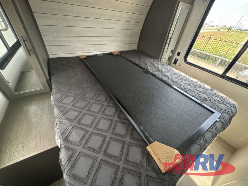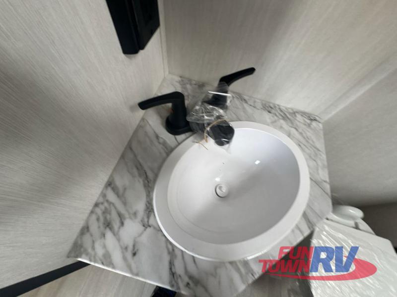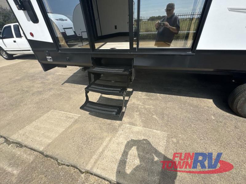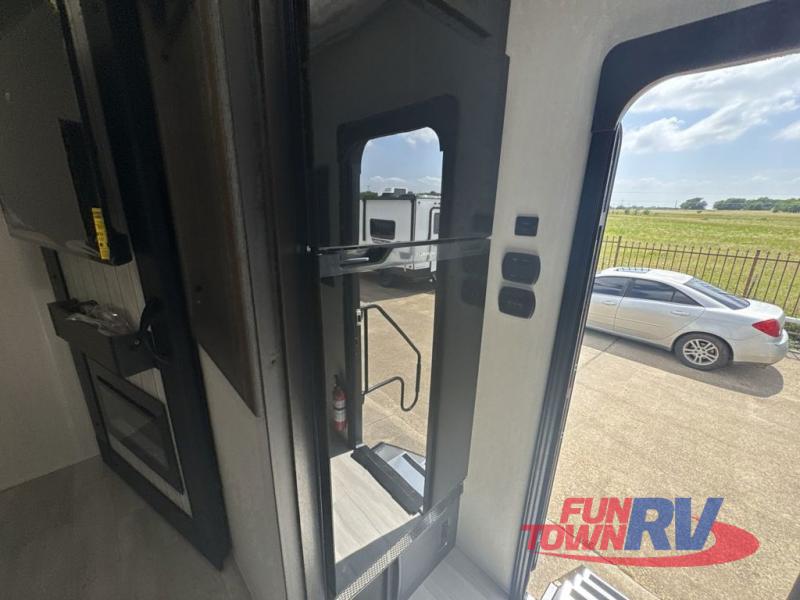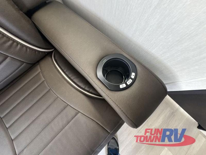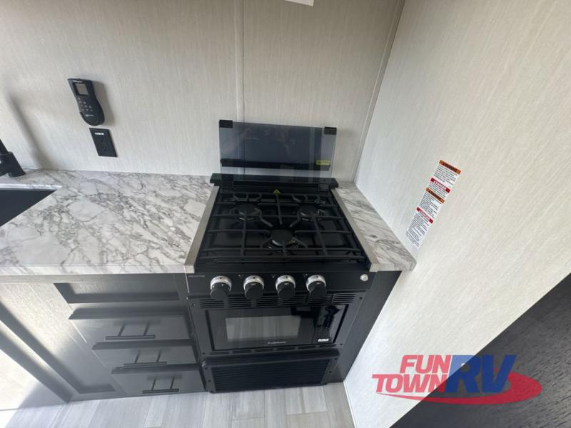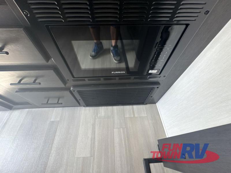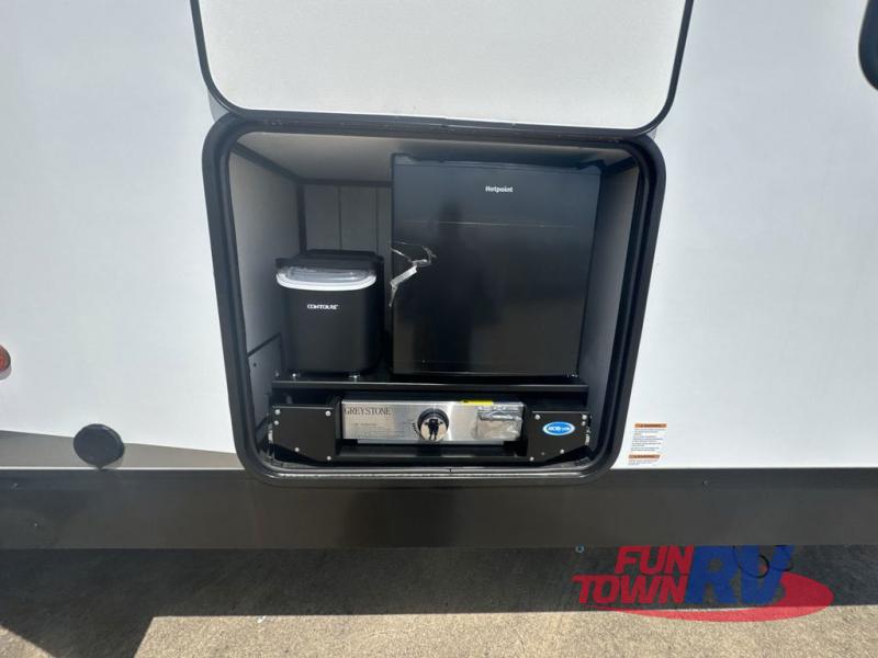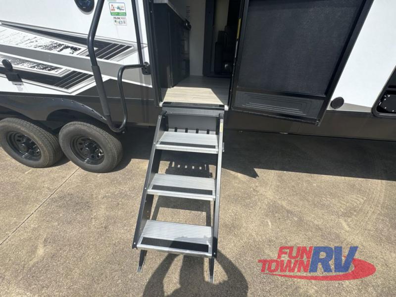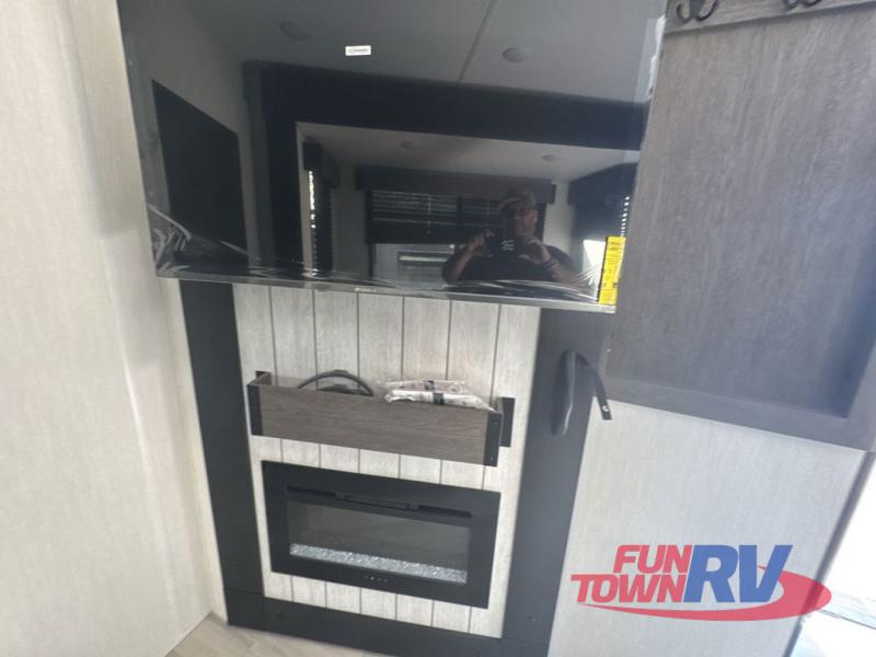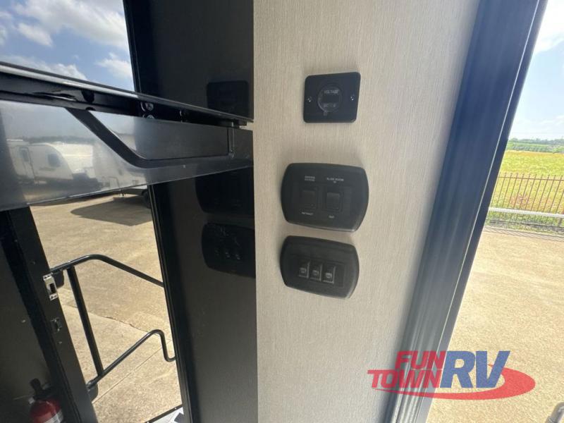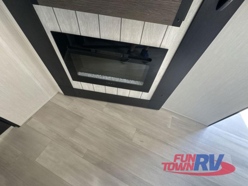 You can't go wrong in this spacious toy hauler with a 12' 6" garage! There is a flip-up counter with stools where you can eat each day, or you can take your plate outdoors to eat under the 21' power awning. The combined kitchen and living area includes a sofa slide out, appliances to make meals each day, and an entertainment center with a fireplace. There is also a pantry and drawers hidden behind the TV for smart storage spaces. The king bed is sure to provide a great night's rest, and there are dual nightstands and dual wardrobes to keep your things tidy.