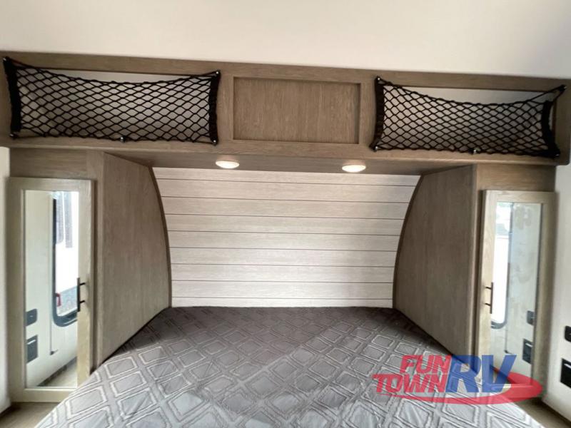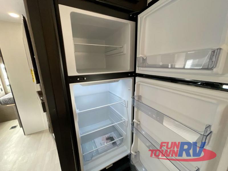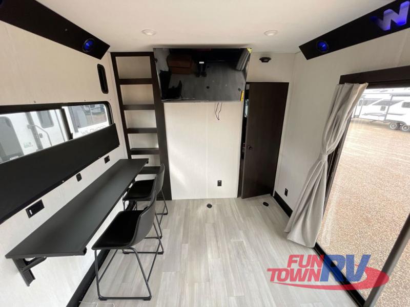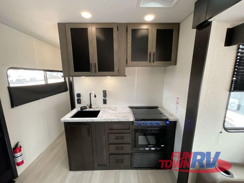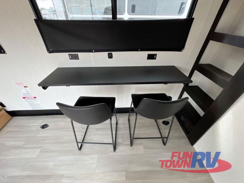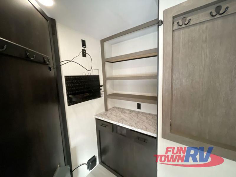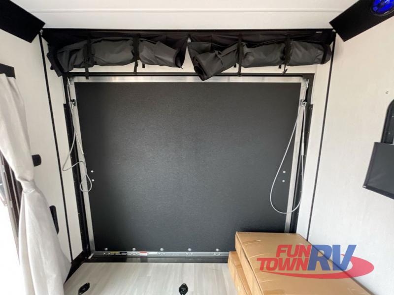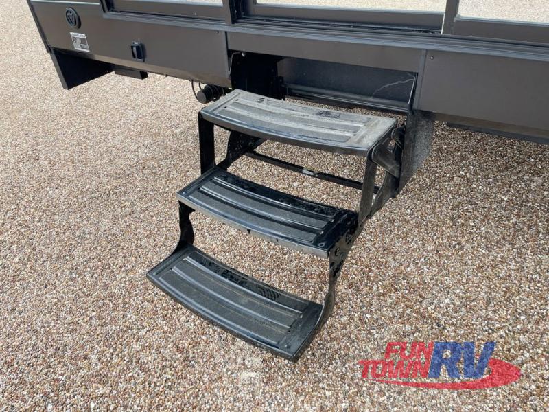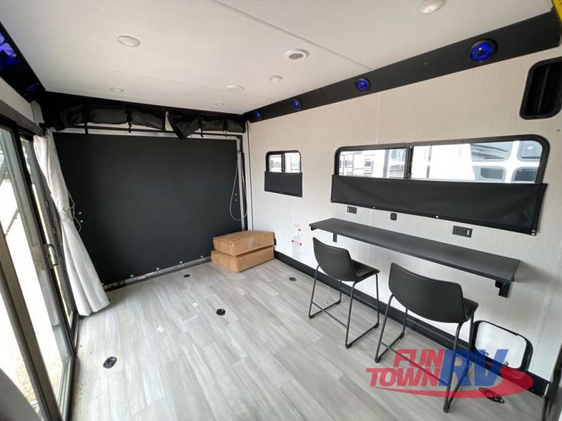 You can't go wrong in this spacious toy hauler with a 12' 6" garage! There is a flip-up counter with stools where you can eat each day, or you can take your plate outdoors to eat under the 21' power awning. The combined kitchen and living area includes a sofa slide out, appliances to make meals each day, and an entertainment center with a fireplace. There is also a pantry and drawers hidden behind the TV for smart storage spaces. The king bed is sure to provide a great night's rest, and there are dual nightstands and dual wardrobes to keep your things tidy.