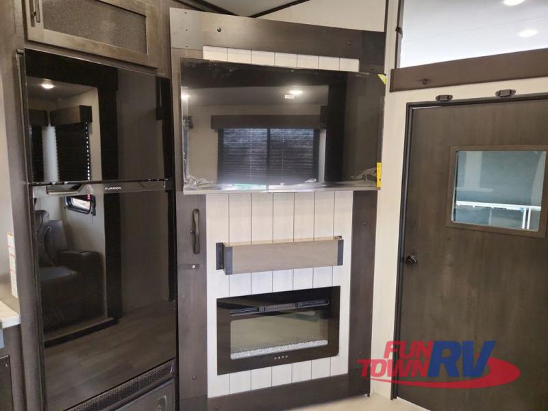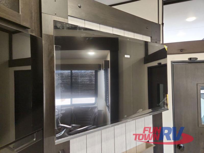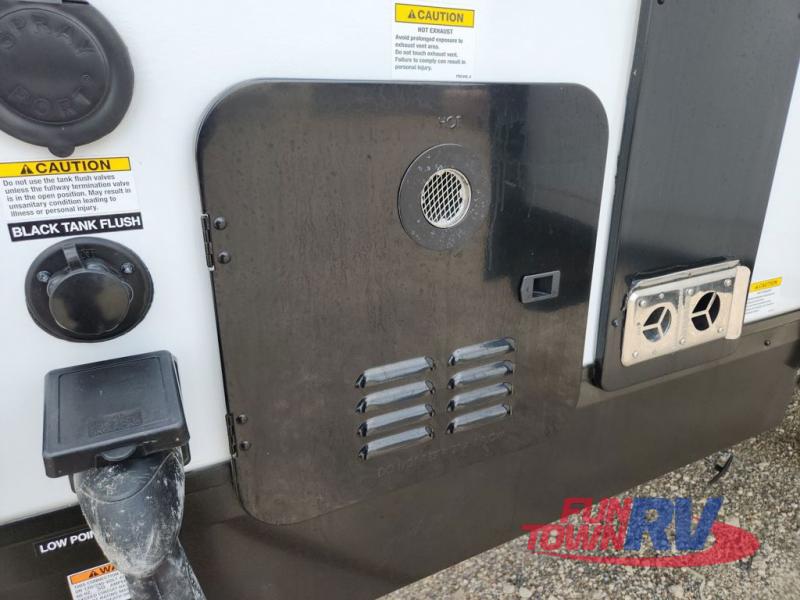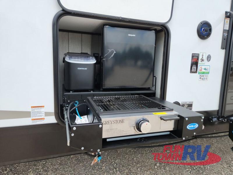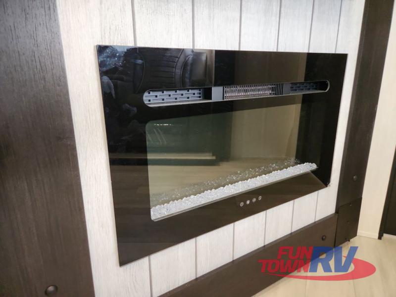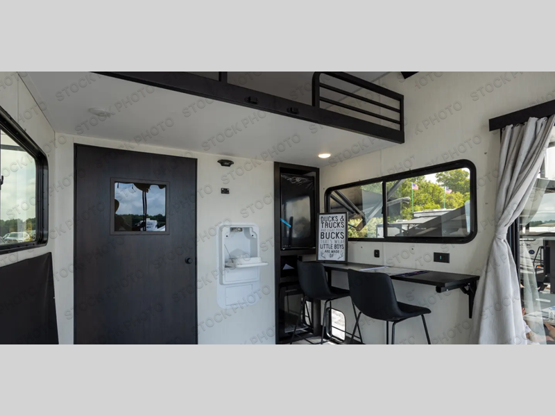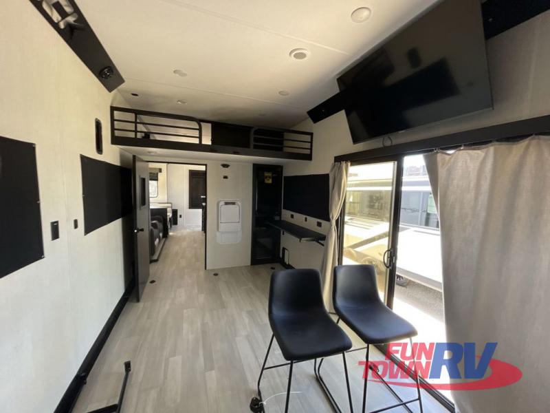 Fun at the campground begins with this dual entry toy hauler in tow! There is a 15' separate garage with glass patio doors, a loft above for guests, plus a patio deck to entertain guests. Your crew can get comfy on the theater seating or booth dinette, and there is an entertainment center with a fireplace and a hidden pantry for snacks. The chef of your group will love the full interior kitchen, along with an outdoor kitchen when the weather is nice. A full bath lets you freshen up after a trail ride, and the front private bedroom gives you your own space at night. This unit also features washer and dryer prep in the bedroom so you can add those appliances if you wish!