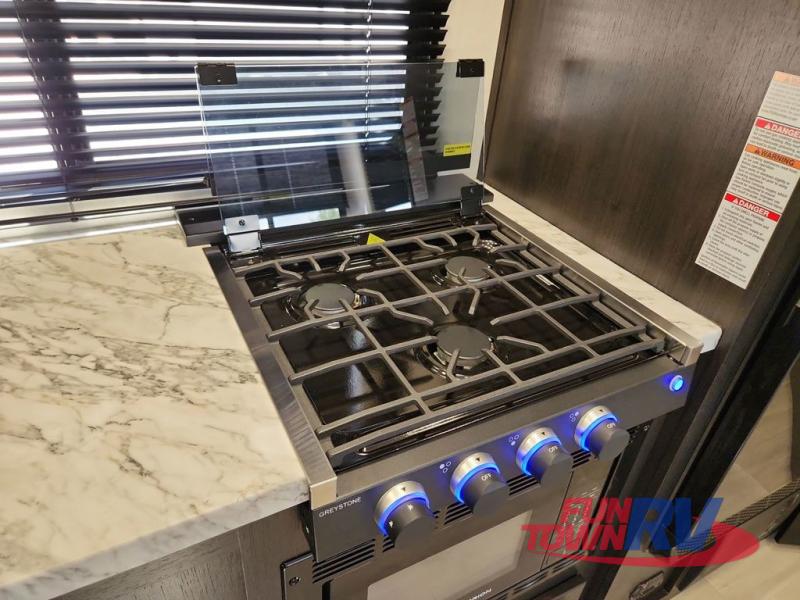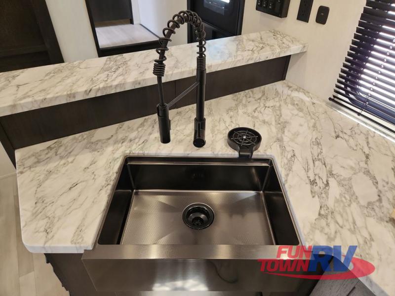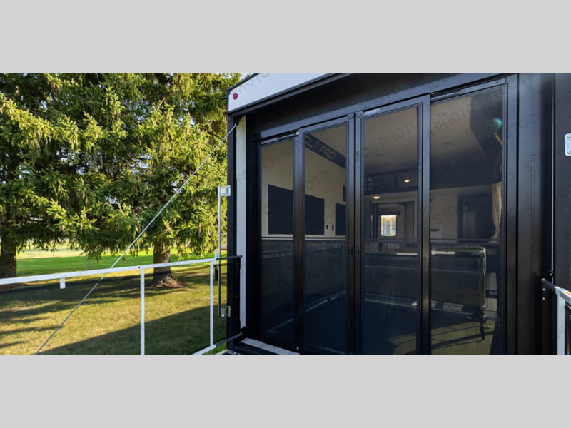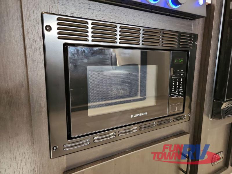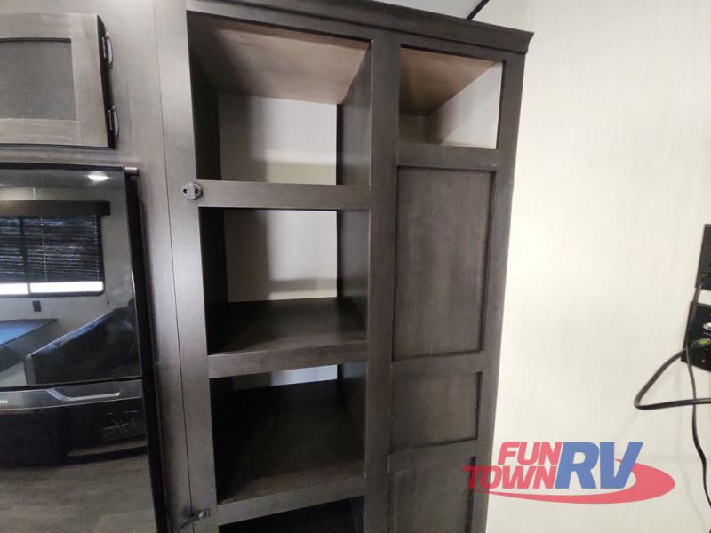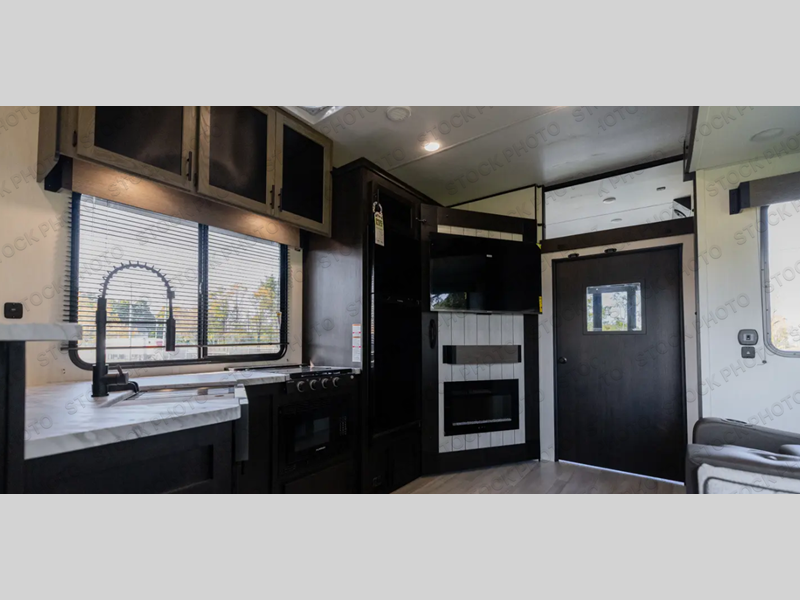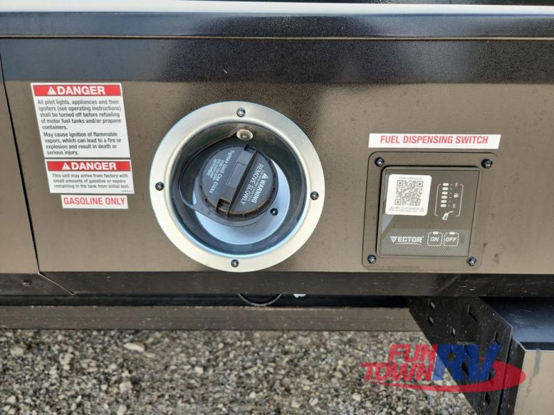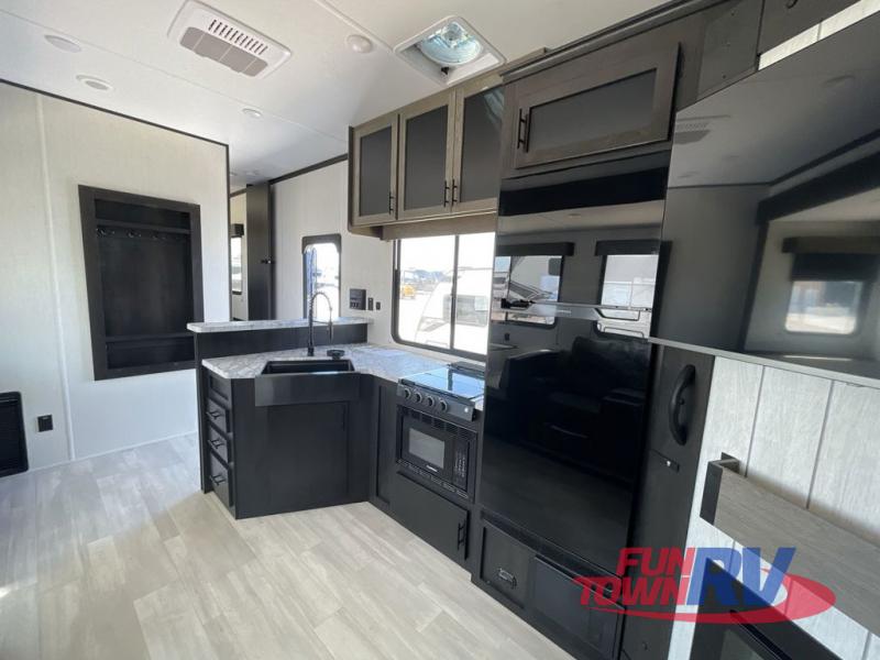 Fun at the campground begins with this dual entry toy hauler in tow! There is a 15' separate garage with glass patio doors, a loft above for guests, plus a patio deck to entertain guests. Your crew can get comfy on the theater seating or booth dinette, and there is an entertainment center with a fireplace and a hidden pantry for snacks. The chef of your group will love the full interior kitchen, along with an outdoor kitchen when the weather is nice. A full bath lets you freshen up after a trail ride, and the front private bedroom gives you your own space at night. This unit also features washer and dryer prep in the bedroom so you can add those appliances if you wish!