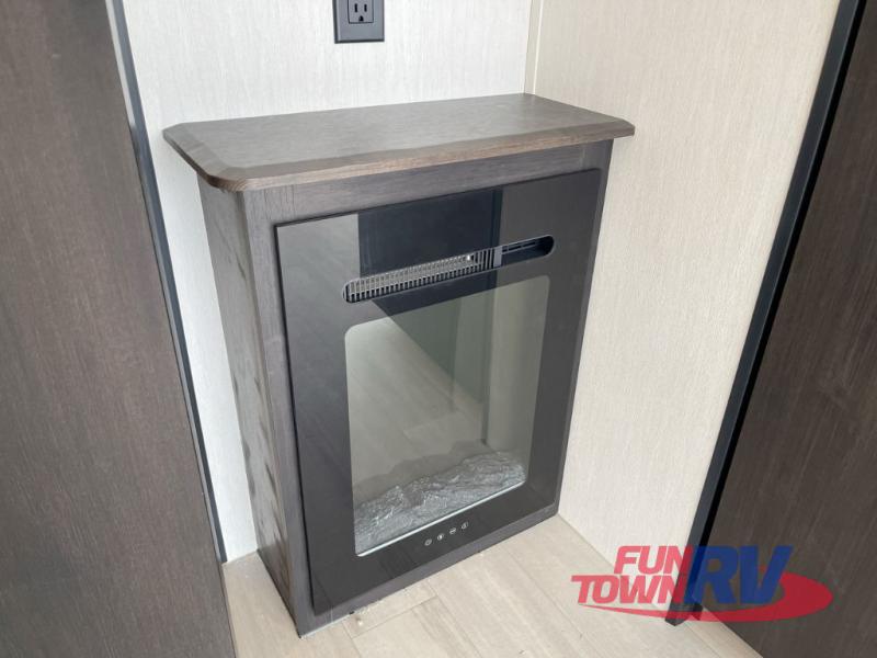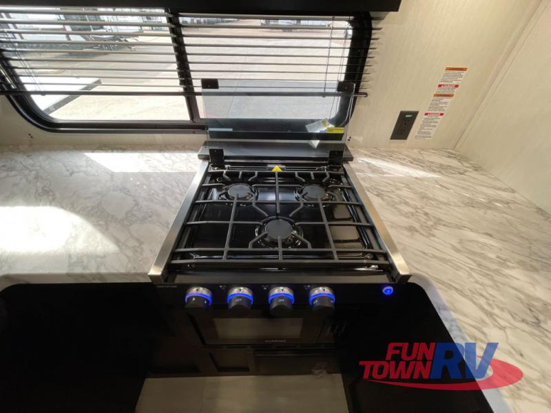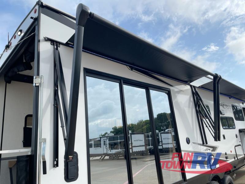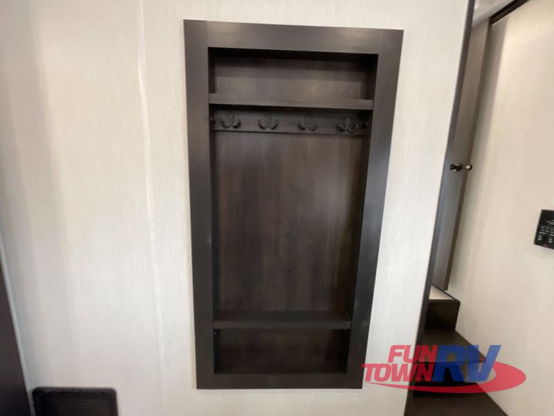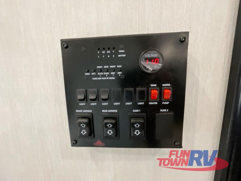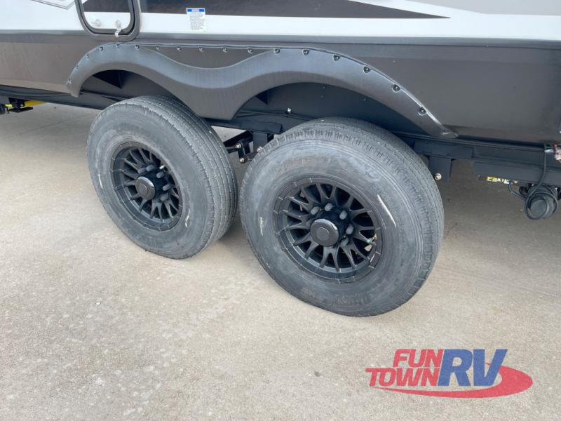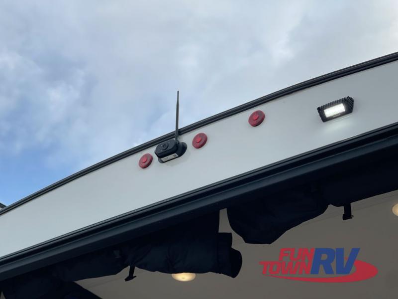 Fun at the campground begins with this dual entry toy hauler in tow! There is a 15' 6" separate garage with glass patio doors, a loft above for guests, a half bath with folding walls and a flip-down recessed bath sink. The combined kitchen and living room features a U-shaped kitchen with a flip-up countertop, a sofa slide out, and a bartop with two stools. There is even an outdoor kitchen on the other side of this counter so you can make breakfast as the sun comes up. A full bath lets you freshen up after a trail ride, and the front private bedroom gives you your own space at night. This unit also features washer and dryer prep in the bedroom so you can add those appliances if you wish!