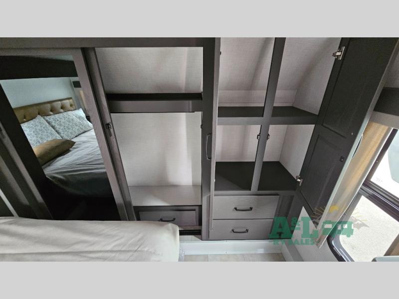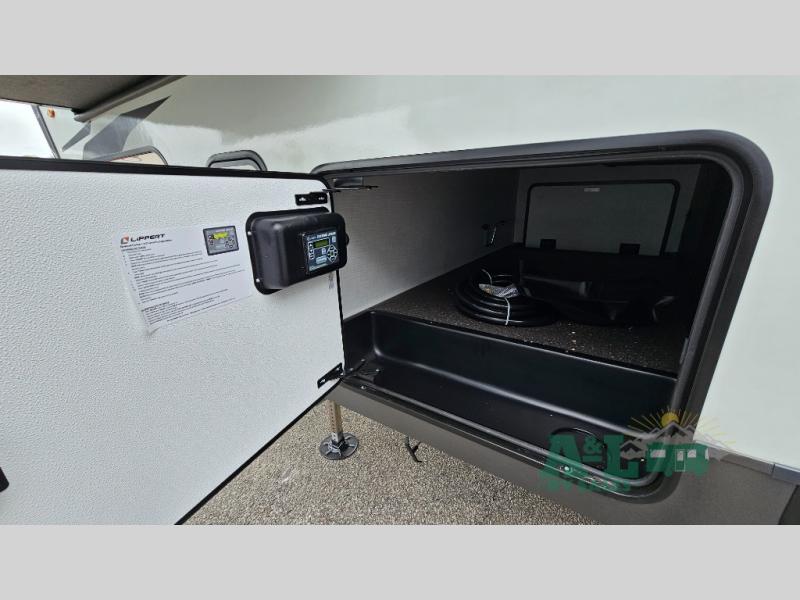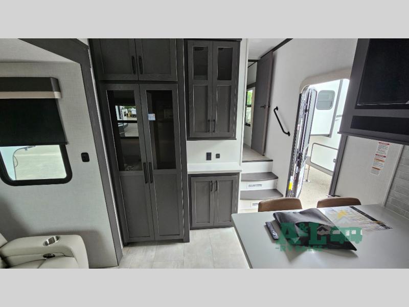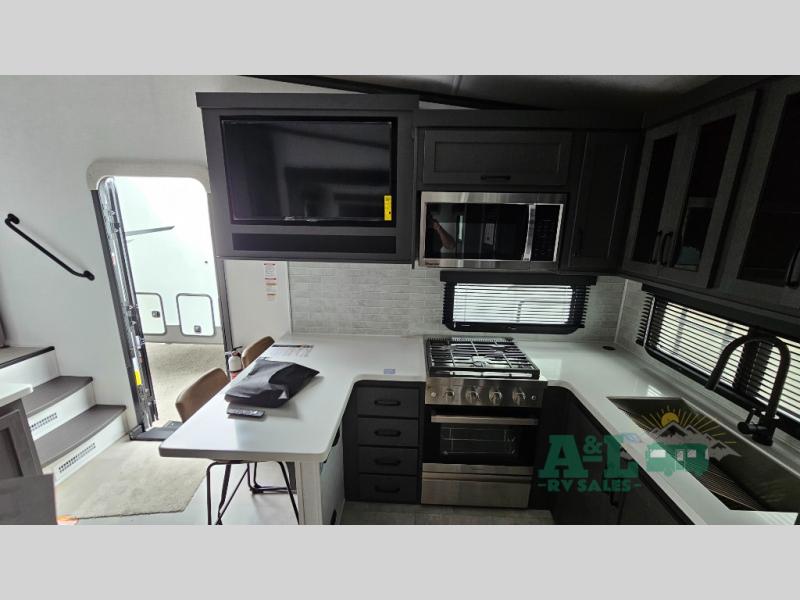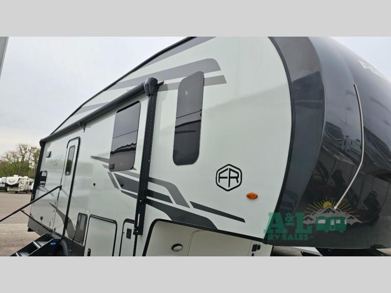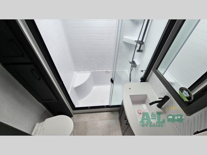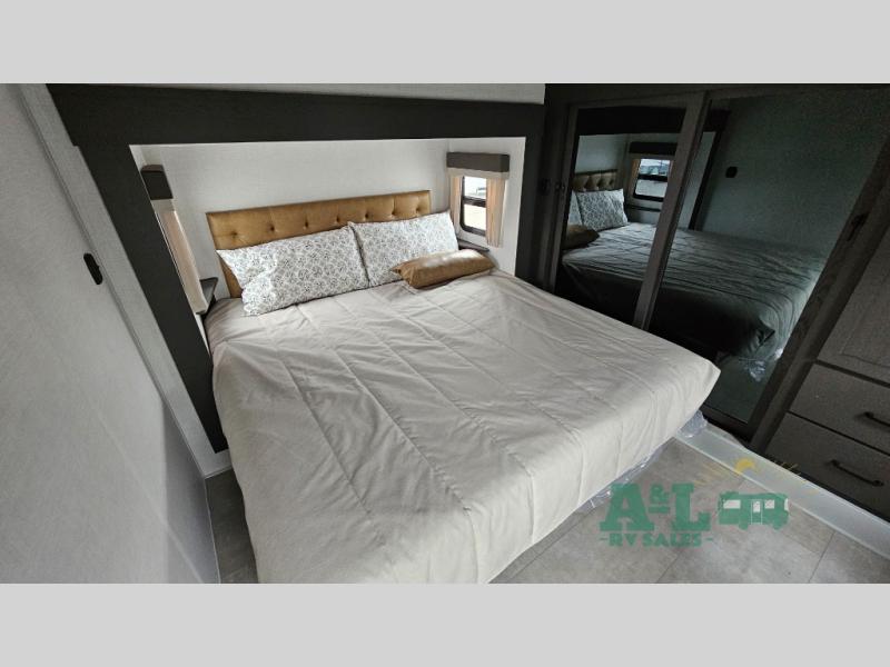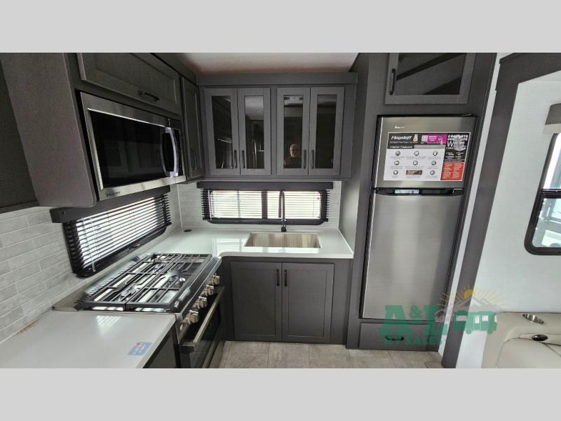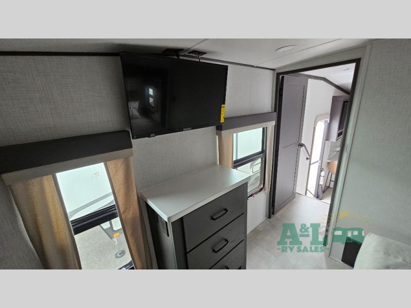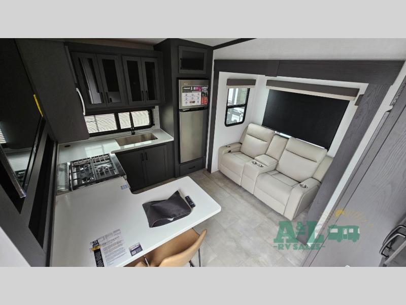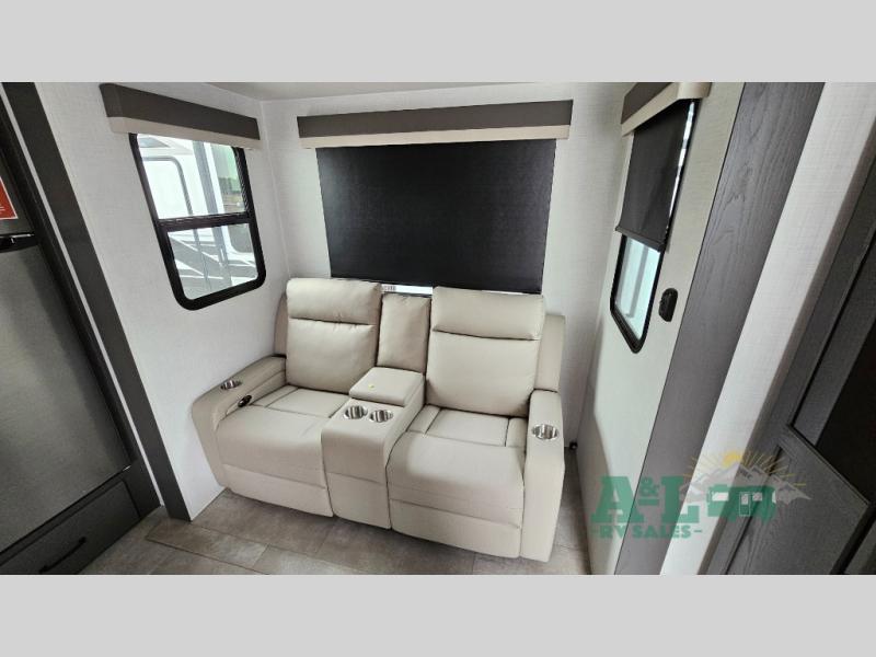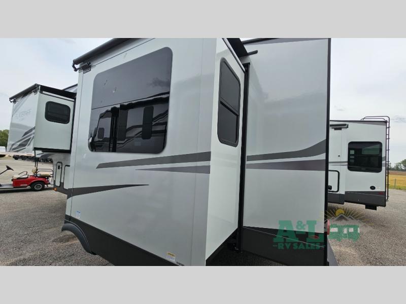 Camp in comfort with your favorite person or your friends in this spacious bedroom and bathroom fifth wheel! From the shower with a seat and linen storage to the slide out queen bed or choose a king option, you will feel right at home. The bedroom also offers a dresser, a front wardrobe with shelves, and an optional TV.  The main living area provides a hide-a-bed sofa that sleeps two, a rear kitchen with a 11 cu. ft. refrigerator to store lots of food, and a bar top with seating to dine at. You can watch the Smart TV before going to bed or each morning, and the 20' awning gives you even more living space outdoors protected from the outside elements.