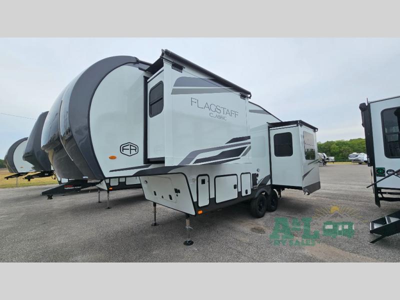 Each one of these Forest River Flagstaff Classic fifth wheels or travel trailers will be your home on wheels! Their quality craftsmanship and attention to detail shines through the surface-coated steel I-beam frame on fifth wheels, the enclosed underbelly, the radius roof with vaulted interior ceilings, and six-sided fully aluminum-framed floor, walls, and roof. Towing your unit will be easy with the torsion axle, Rubber-Ryde suspension, and nitrogen-filled Goodyear Endurance tires. You will even reduce your use of water with the Showermiser water saving system in the bathroom. A few other convenient features you will enjoy include a control panel with WeRV app control, designer headboard and bedding, and an outside hot and cold water port. Come choose your favorite one today!