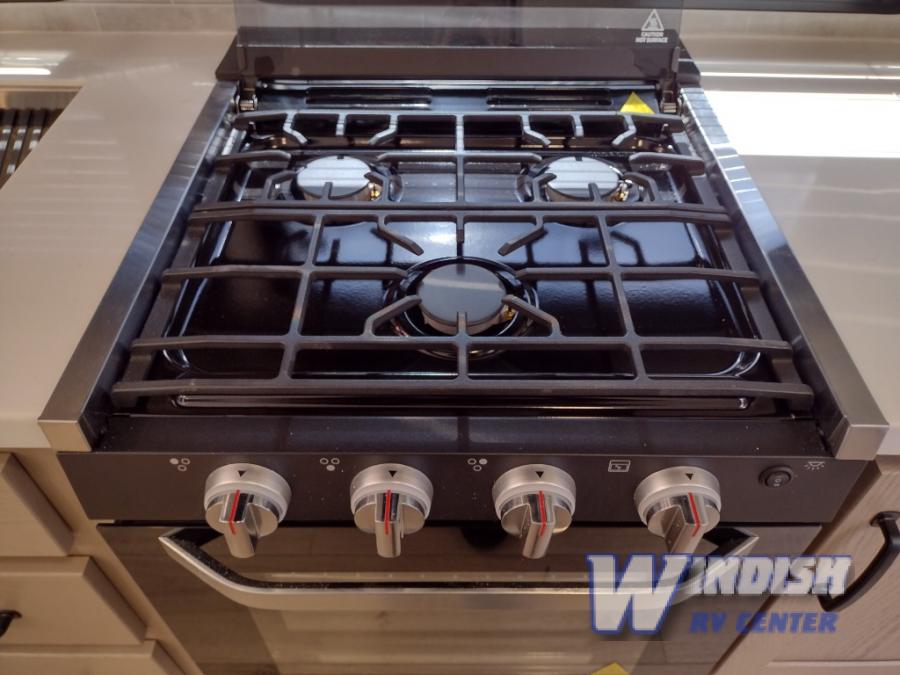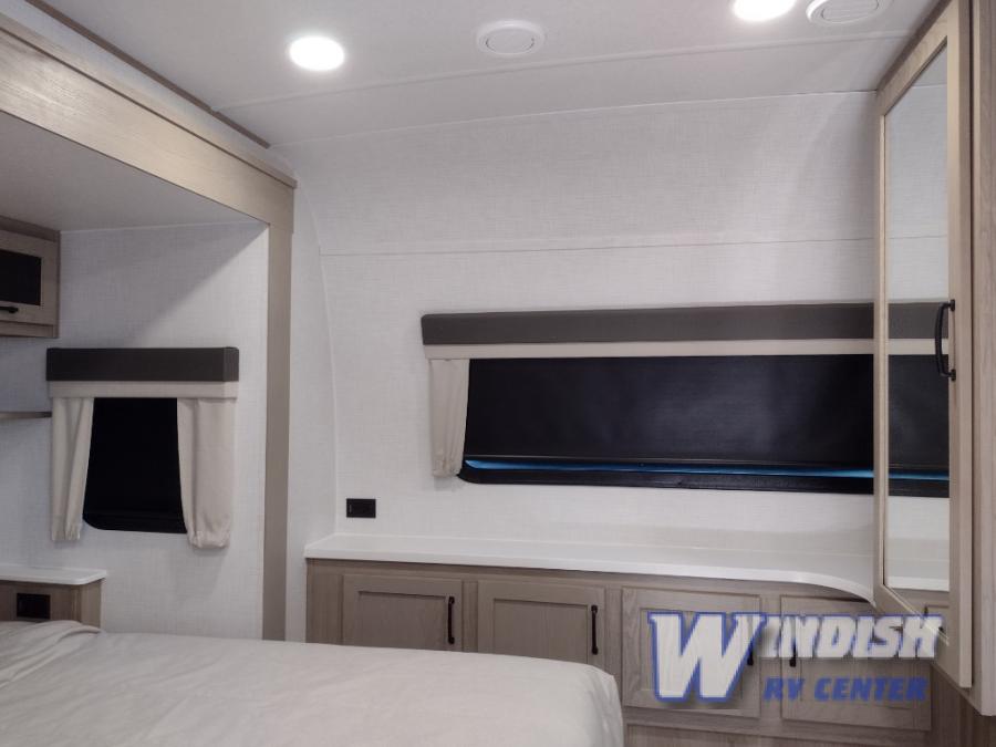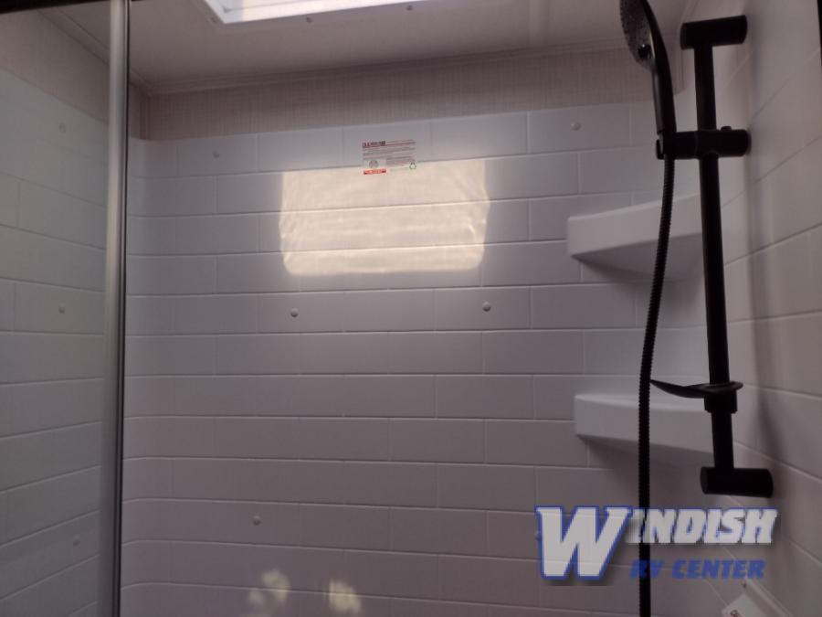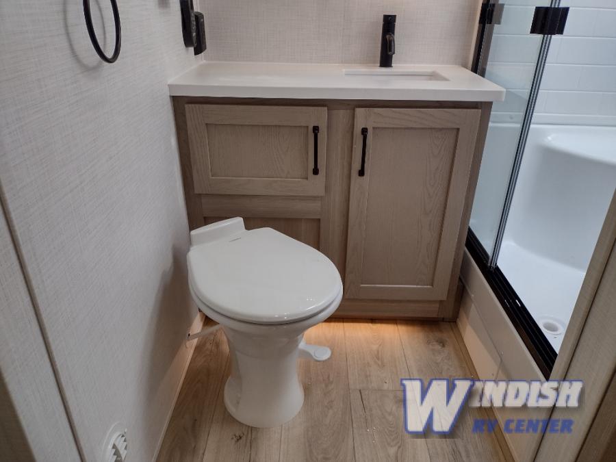 This travel trailer is the perfect couples coach to get away featuring dual slides for added interior space. The main entry leads into a combined kitchen and living room providing an L-shaped counter with two-person bar top seating! This is a great place to enjoy your meals and morning coffee inside. Your nights will be spent in true relaxation with the 67" theater seating to watch TV, and a king bed slide in the front bedroom for a great night's rest. The full rear bathroom features a shower with a seat plus overhead skylight, and linen storage. You can also choose to cook outdoors when you have an outside kitchen, plus a 22' awning. This creates a nice outdoor living area that is perfect both day and night!