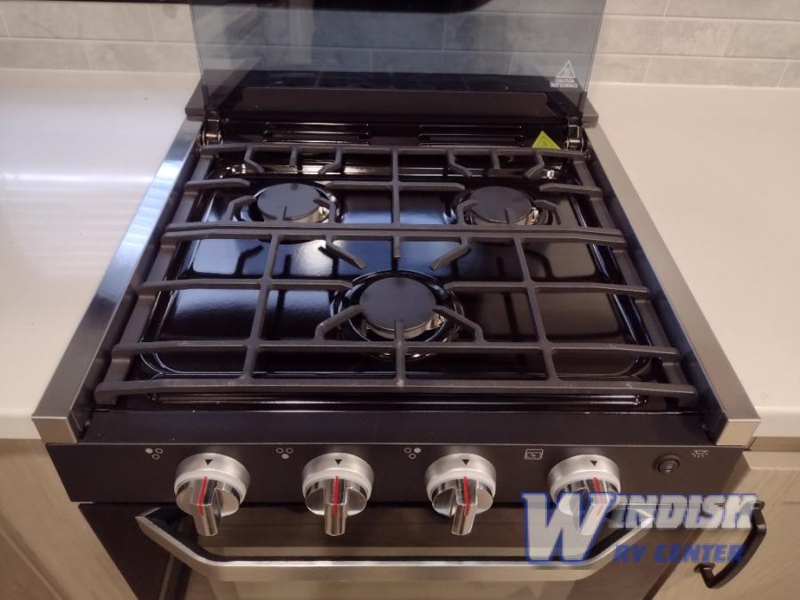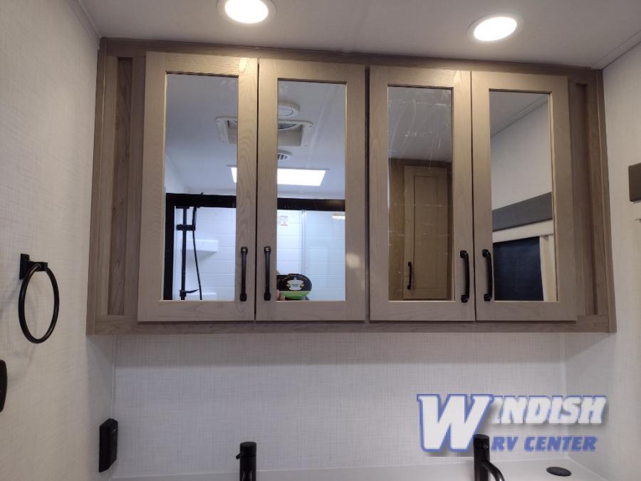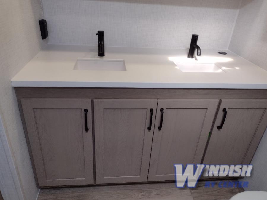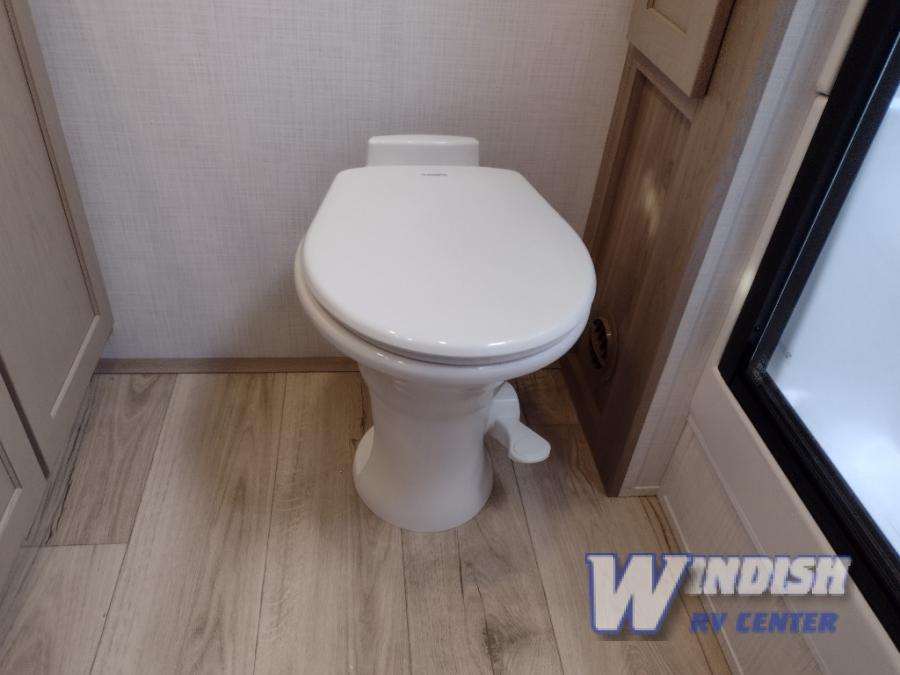 You will love how open this travel trailer will feel with the large front window that you can look out from the two-person bar top seating! The front kitchen has plenty of countertop space for you to prepare your best meals. Your nights will be spent in true relaxation with a 67" theater seating and king bed slide in the bedroom for a great night's rest. The full rear bathroom has a shower with a seat to take a nice, hot shower before bed, and a dual-sink vanity for two to get ready at once in the mornings!