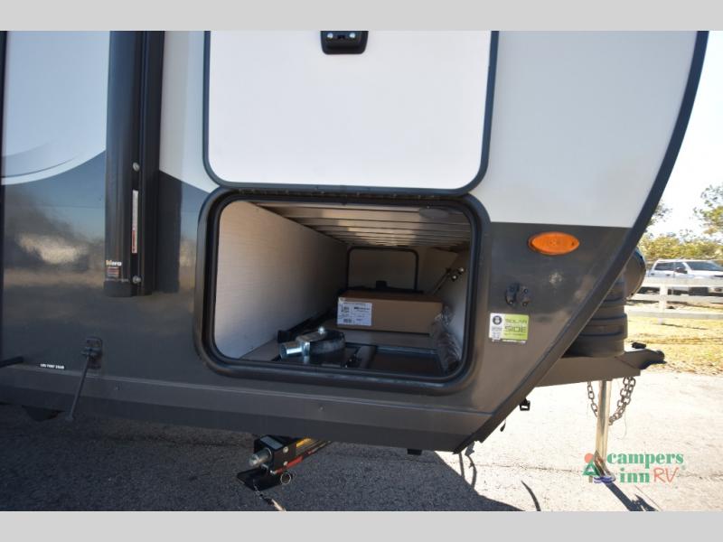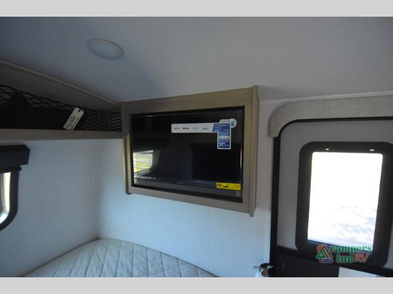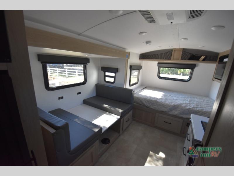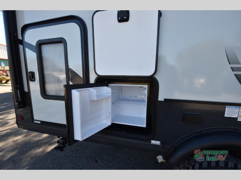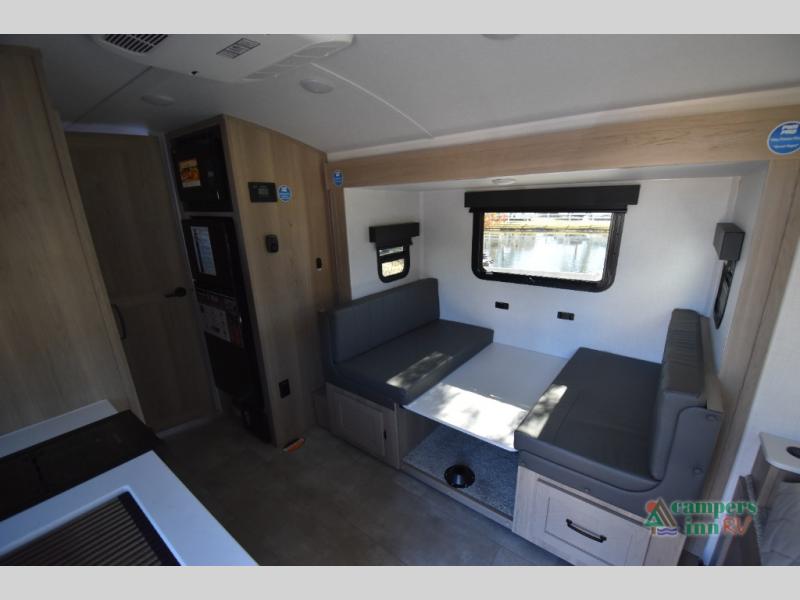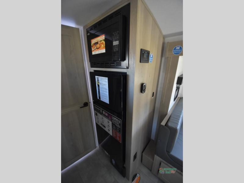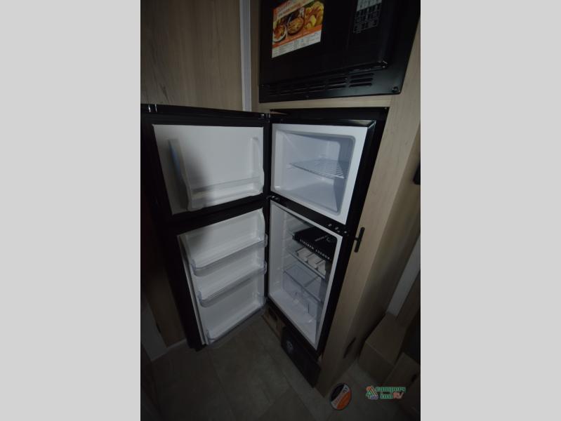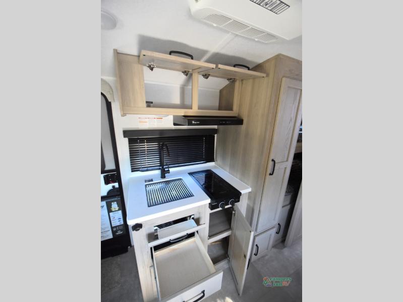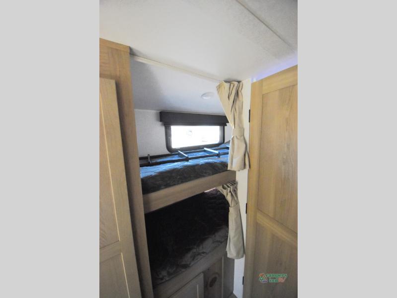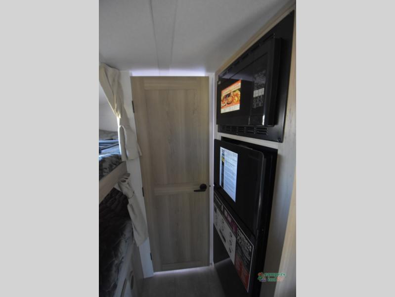 This spacious bunk trailer will work perfectly for a family or friend group that enjoys their own sleeping space, plus more floor space with the dinette slide out that can sleep one to two. The bottom bunk even flips up so you can stow away your bikes, totes and such through the bike door for secure travels. There is exterior storage for more outdoor gear, and interior storage found throughout. The cook will love having a pantry and overhead cabinets for snacks, canned goods, dishes and more. After making a warm meal, the 12V refrigerator can hold the leftovers. There is also a flip-down lavy sink in the full bath for added space when not in use!