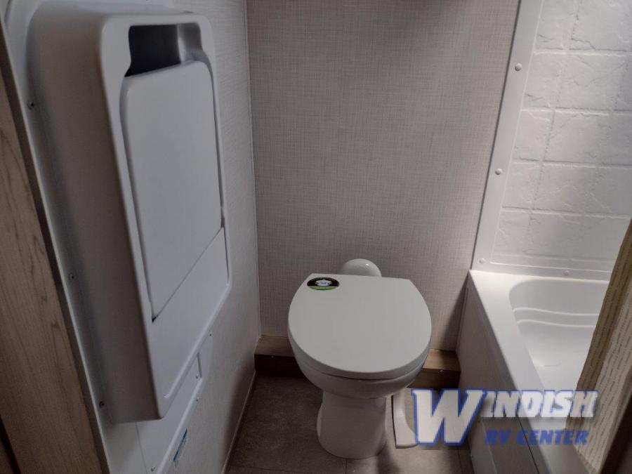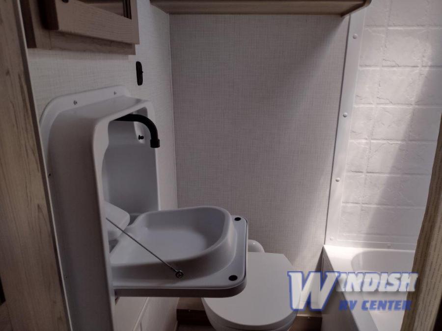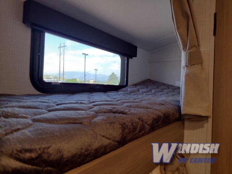 This spacious bunk trailer will work perfectly for a family or friend group that enjoys their own sleeping space, plus more floor space with the dinette slide out that can sleep one to two. The bottom bunk even flips up so you can stow away your bikes, totes and such through the bike door for secure travels. There is exterior storage for more outdoor gear, and interior storage found throughout. The cook will love having a pantry and overhead cabinets for snacks, canned goods, dishes and more. After making a warm meal, the 12V refrigerator can hold the leftovers. There is also a flip-down lavy sink in the full bath for added space when not in use!