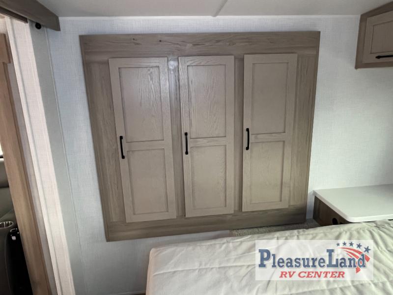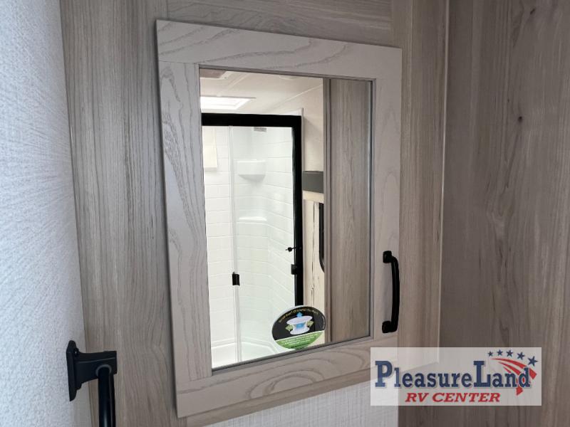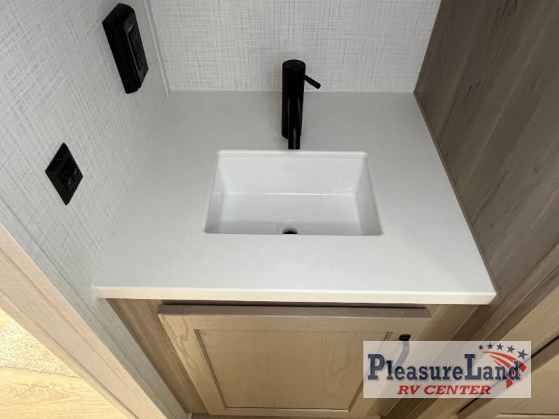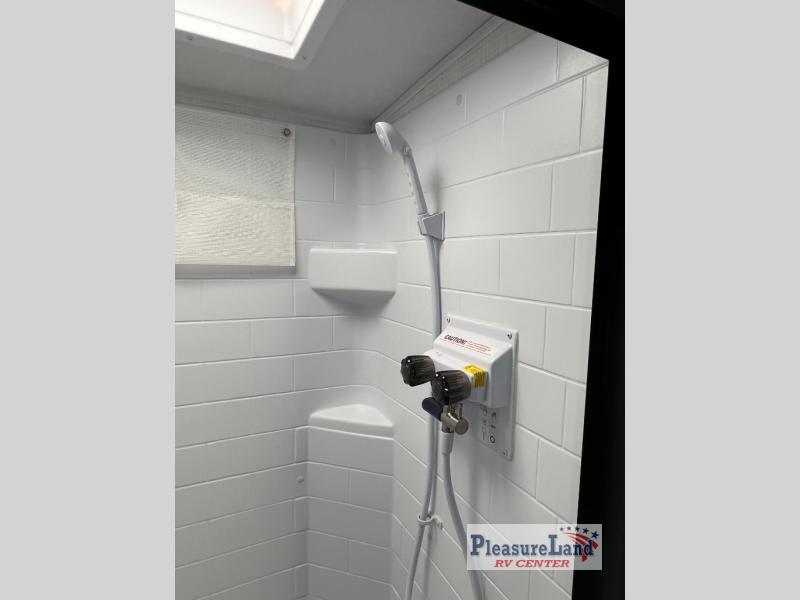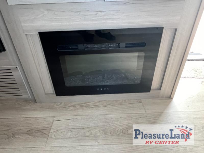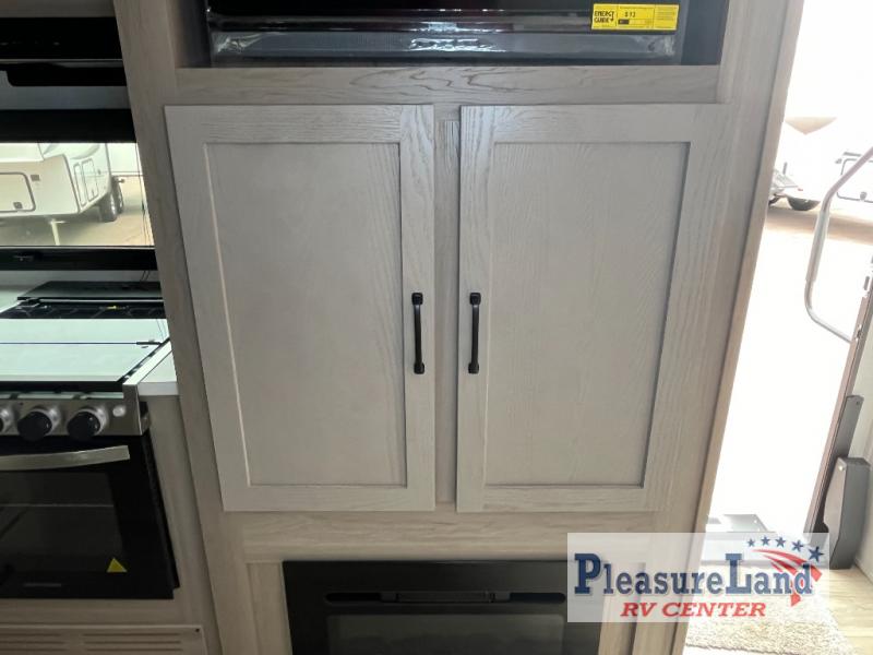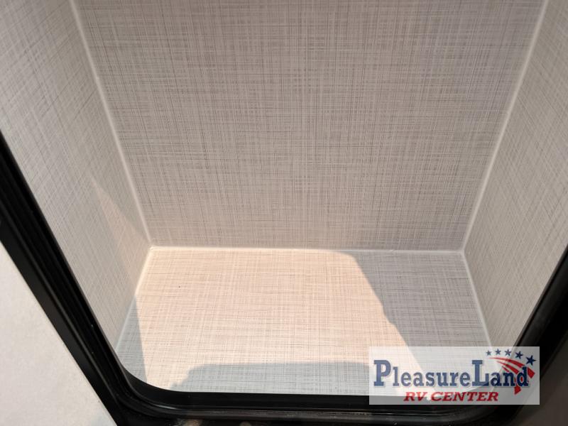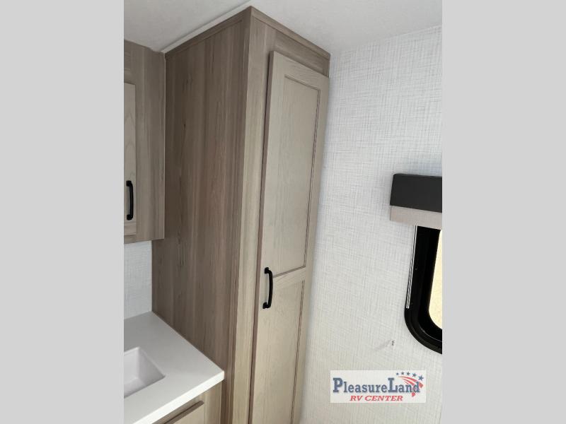 For the couple who enjoys a weekend camping trip, come choose this Flagstaff Micro Lite travel trailer. This unit features a slide that holds the theater seats with tables where you can dine each day, or you can choose the optional booth dinette or optional hide-a-bed sofa if you need more sleeping space. You'll love relaxing on these in the evening while you enjoy your entertainment center with an 32" 12V Smart entertainment TV. The private front bedroom includes an RV queen bed and a wardrobe slide. You'll love the cute kitchen with extra counter space for meal prep and a large closet/pantry to hold your favorite snacks.