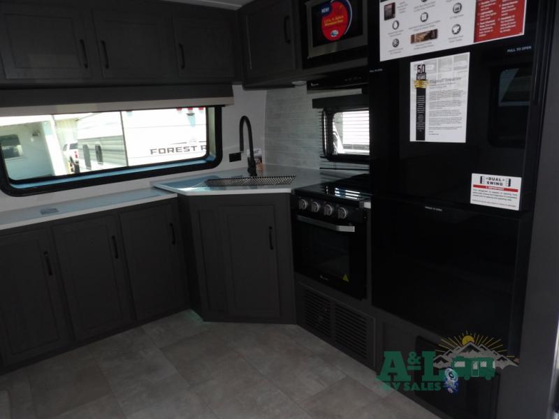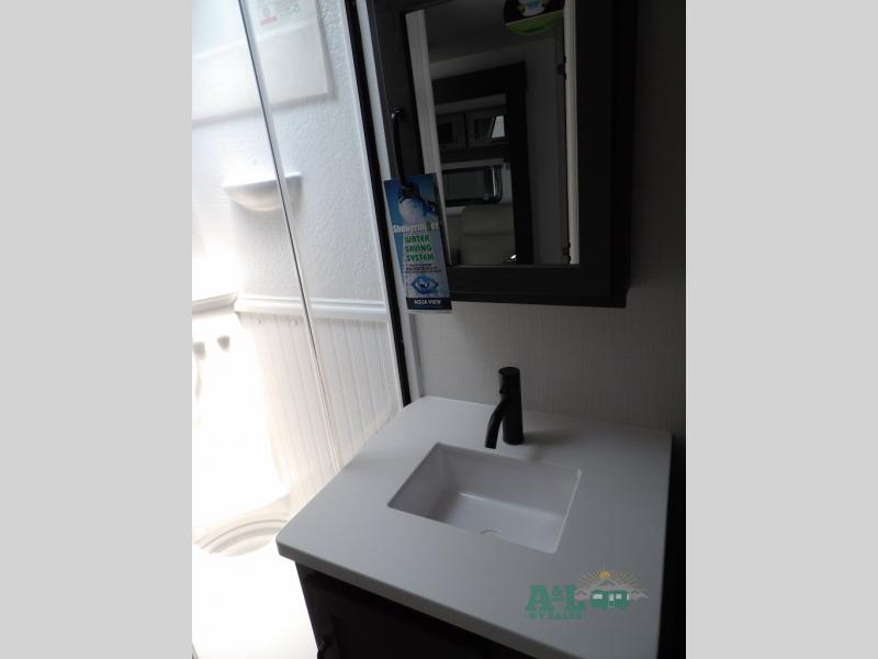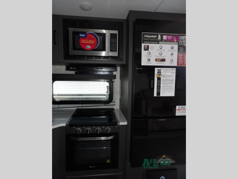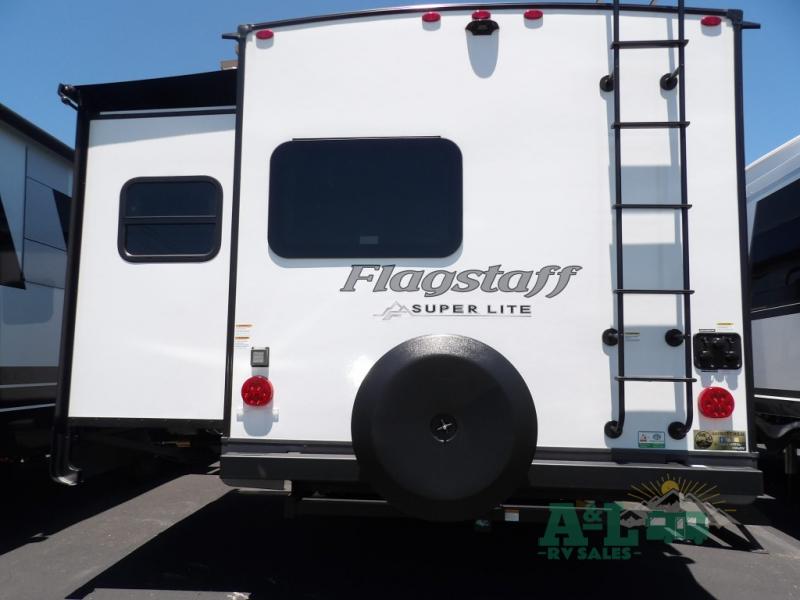 With any Flagstaff Super Lite travel trailer by Forest River the towing features include the TST tire pressure monitor system with a monitor providing safety on the road, Easy Lube axles and Nev-R adjust brakes, a power tongue jack for easy setup, and rear observation camera prep. Each is built with 6 sided aluminum framed side walls, end wall, front, floor and a roof, a plywood tongue and groove subfloor, electronically controlled heated holding tanks and an enclosed underbelly allowing you to travel during any season. The interior offers a multi-zone stereo with DVD, CD, AM/FM and Bluetooth control, a Showermiser water saving system, designer bedding and so much more!