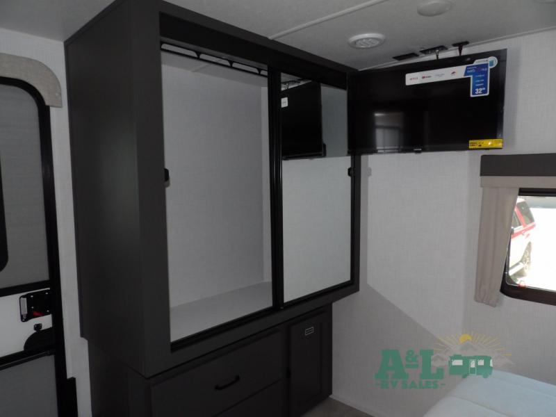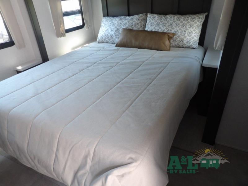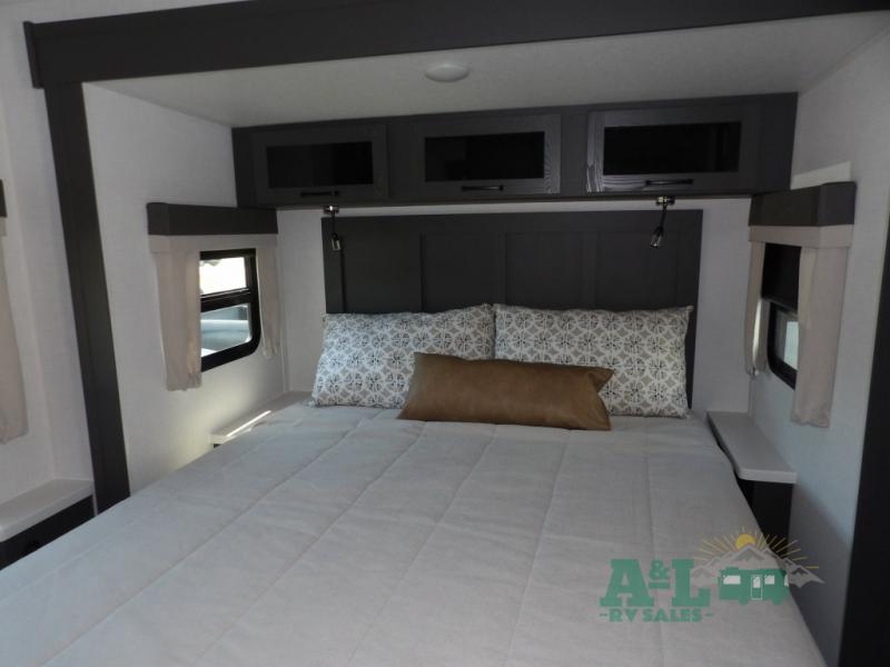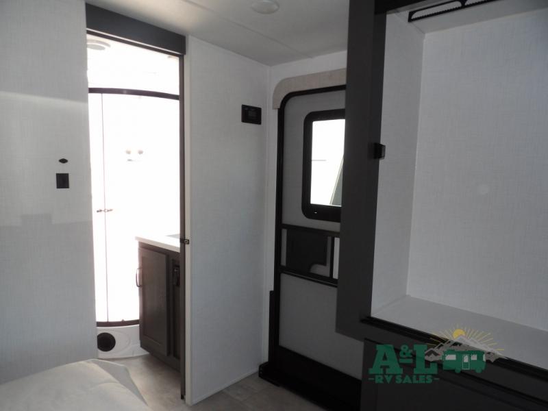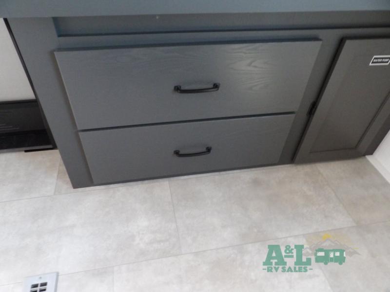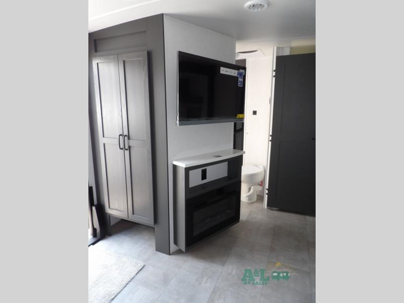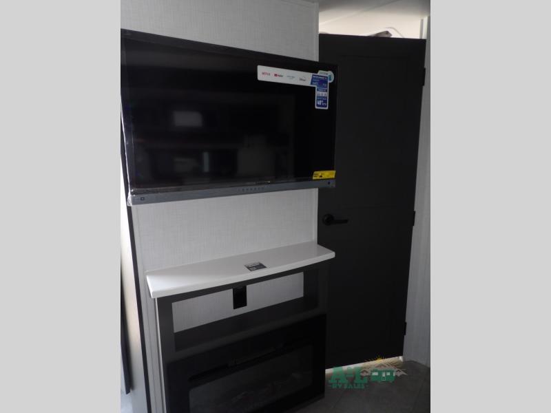 This is the perfect couples trailer with a spacious living and kitchen area and a rear bedroom which includes the second exterior entry/exit door! The bedroom also provides a slide out queen bed, a wardrobe and an optional TV, plus windows for great views and access to the double entry bathroom. The front kitchen gives the cook counter space and cabinetry for dishes and such, plus all the appliances needed to make warm meals and store leftovers. You can dine at the booth dinette, relax on the 67" theater seating and watch the Smart TV while enjoying the fireplace.