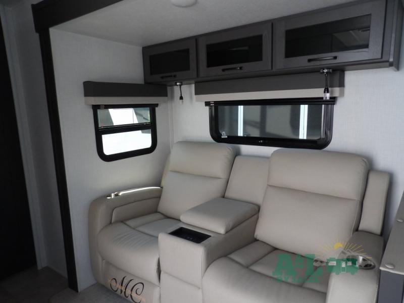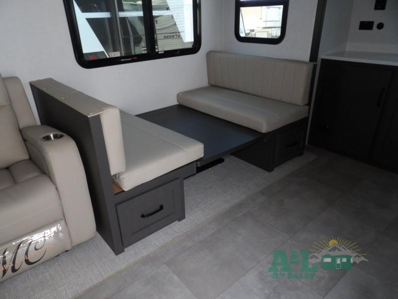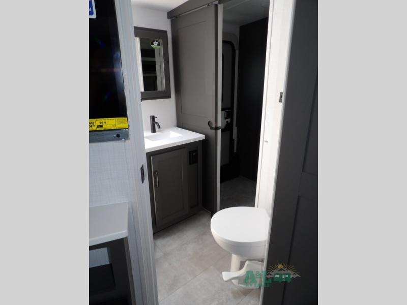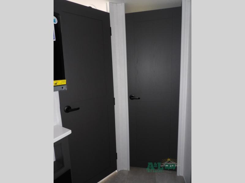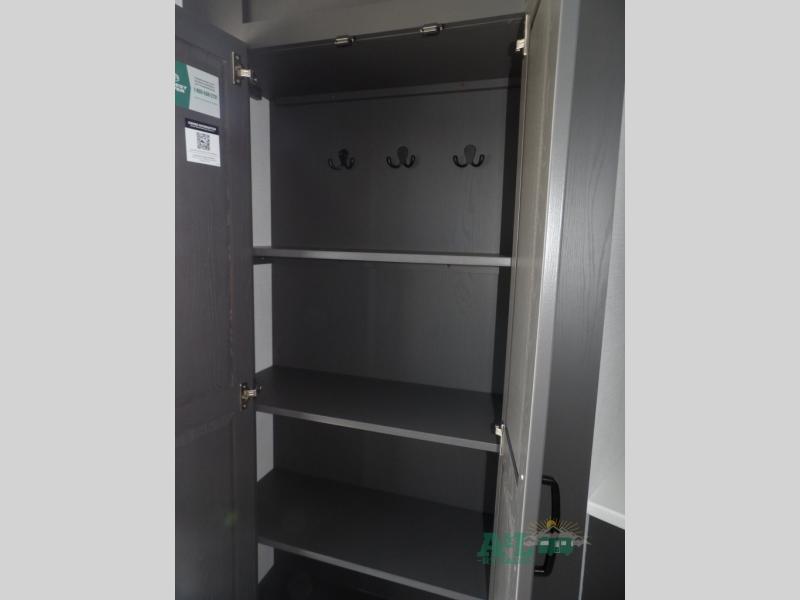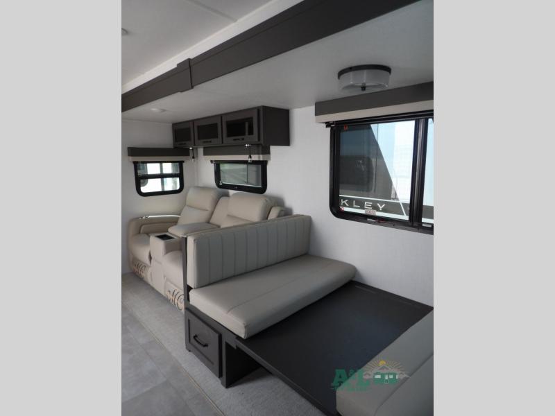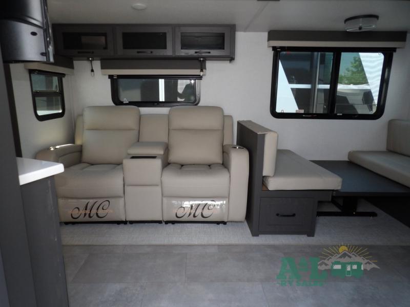 This is the perfect couples trailer with a spacious living and kitchen area and a rear bedroom which includes the second exterior entry/exit door! The bedroom also provides a slide out queen bed, a wardrobe and an optional TV, plus windows for great views and access to the double entry bathroom. The front kitchen gives the cook counter space and cabinetry for dishes and such, plus all the appliances needed to make warm meals and store leftovers. You can dine at the booth dinette, relax on the 67" theater seating and watch the Smart TV while enjoying the fireplace.