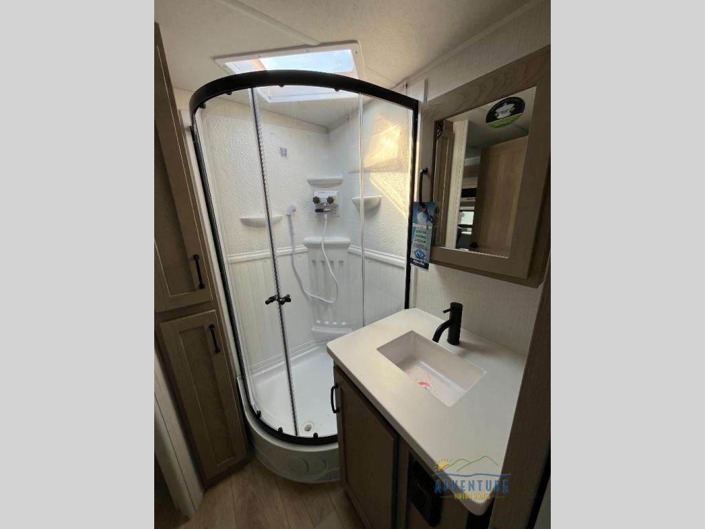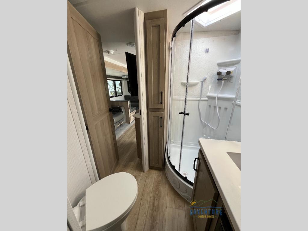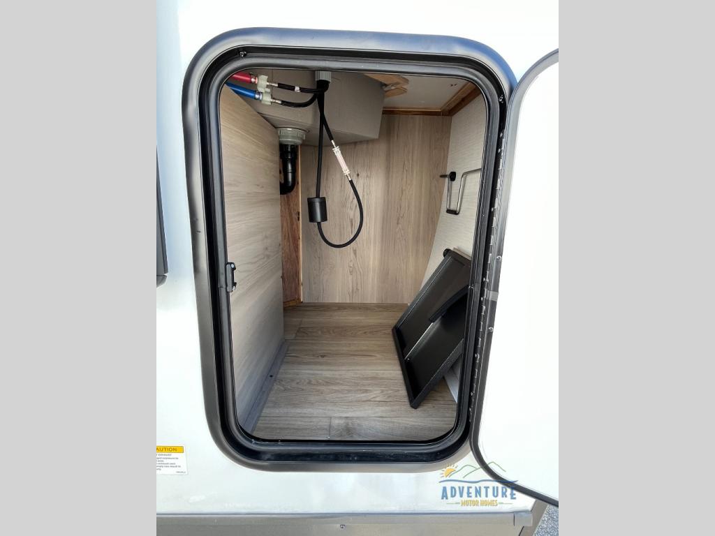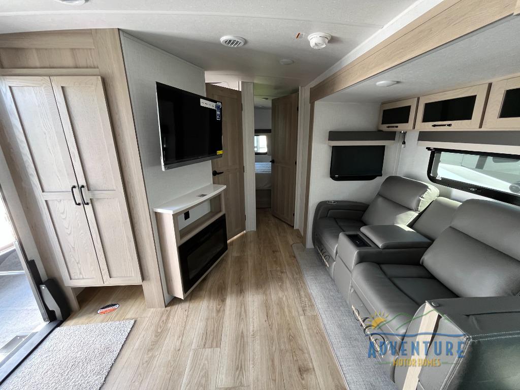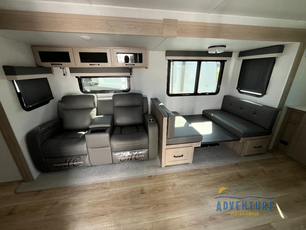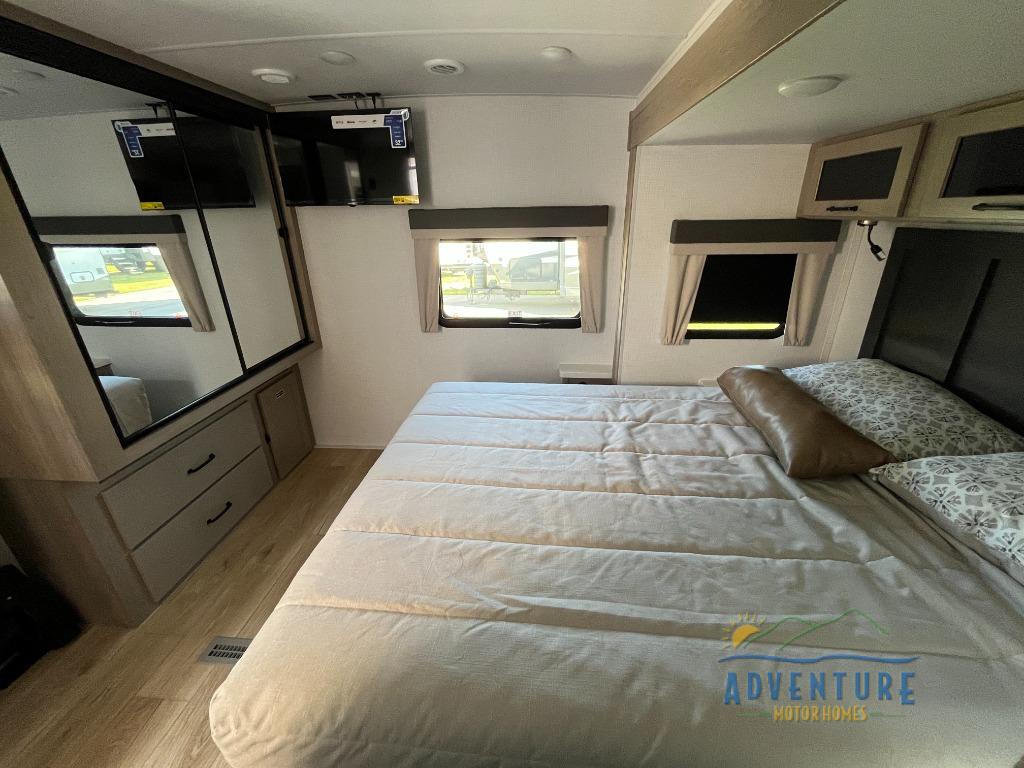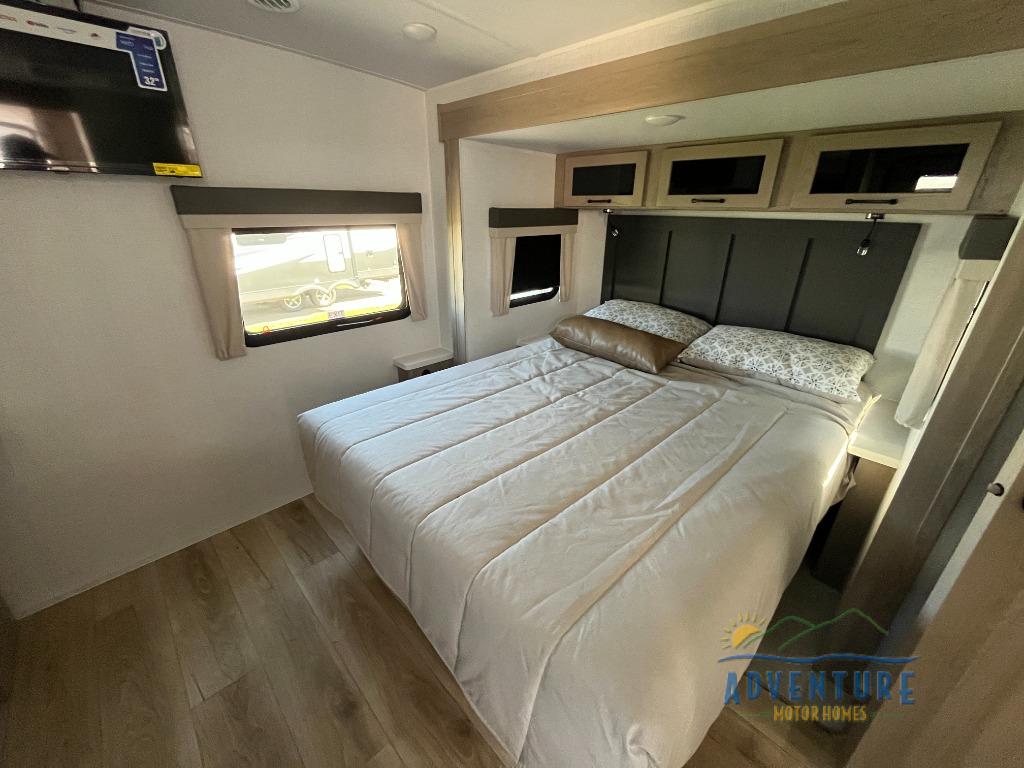 This is the perfect couples trailer with a spacious living and kitchen area and a rear bedroom which includes the second exterior entry/exit door! The bedroom also provides a slide out queen bed, a wardrobe and an optional TV, plus windows for great views and access to the double entry bathroom. The front kitchen gives the cook counter space and cabinetry for dishes and such, plus all the appliances needed to make warm meals and store leftovers. You can dine at the booth dinette, relax on the 67" theater seating and watch the Smart TV while enjoying the fireplace.