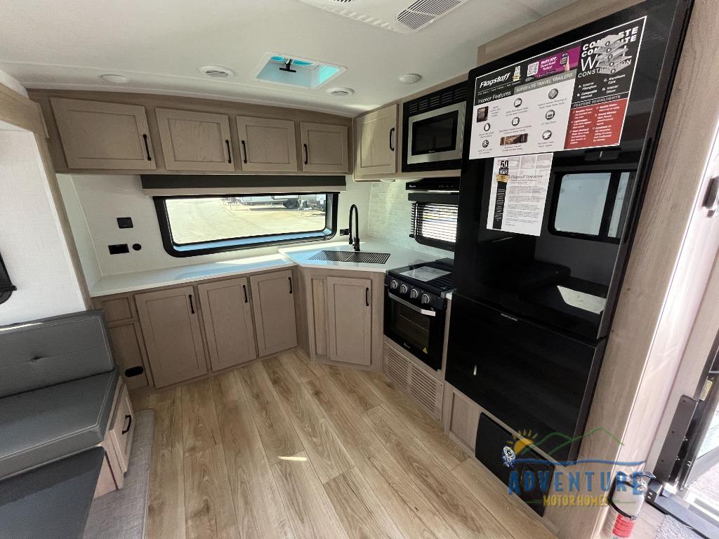 With any Flagstaff Super Lite travel trailer by Forest River the towing features include the TST tire pressure monitor system with a monitor providing safety on the road, Easy Lube axles and Nev-R adjust brakes, a power tongue jack for easy setup, and rear observation camera prep. Each is built with 6 sided aluminum framed side walls, end wall, front, floor and a roof, a plywood tongue and groove subfloor, electronically controlled heated holding tanks and an enclosed underbelly allowing you to travel during any season. The interior includes designer kitchen backsplash, solid surface kitchen countertops, Sedonwood cabinetry, and solid wood cabinet doors and drawers to make you feel right at home.