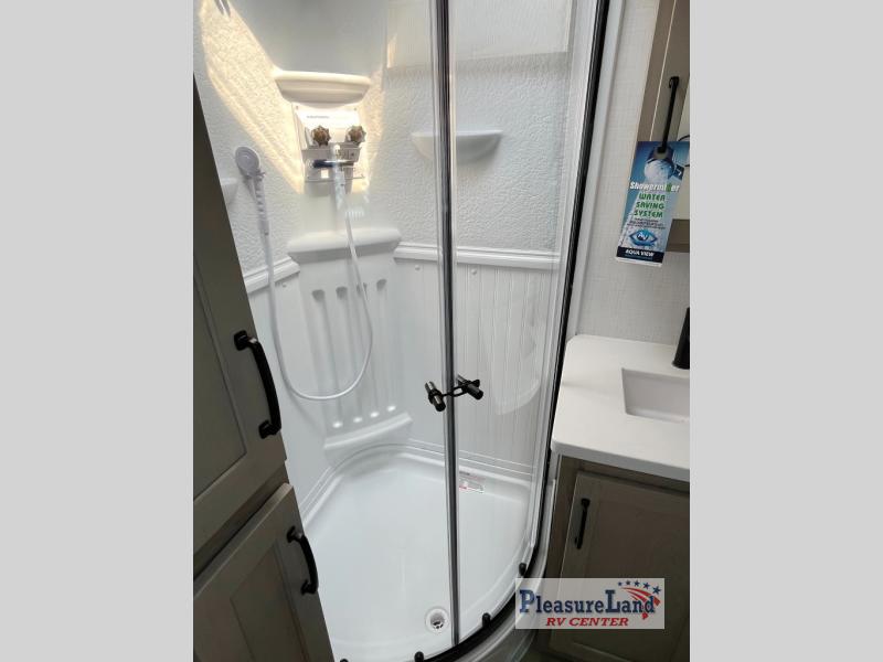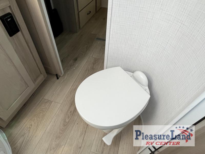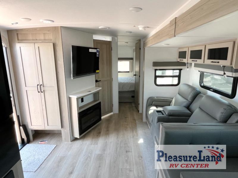This is the perfect couples trailer with a spacious living and kitchen area and a rear bedroom which includes the second exterior entry/exit door! The bedroom also provides a slide out queen bed, a wardrobe and an optional TV, plus windows for great views and access to the double entry bathroom. The front kitchen gives the cook counter space and cabinetry for dishes and such, plus all the appliances needed to make warm meals and store leftovers. You can dine at the booth dinette, relax on the 67" theater seating and watch the Smart TV while enjoying the fireplace.
