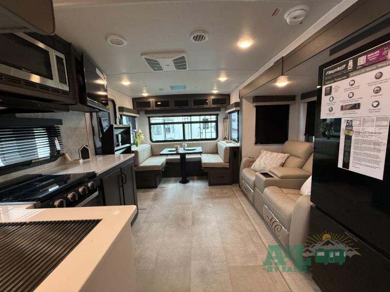 With any Flagstaff Super Lite travel trailer by Forest River the towing features include the TST tire pressure monitor system with a monitor providing safety on the road, Easy Lube axles and Nev-R adjust brakes, a power tongue jack for easy setup, and rear observation camera prep. Each is built with 6 sided aluminum framed side walls, end wall, front, floor and a roof, a plywood tongue and groove subfloor, electronically controlled heated holding tanks and an enclosed underbelly allowing you to travel during any season. The interior includes designer kitchen backsplash, solid surface kitchen countertops, Sedonwood cabinetry, and solid wood cabinet doors and drawers to make you feel right at home.