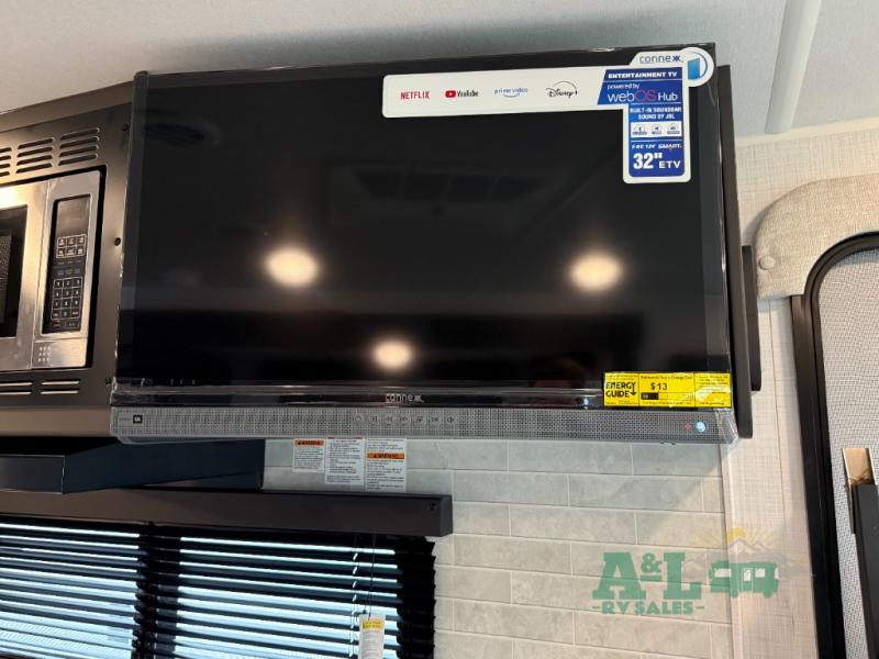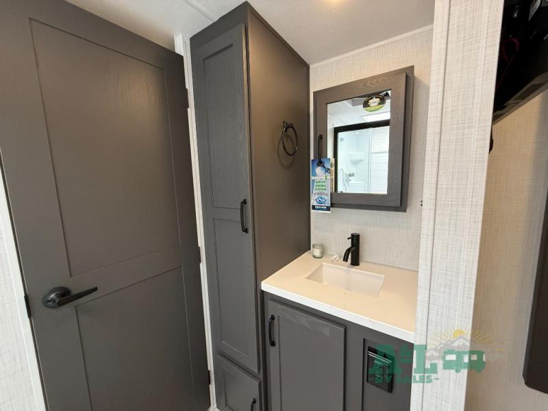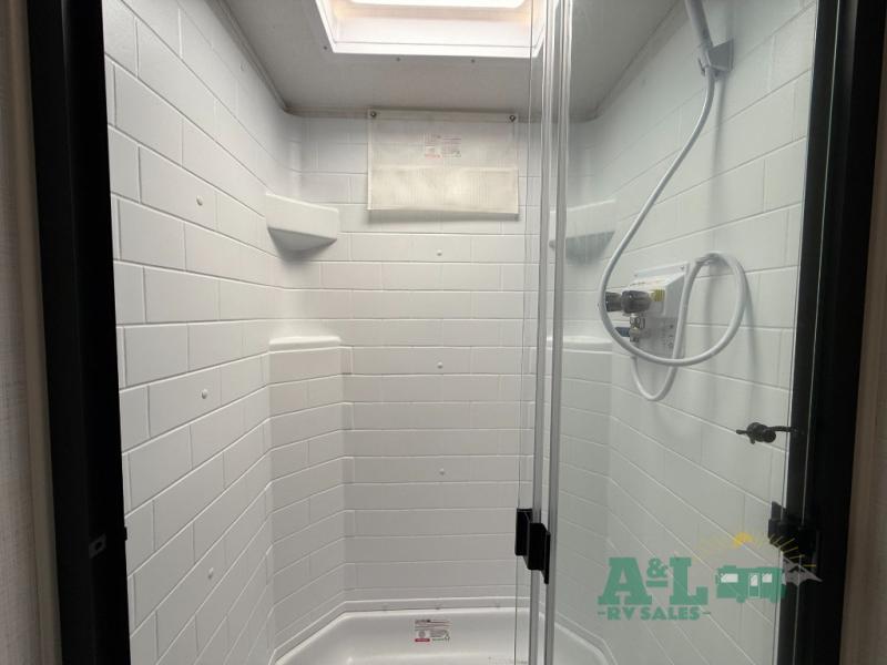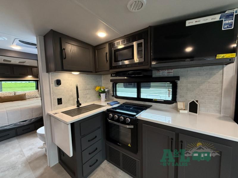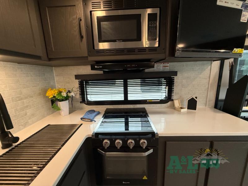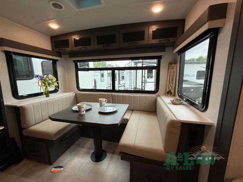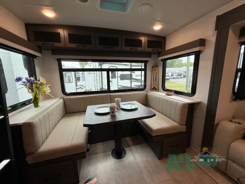 It will be so easy to enjoy time at the campground in this cozy travel trailer. The full kitchen includes a three burner gas oven, a microwave oven, and a 12V refrigerator to cook and store food, and the pantry will let you stock up on snacks. Your crew can get comfortable on the theater seat or around the rear U-shaped dinette, and there is a 12V smart entertainment TV here to make it a movie night. The walk-thru bath will let you freshen up each day, and the queen bed in the front bedroom is sure to bring comfort. You will also find one of the dual entry doors here for convenience plus a wardrobe slide out for more storage and floor space. The exterior is just as accommodating with its pass-thru storage, exterior griddle, and 21' awning!