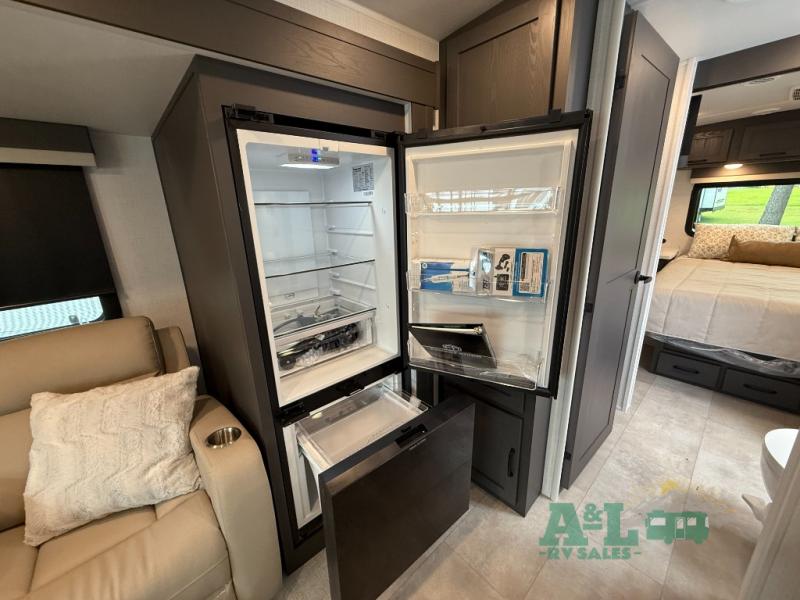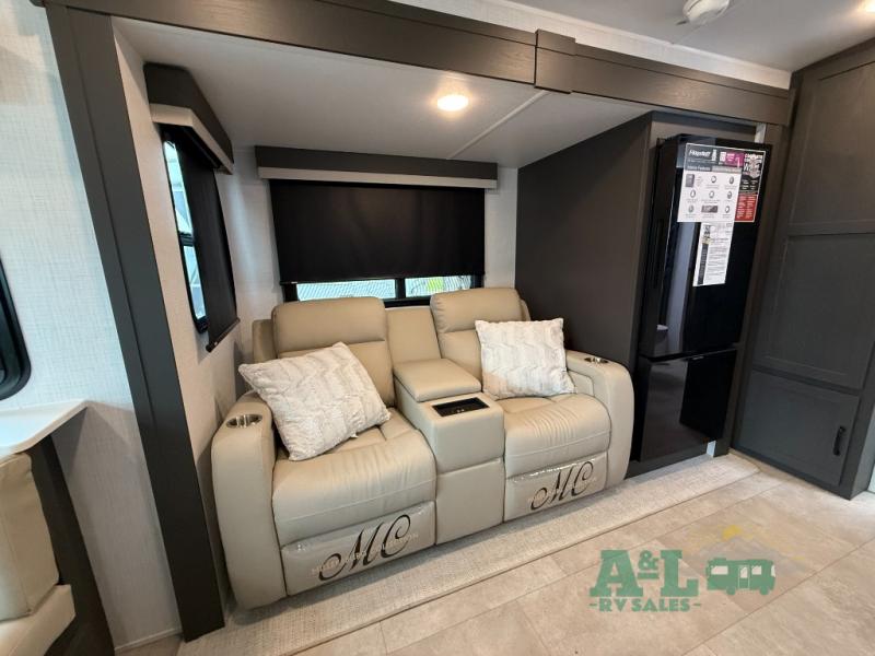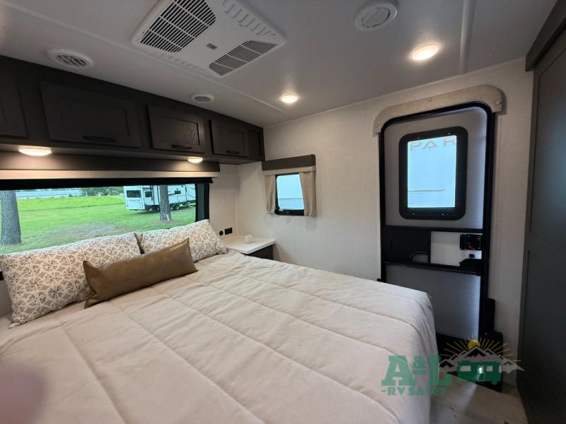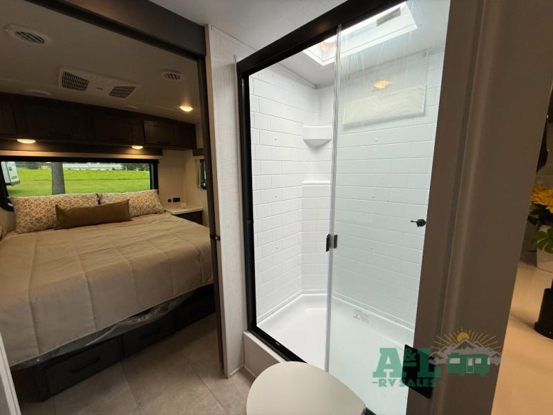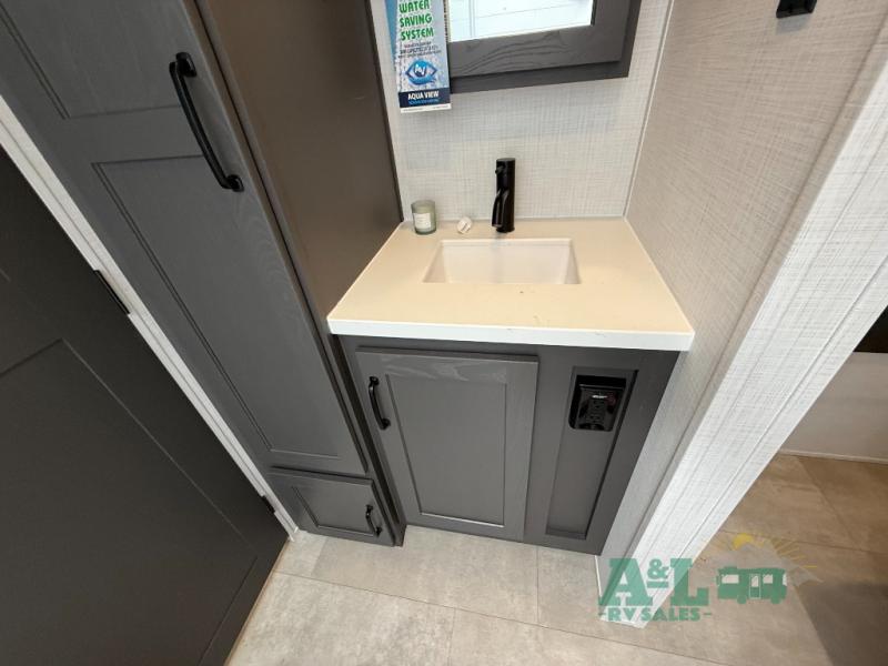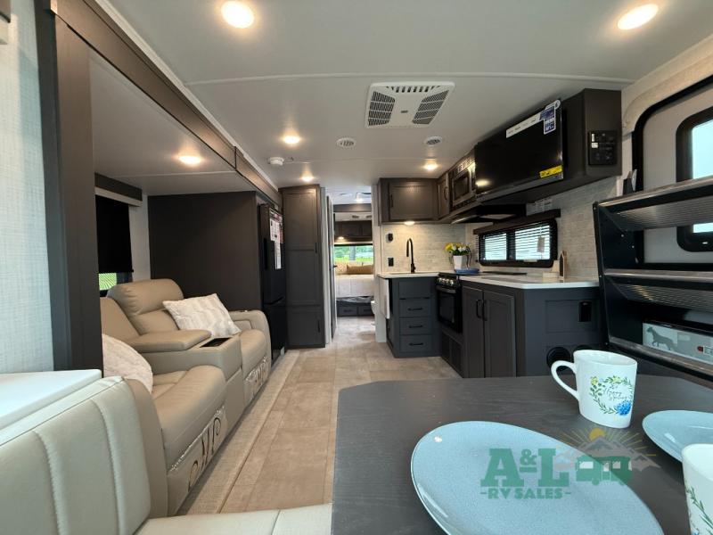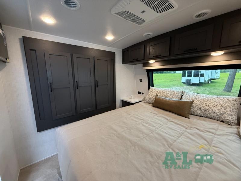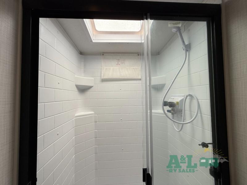 It will be so easy to enjoy time at the campground in this cozy travel trailer. The full kitchen includes a three burner gas oven, a microwave oven, and a 12V refrigerator to cook and store food, and the pantry will let you stock up on snacks. Your crew can get comfortable on the theater seat or around the rear U-shaped dinette, and there is a 12V smart entertainment TV here to make it a movie night. The walk-thru bath will let you freshen up each day, and the queen bed in the front bedroom is sure to bring comfort. You will also find one of the dual entry doors here for convenience plus a wardrobe slide out for more storage and floor space. The exterior is just as accommodating with its pass-thru storage, exterior griddle, and 21' awning!