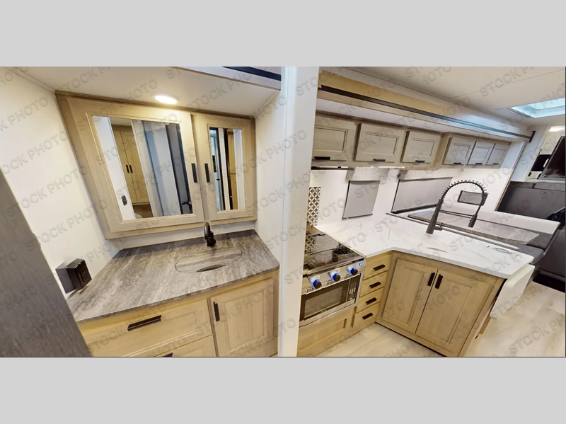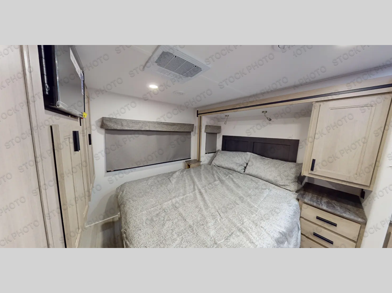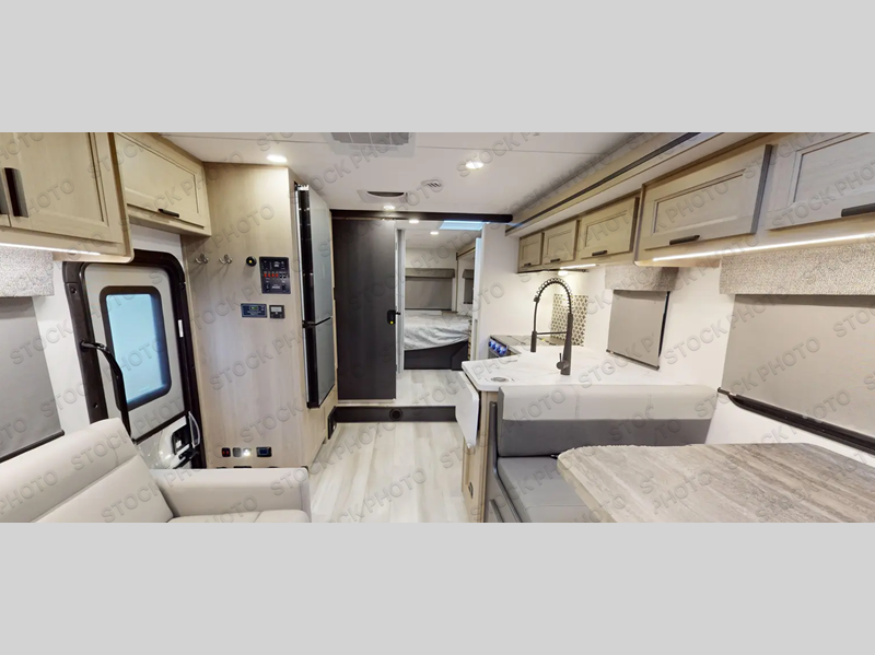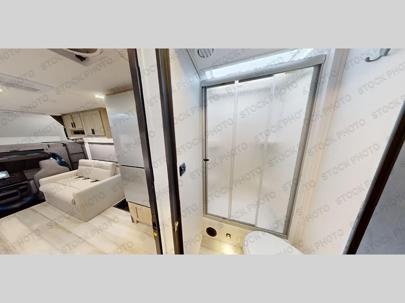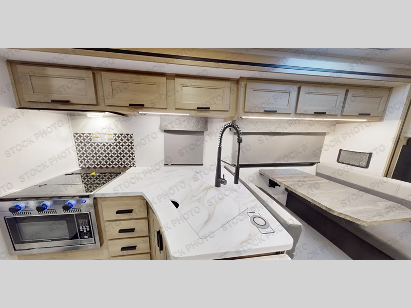 Start traveling in true luxury with this motorhome! The rear private bedroom has a queen bed to lay your head at night, a closet, and wardrobes on either side of the 12V TV. It also leads into the separated bathroom which has a 24" x 36" shower and toilet across from a sink with a medicine cabinet above it. The undermount 1.3 cu. ft. convection microwave will come in handy on those nights when you don't feel like cooking and the flip-up countertop will make your meal prepping easier. You can enjoy your meals at the booth dinette and lay down on the sofa to catch up on your book. The 60" x 80" bunk over cab mat offers a comfortable sleeping space but can be switched out for the optional Trekker cap with a built-in entertainment center!