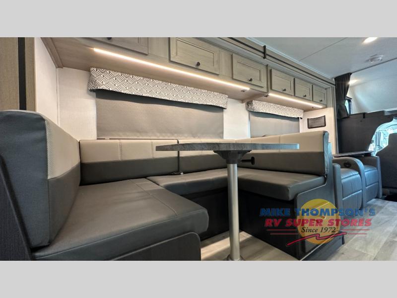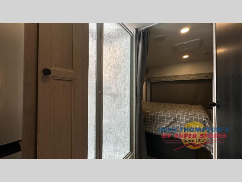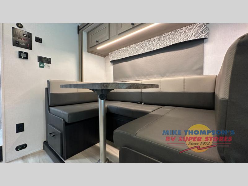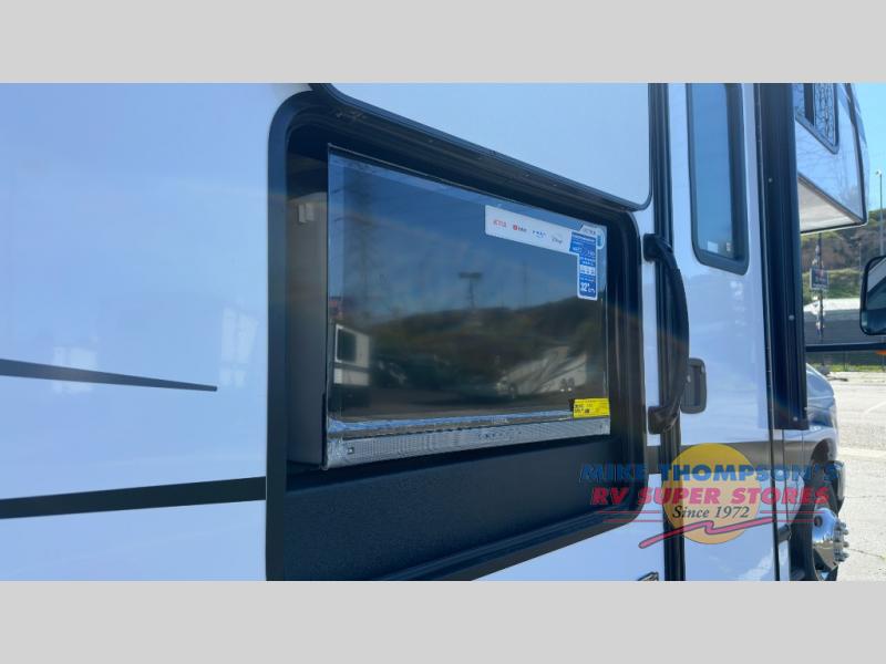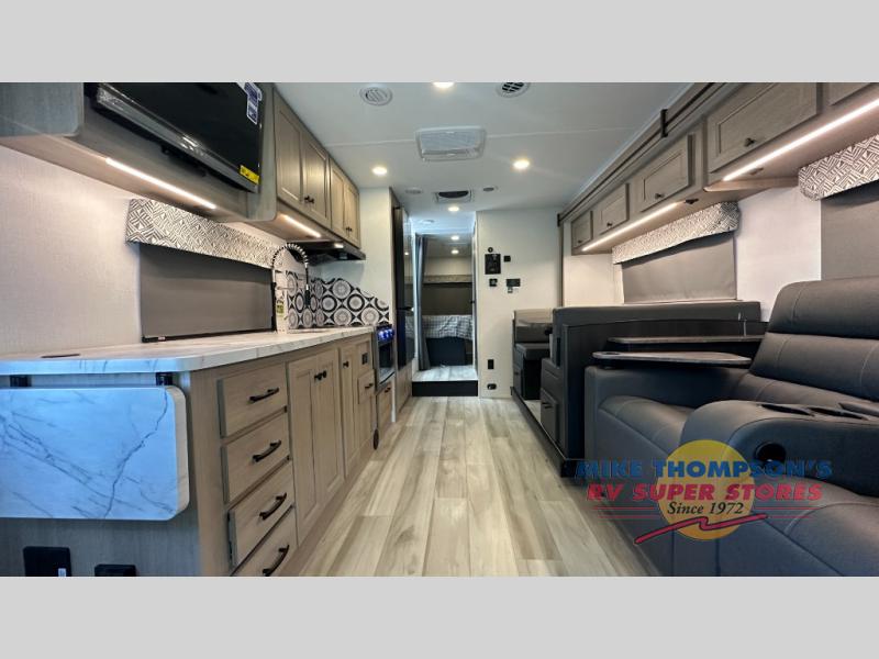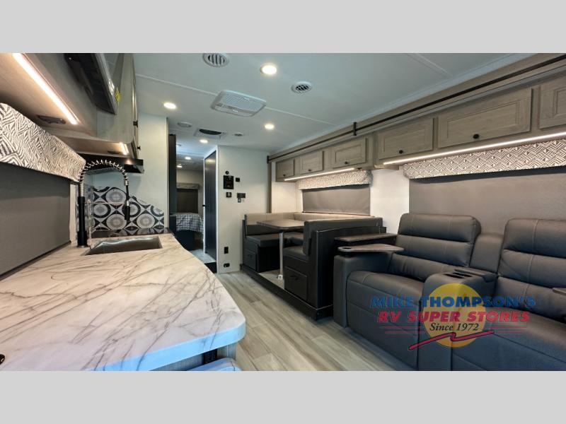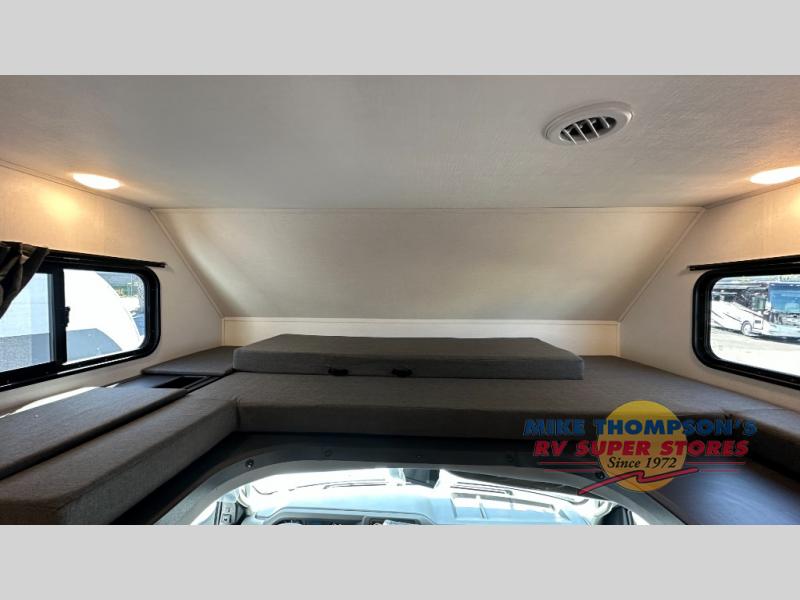 Escape the hustle and bustle of everyday life with this motorhome! It features a 60" x 80" bunk over cab mat which can be switched out for an optional Trekker cap with a built-in entertainment center. The sofa and U-shaped dinette slide offer comfortable places to enjoy meals, socialize, and even sleep once converted. Prepare your best meals with the 10.7 cu. ft. 12V refrigerator, the three burner cooktop, the flip-up countertop, and even the 1.3 cu. ft. undermount convection microwave. The separated bathroom has a 24" x 36" shower across from a toilet with a sink and countertop space, plus it leads directly into the rear private bedroom which has a 60" x 74" queen bed slide across from a linen/12V TV area with wardrobes on either side. You can even add an optional outside 12V TV and stay protected by the 15' 6" power awning!
