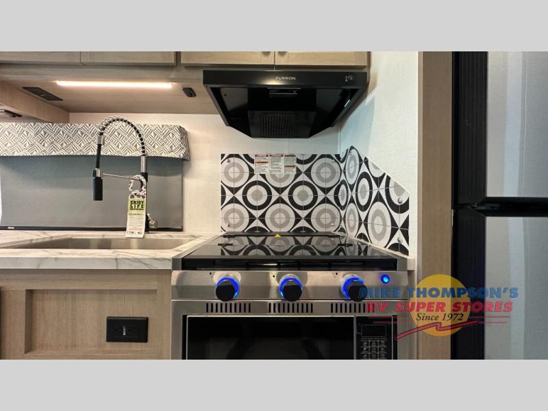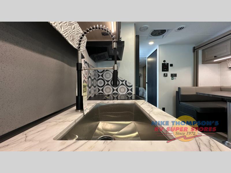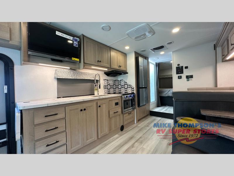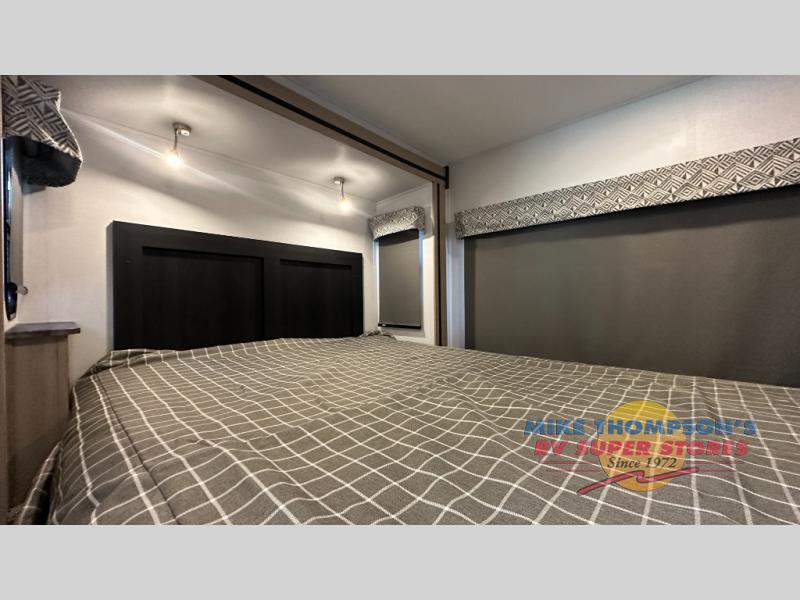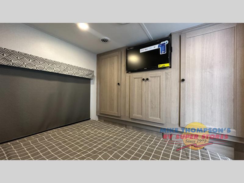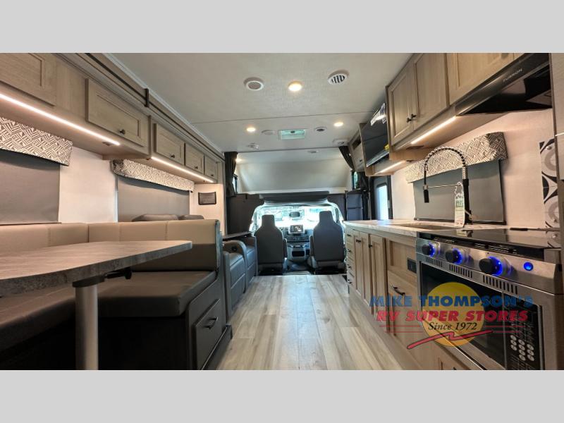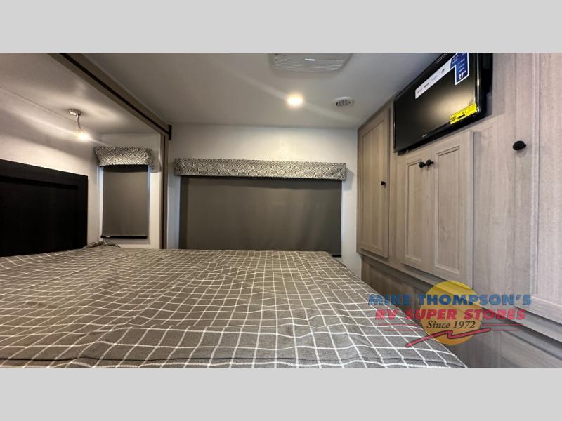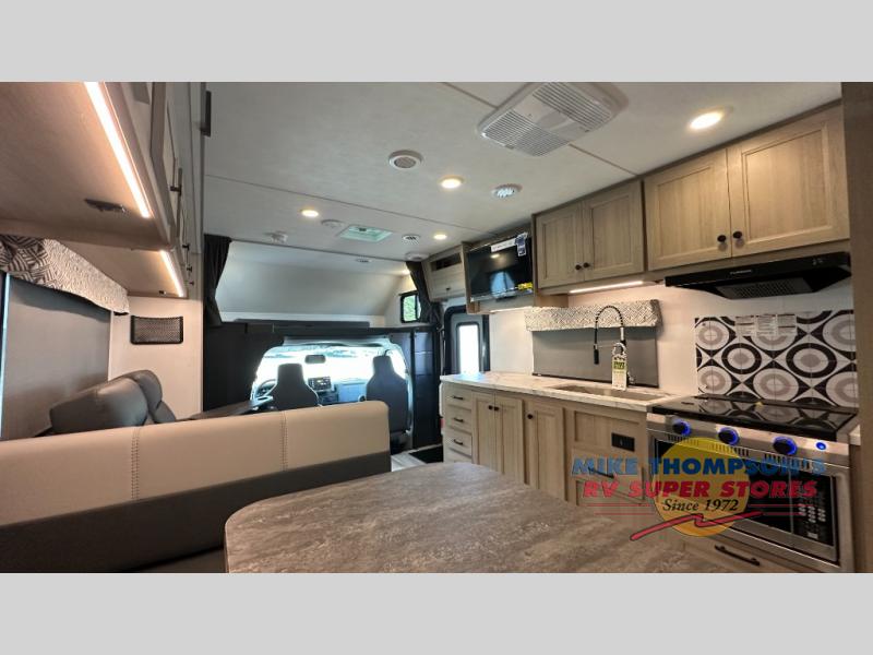 Escape the hustle and bustle of everyday life with this motorhome! It features a 60" x 80" bunk over cab mat which can be switched out for an optional Trekker cap with a built-in entertainment center. The sofa and U-shaped dinette slide offer comfortable places to enjoy meals, socialize, and even sleep once converted. Prepare your best meals with the 10.7 cu. ft. 12V refrigerator, the three burner cooktop, the flip-up countertop, and even the 1.3 cu. ft. undermount convection microwave. The separated bathroom has a 24" x 36" shower across from a toilet with a sink and countertop space, plus it leads directly into the rear private bedroom which has a 60" x 74" queen bed slide across from a linen/12V TV area with wardrobes on either side. You can even add an optional outside 12V TV and stay protected by the 15' 6" power awning!