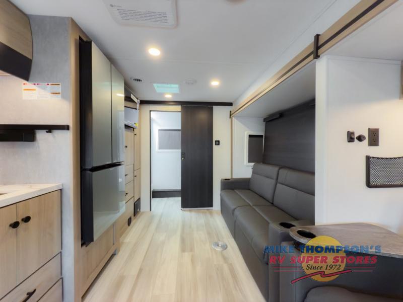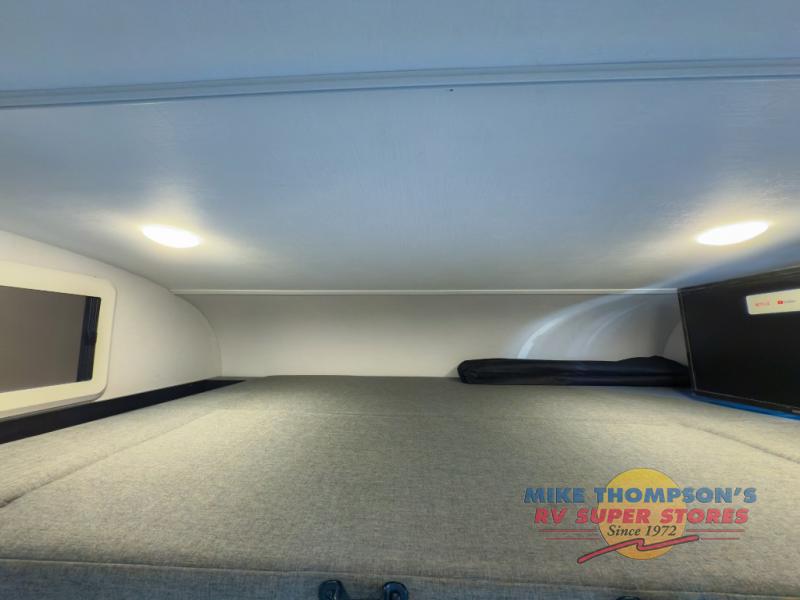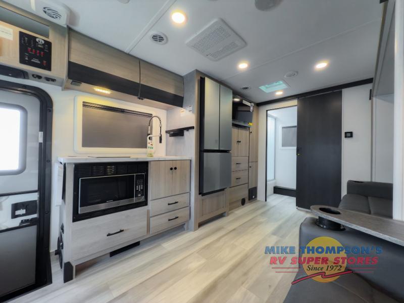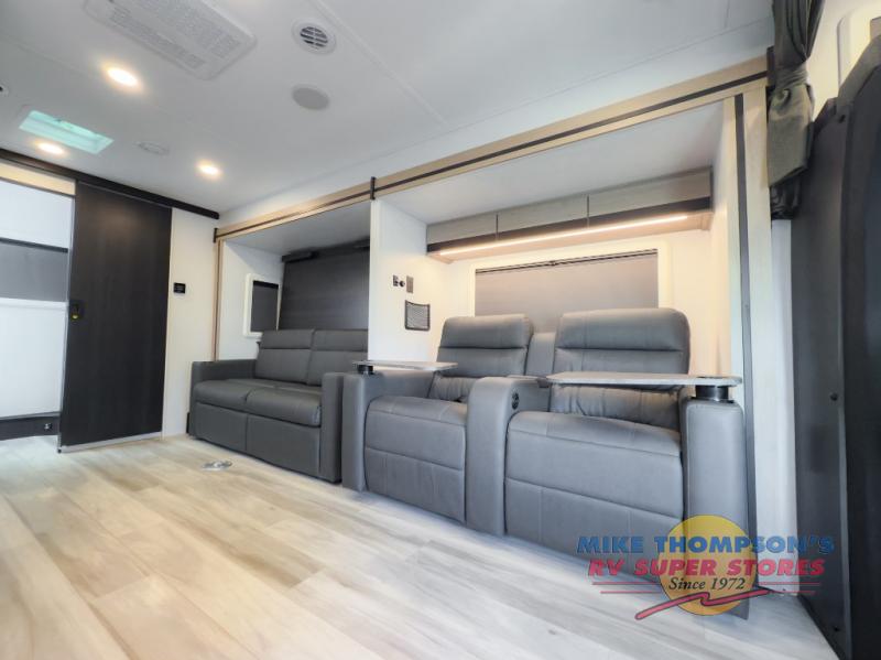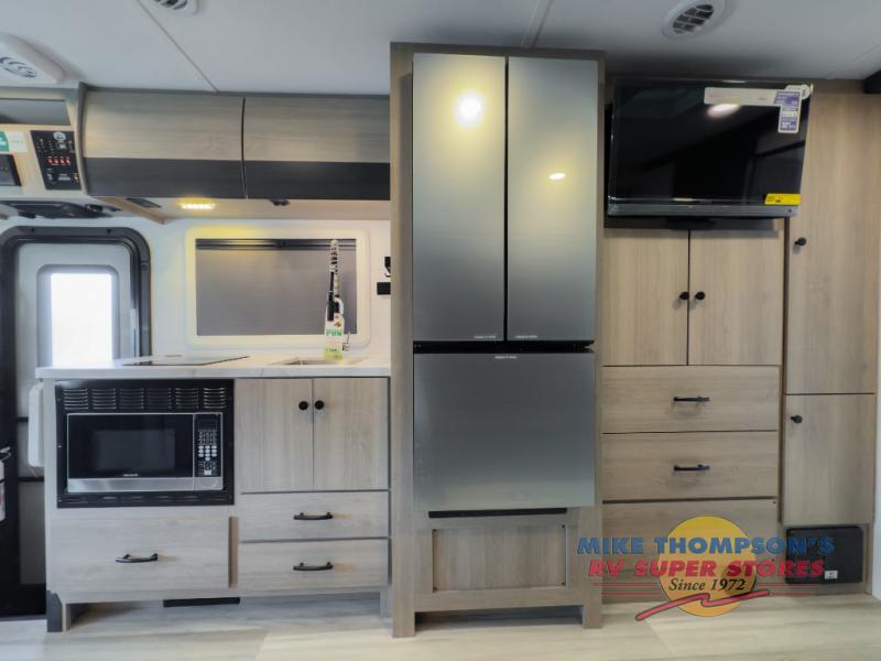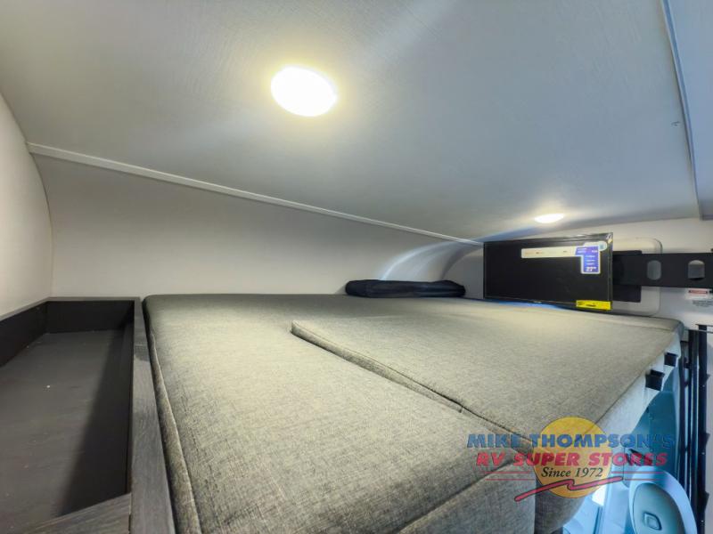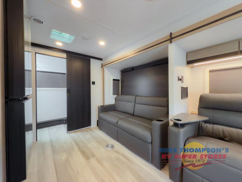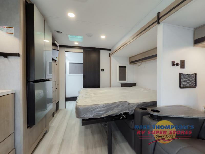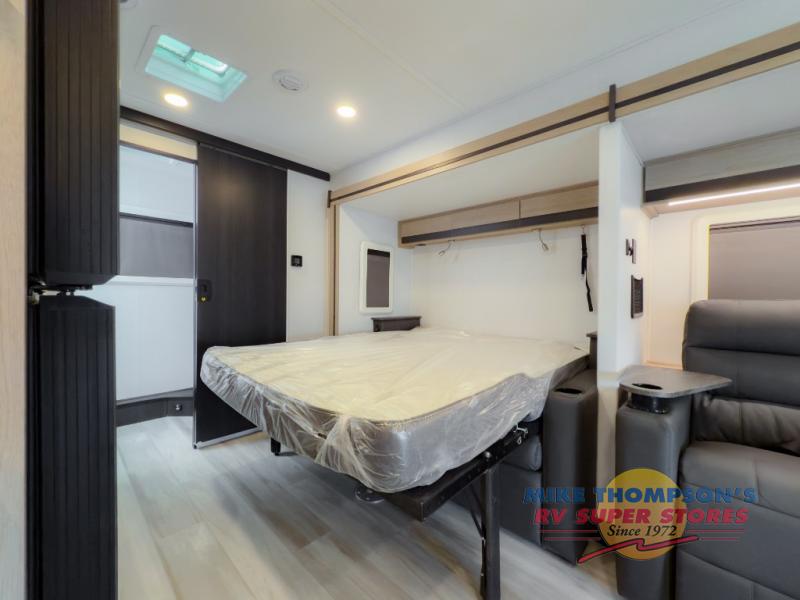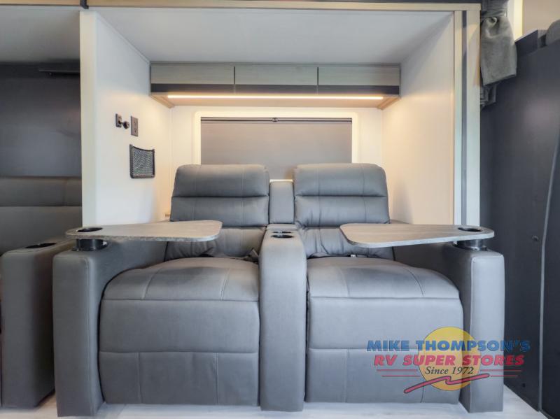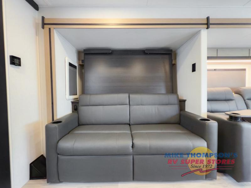 Get ready to utilize this coach in multiple ways thanks to the spacious and convertible living area with a sofa with a removable table to dine at during the day, and a queen Murphy bed to sleep on at night. You can also enjoy the power theater seats while watching the 12V TV over the cab. The cook will have a convection microwave and two-burner range to make meals, and the 10.7 cu. ft. refrigerator is nearby to grab a beverage. There is clothing storage found in drawers with hidden storage behind the bedroom 12V TV, and there is a closet for toiletries. The cab over bunk will come in handy when you invite overnight guests, and the full bathroom in the rear offers privacy.