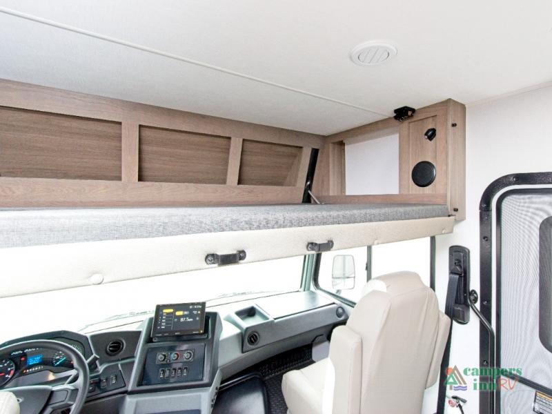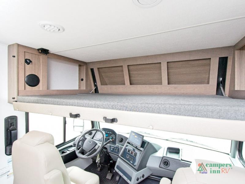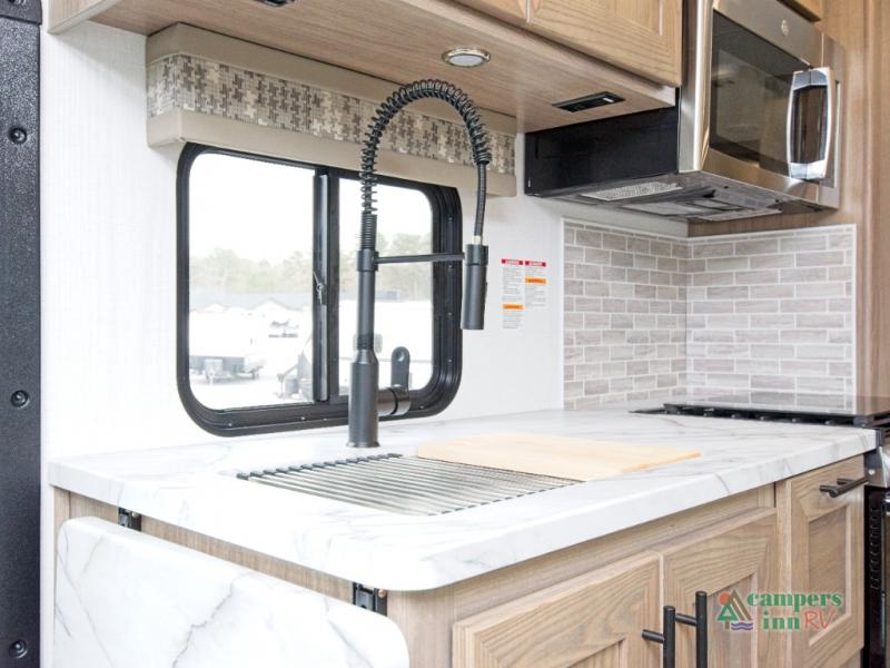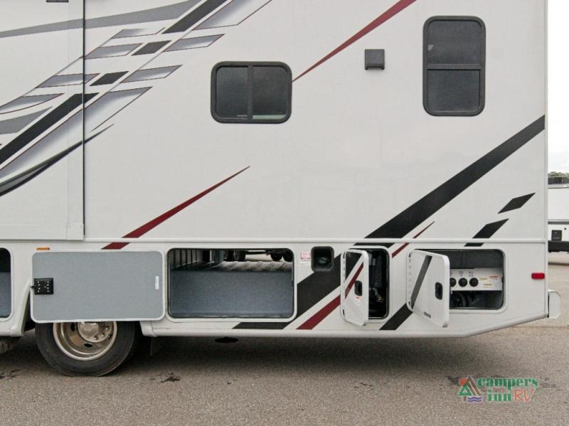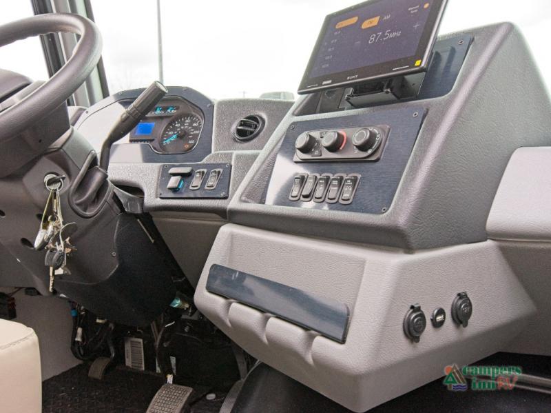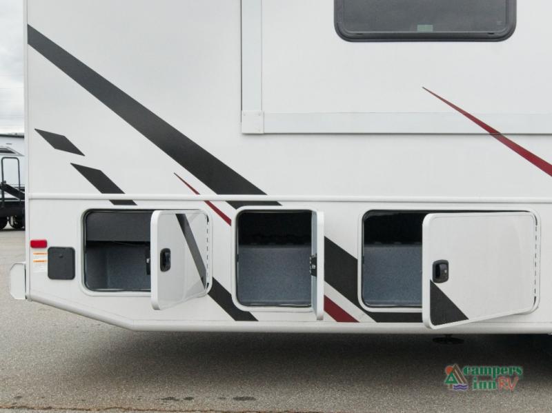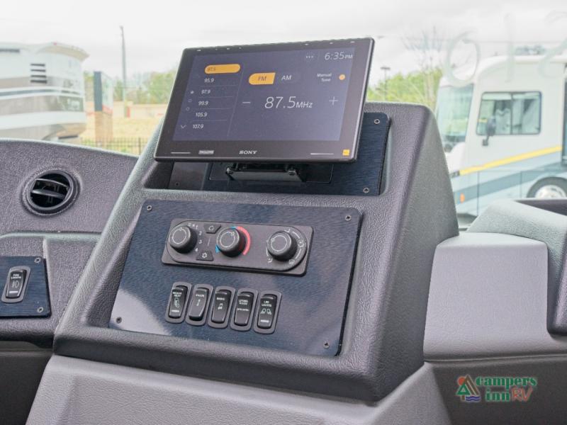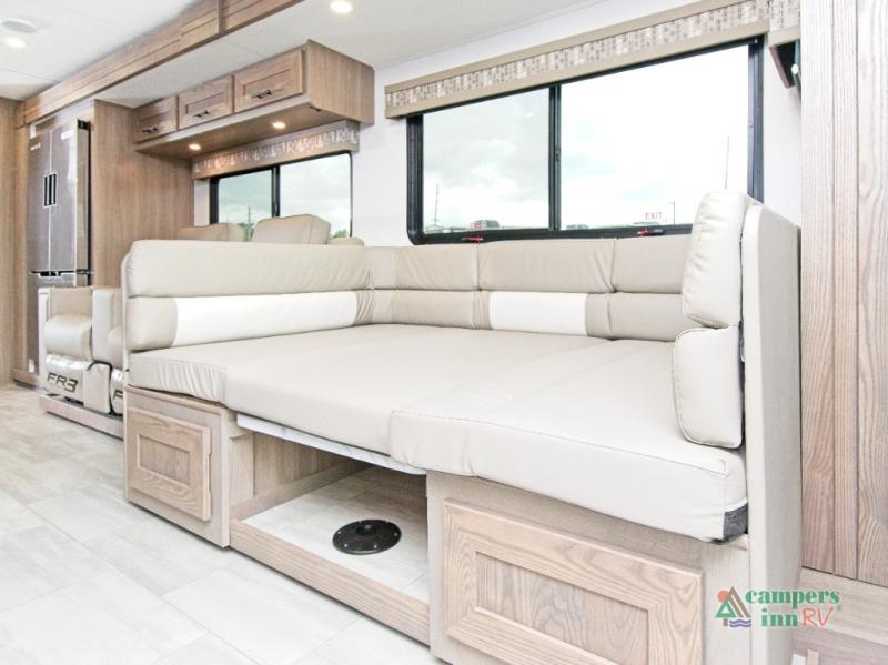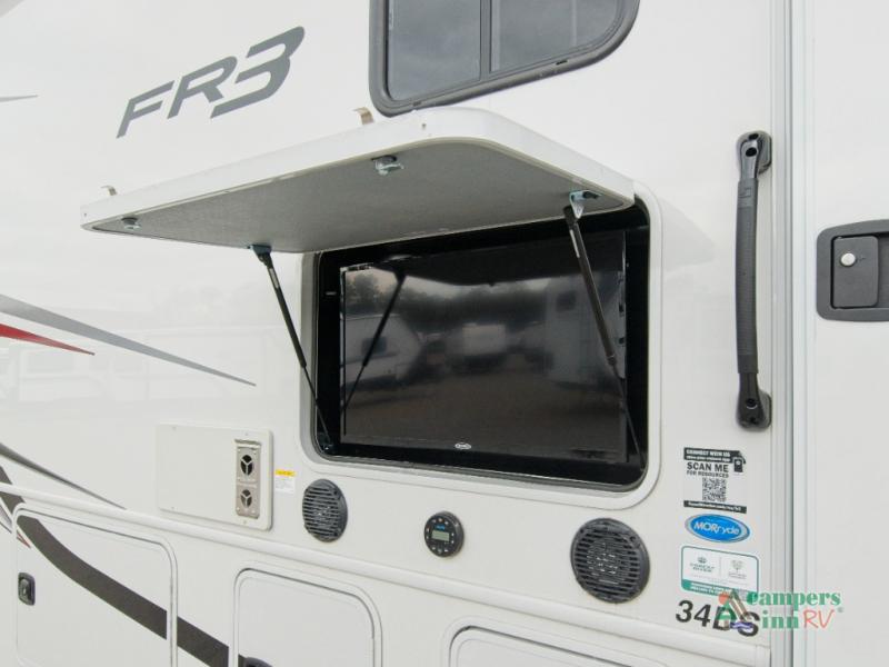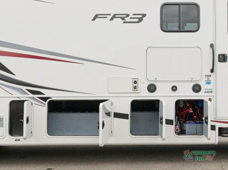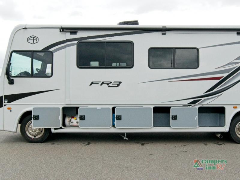 The FR3 Class A motorhome is crafted with a vacuum-bonded construction and a one-piece fiberglass roof, ensuring durability and protection on your travels. The Bi-LED headlamps and lower LED fog lights provide improved visibility, while the grey Rotocast storage boxes with drains offer easy storage solutions. Inside, enjoy sleek black hardware, stainless steel kitchen sink, and heavy-duty full-extension ball-bearing drawer guides for convenience and quality.