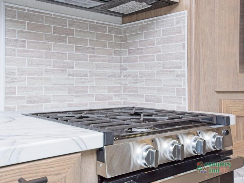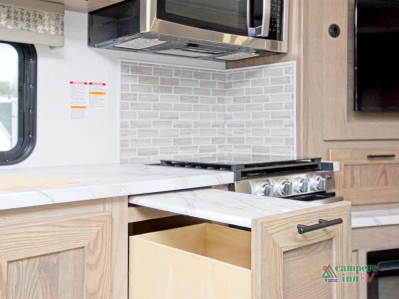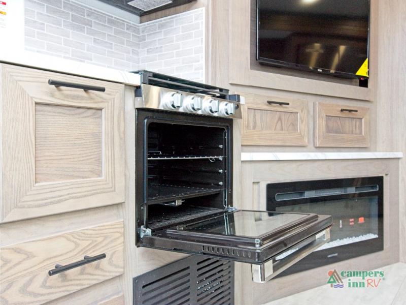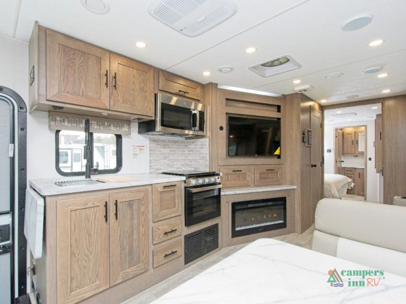 Inside, the fully-equipped kitchen features everything you need, including a residential microwave for quick meals and snacks. After dinner, unwind in comfort with theater seating and enjoy the 40" LED 12V TV and fireplace below for a cozy, cinematic experience.