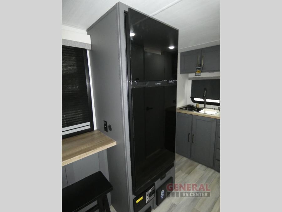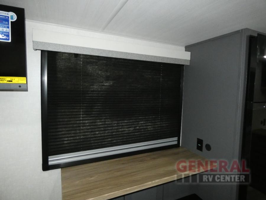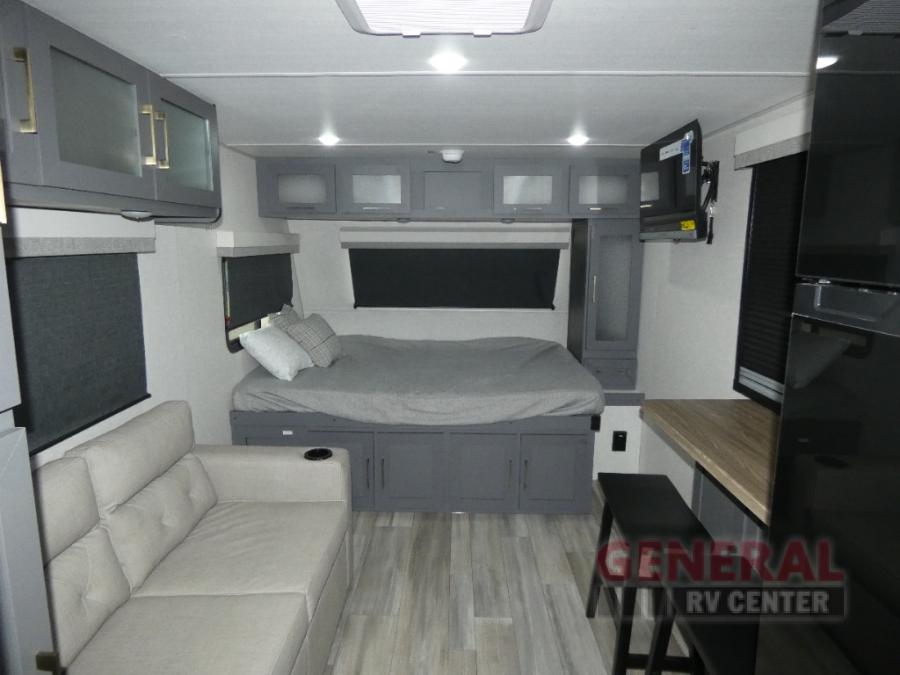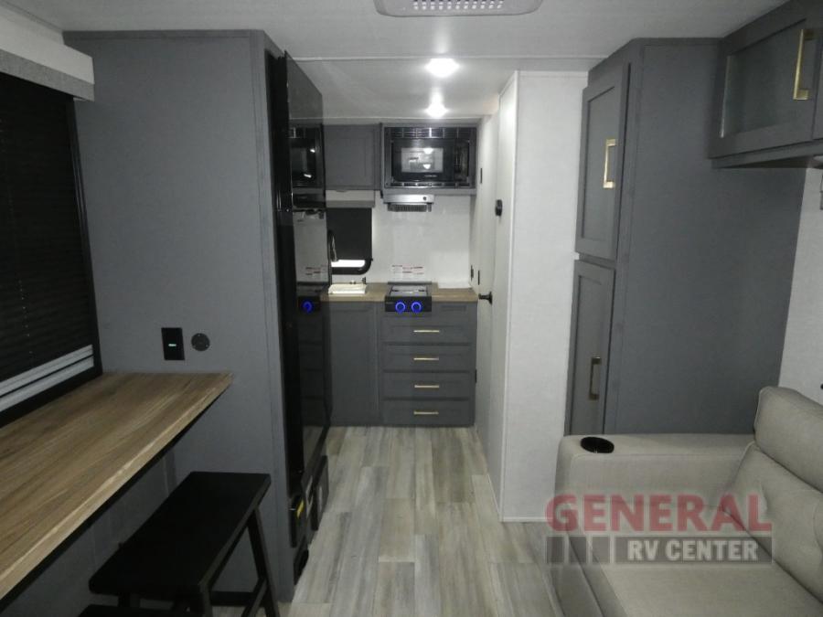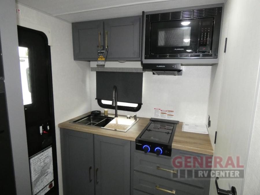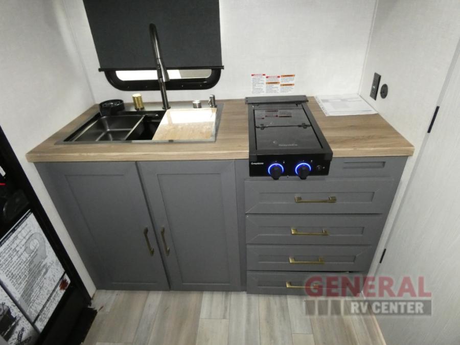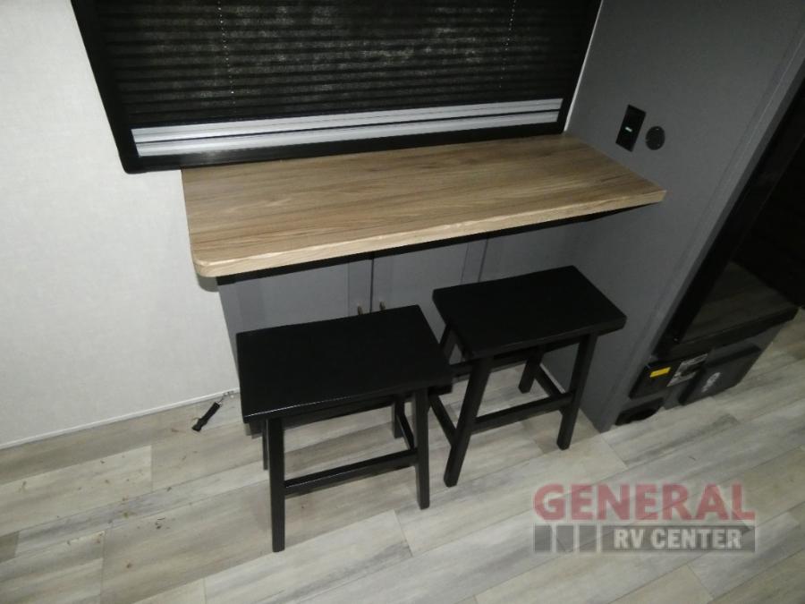 Grab your hiking gear and hit the road in this no-slide travel trailer! The front queen bed will provide a comfortable place to rest your head each night, and the rear corner full bath will let you freshen up without having to use the camp's facilities. The full kitchen includes an all-in-one microwave and air fryer plus a refrigerator to keep food stocked. You'll find comfortable seating space on the jackknife sofa, and you can enjoy your morning coffee at the counter with two stools and a flip-up window! This unit also includes an outside kitchen to keep the fish fry odors outside!