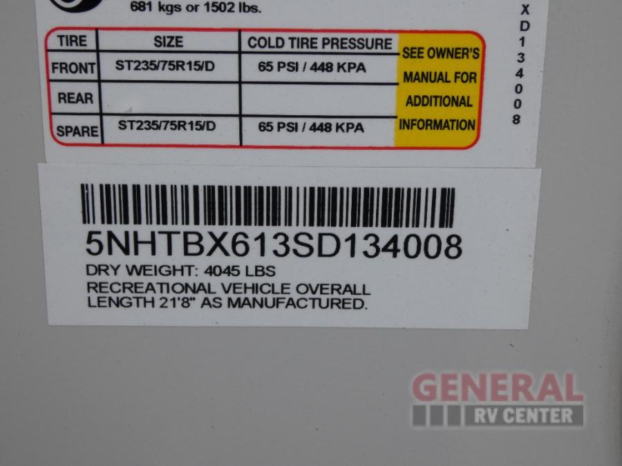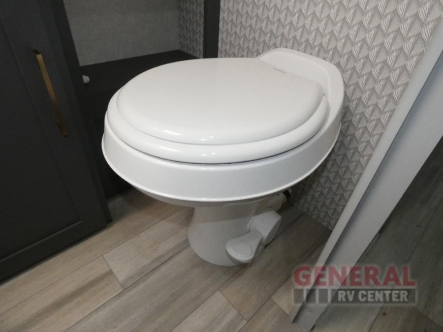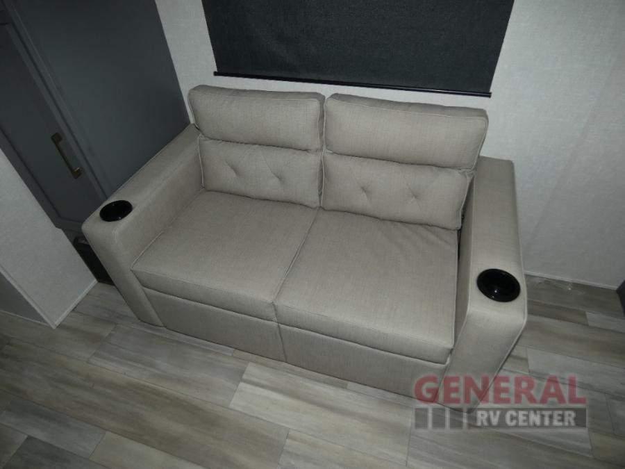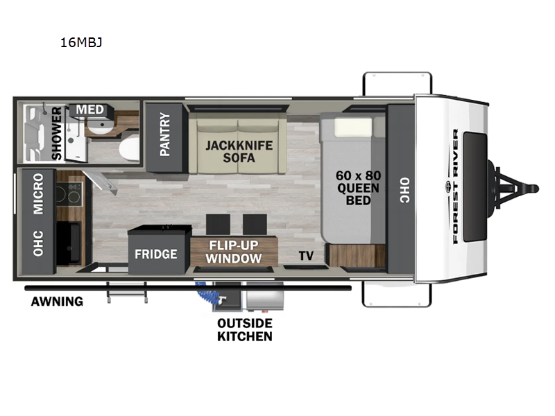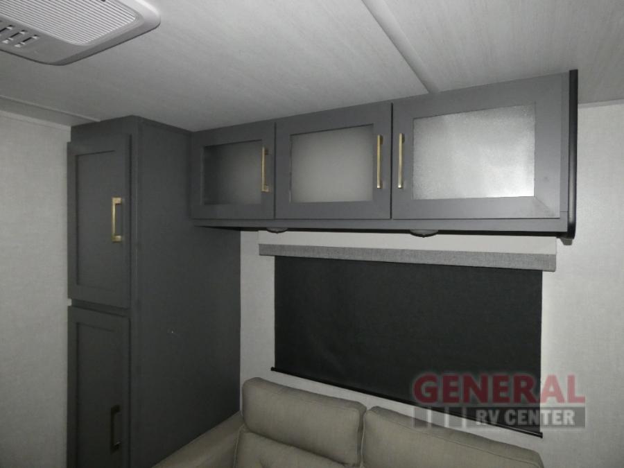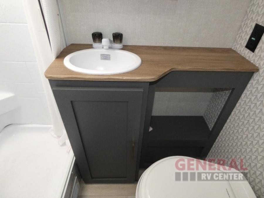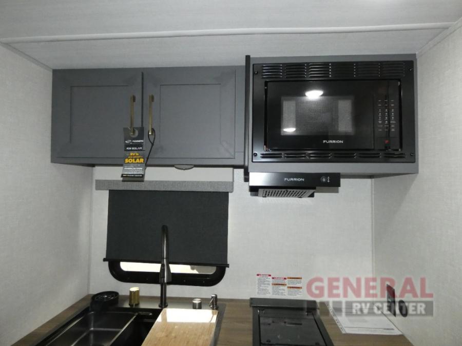 Grab your hiking gear and hit the road in this no-slide travel trailer! The front queen bed will provide a comfortable place to rest your head each night, and the rear corner full bath will let you freshen up without having to use the camp's facilities. The full kitchen includes an all-in-one microwave and air fryer plus a refrigerator to keep food stocked. You'll find comfortable seating space on the jackknife sofa, and you can enjoy your morning coffee at the counter with two stools and a flip-up window! This unit also includes an outside kitchen to keep the fish fry odors outside!