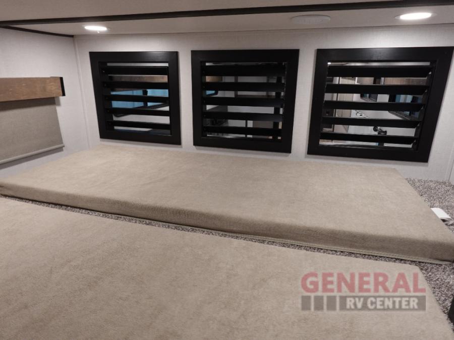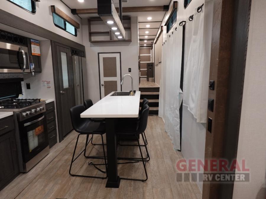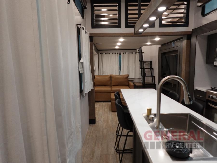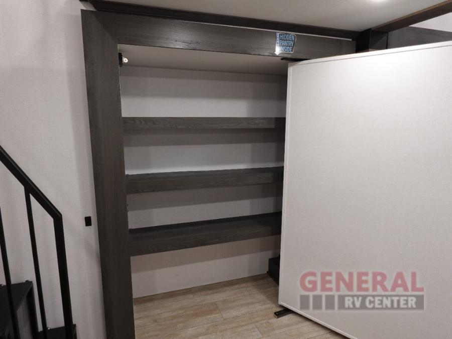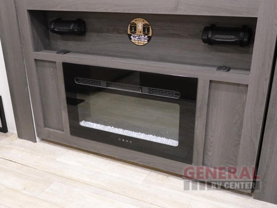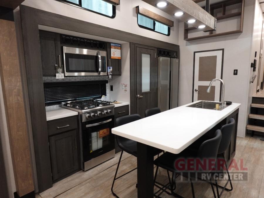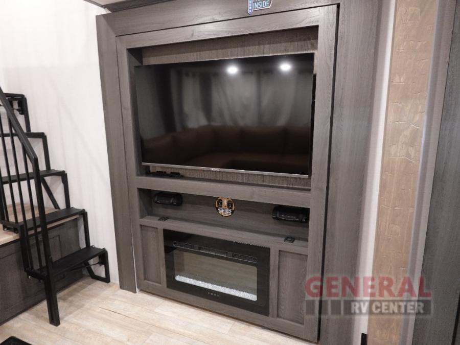 Plan to stay awhile in this four slide out fifth wheel! There is a triple-slide patio door that opens into the kitchen, complete with a kitchen island, walk-in pantry and 16 cu. ft. 12V refrigerator, and a convenient half bath with storage. There are reclining theater seats with a chaise lounge across from an entertainment center and fireplace with hidden storage behind. The fold-up steps lead up to the loft that includes two bunk mats, a wardrobe, cubby storage, plus two windows, which will make this space bright and open. The full bath towards the front includes washer/dryer prep, a walk-in shower with a skylight, and a linen closet to keep towels close by. And you'll love having your own bedroom up front with a king bed with Versa Tilt, a dresser with a bench, and a front wardrobe to keep your clothes wrinkle-free!
