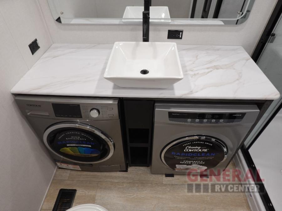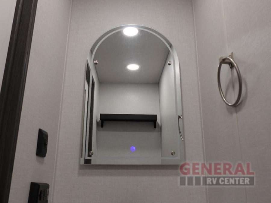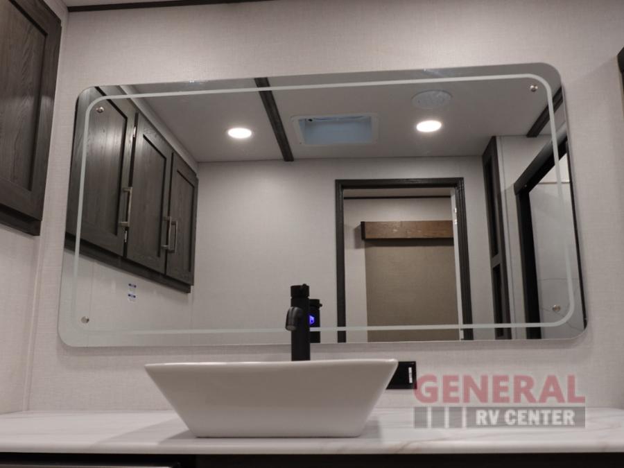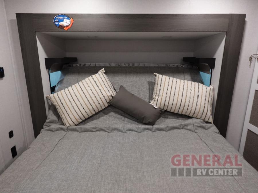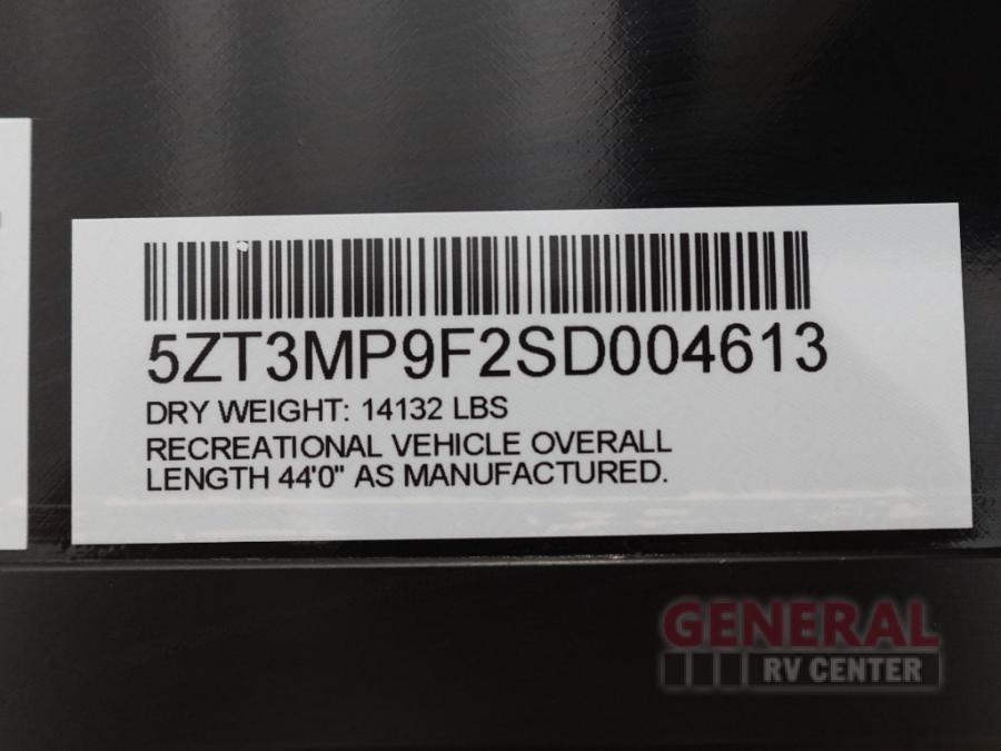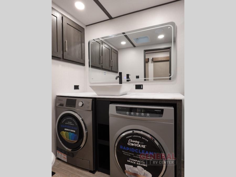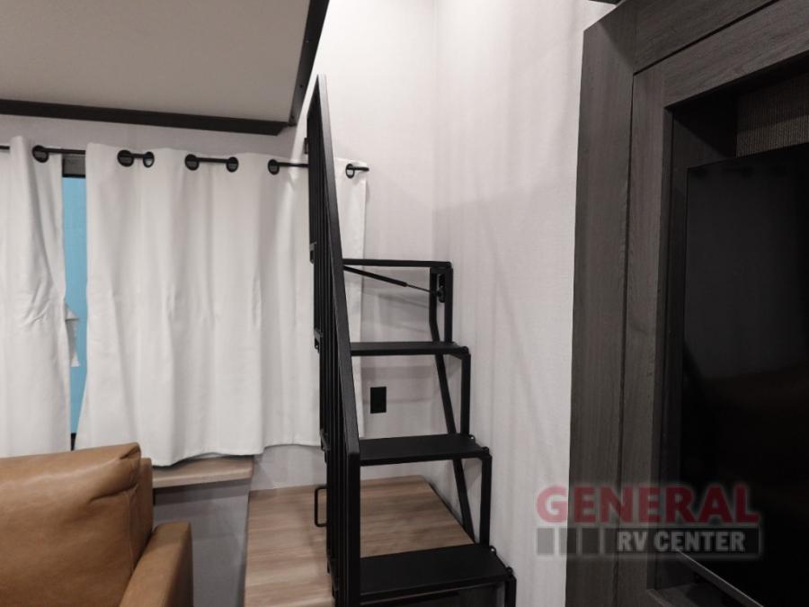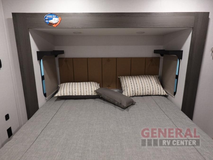 Plan to stay awhile in this four slide out fifth wheel! There is a triple-slide patio door that opens into the kitchen, complete with a kitchen island, walk-in pantry and 16 cu. ft. 12V refrigerator, and a convenient half bath with storage. There are reclining theater seats with a chaise lounge across from an entertainment center and fireplace with hidden storage behind. The fold-up steps lead up to the loft that includes two bunk mats, a wardrobe, cubby storage, plus two windows, which will make this space bright and open. The full bath towards the front includes washer/dryer prep, a walk-in shower with a skylight, and a linen closet to keep towels close by. And you'll love having your own bedroom up front with a king bed with Versa Tilt, a dresser with a bench, and a front wardrobe to keep your clothes wrinkle-free!