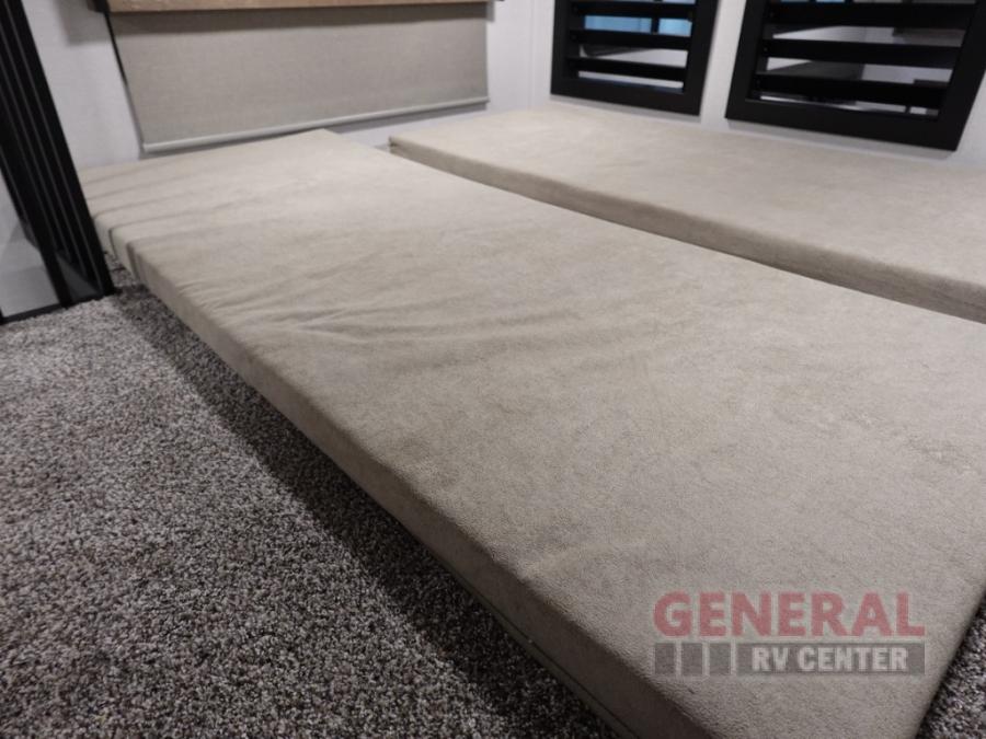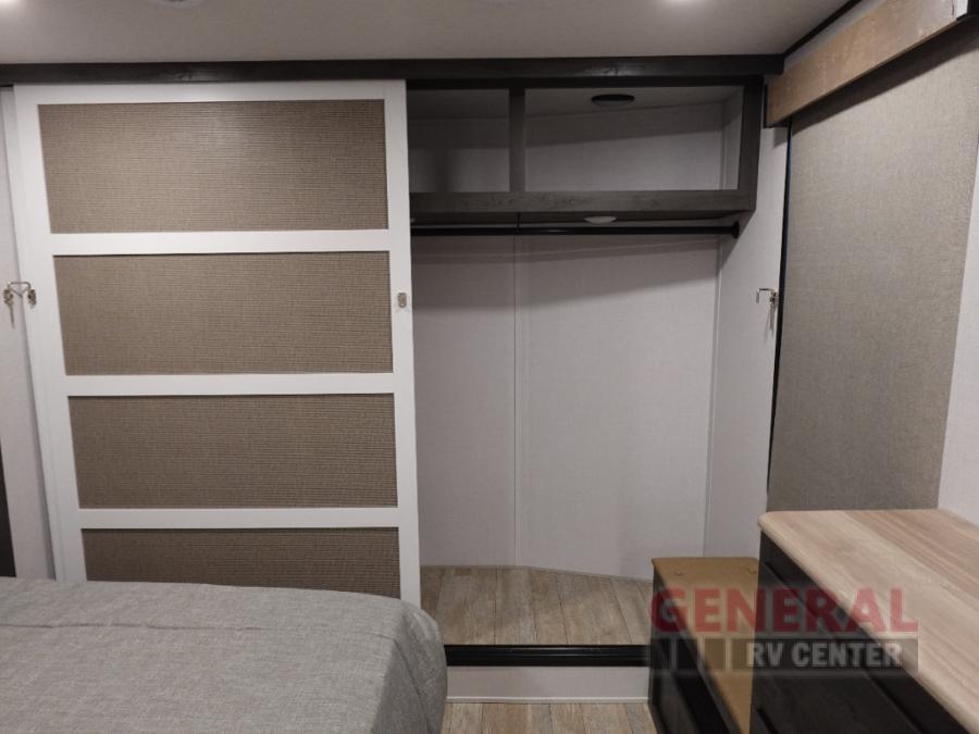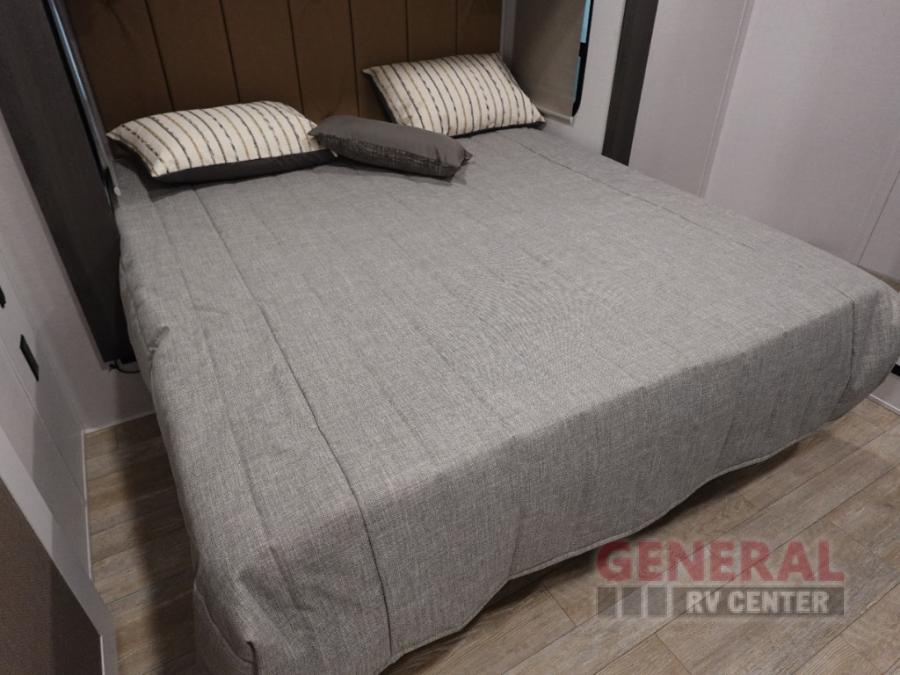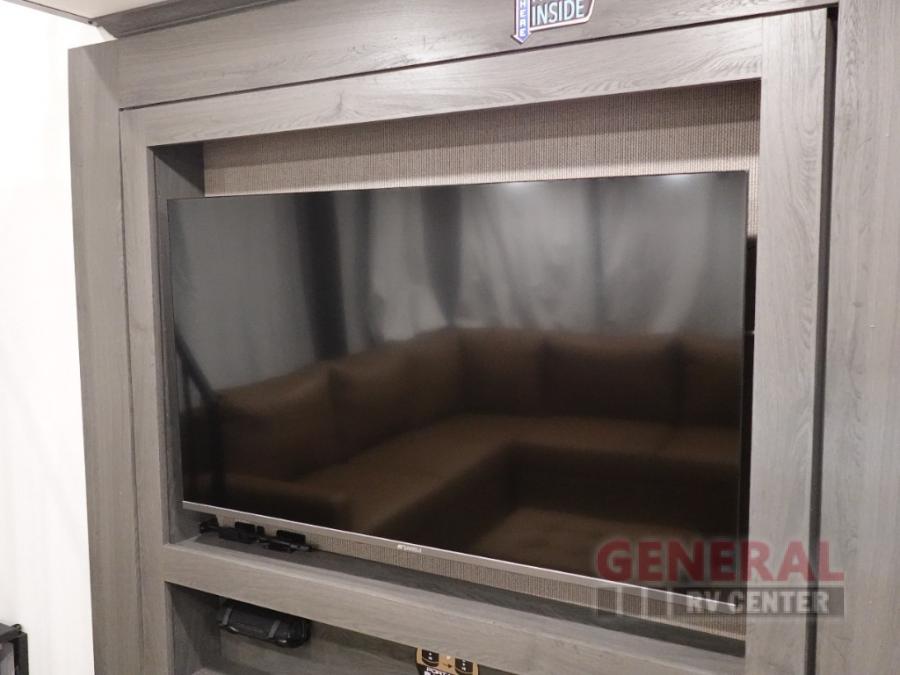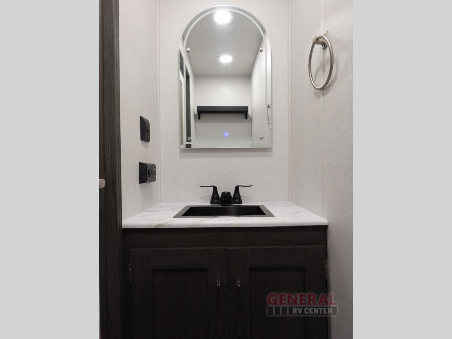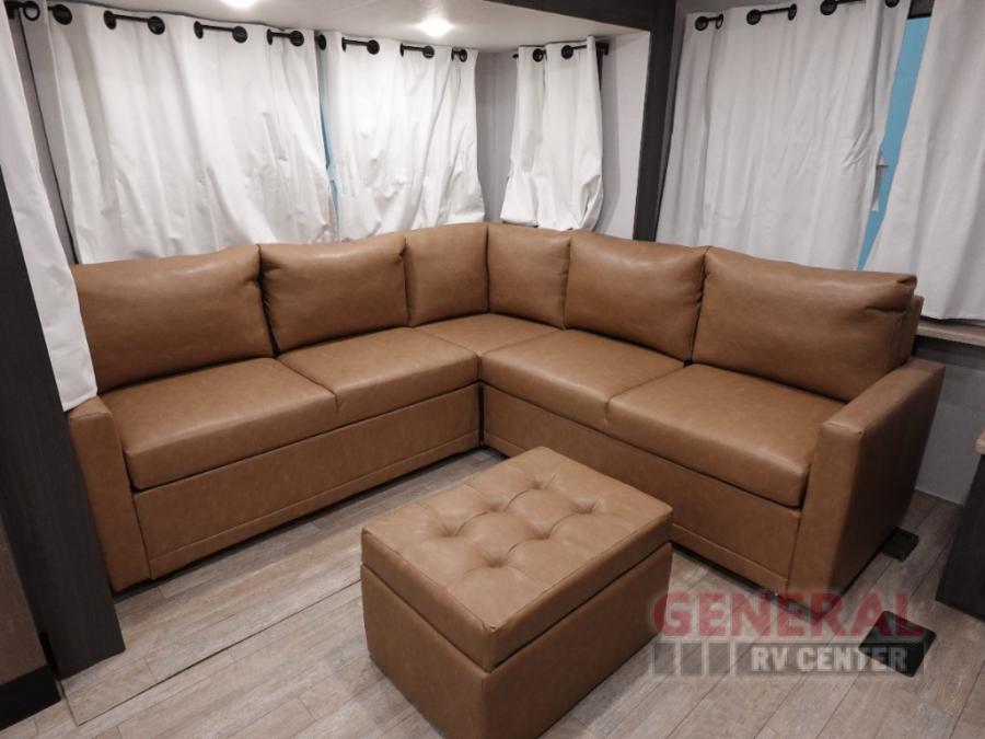 With any Impression mid-profile fifth wheel by Forest River, the focus of the design is comfort and value, built with quality craftsmanship and attention to customer's desires in each Impression! The exterior includes upgraded E-rated MAXXIS tires, custom exterior graphics package, and insulated slam latch baggage doors. There is also an enclosed docking station, an outside shower, and a 100W roof solar panel for off-grid capabilities. The fully heated and enclosed AccessiBelly has removable underbelly panels and offers four seasons of travel, and there is an industry leading 15K A/C plus 35K BTU furnace to keep you comfortable. The interior has lumbercore cabinetry, residential linoleum, residential backsplash in the kitchen, and oversized opening windows in the living area for more natural lighting and good air flow.