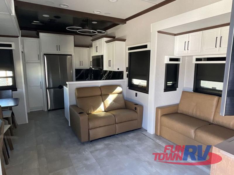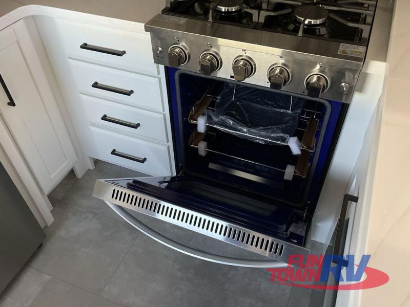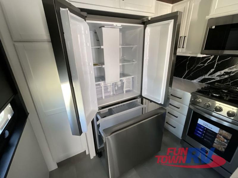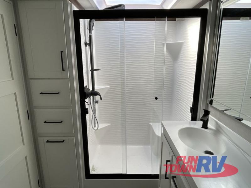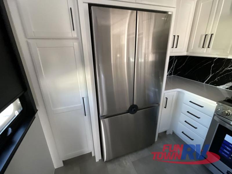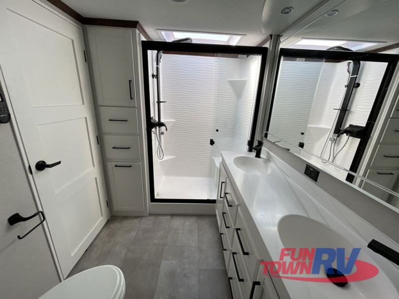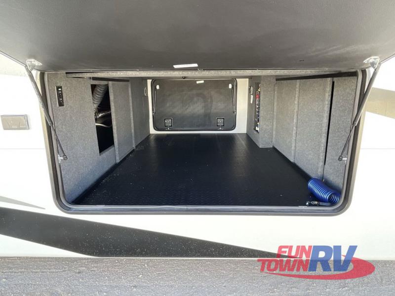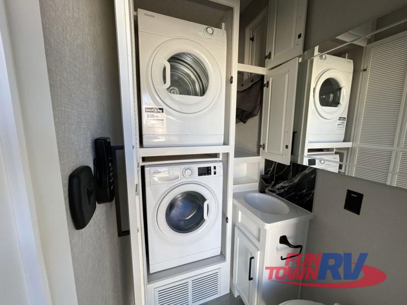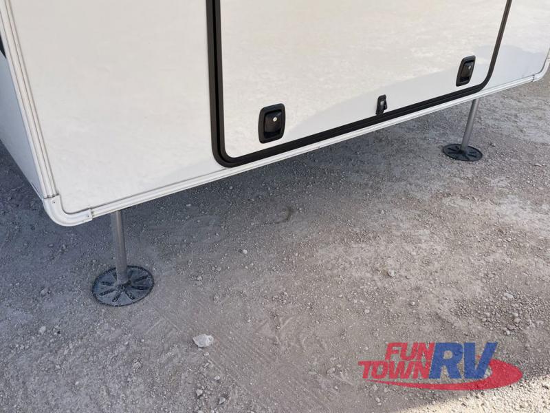 The Forest River RiverStone fifth wheels and toy haulers are luxurious units that have it all! You'll find an automatic six-point hydraulic level-up system to keep your unit in place, and there is preparation for a four-camera observation system. The TravlFi Journey XTR 4G/LTE router and WiFi extender will help you stay connected to the outside world, and you'll never have to overpack again since the Splendid “Astral” stackable washer and dryer will let you clean the small amount of clothes you've brought with you. Another high luxury is the Fischer Paykal dishwasher which will allow you to spend more time enjoying your camp life and less time cleaning up. Each unit is built with an LCI Road Armour suspension system, dual-pane frameless windows, a full docking station, a 200W solar panel, and a BMPro touch control system.