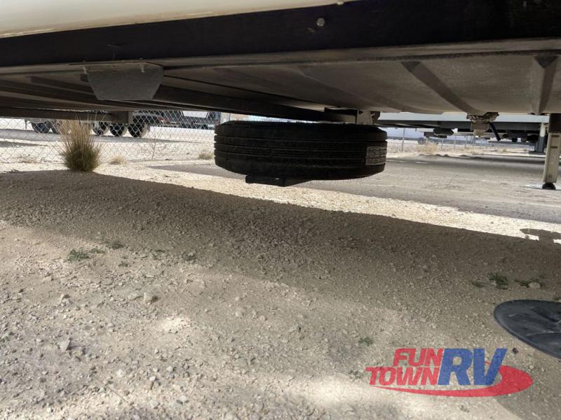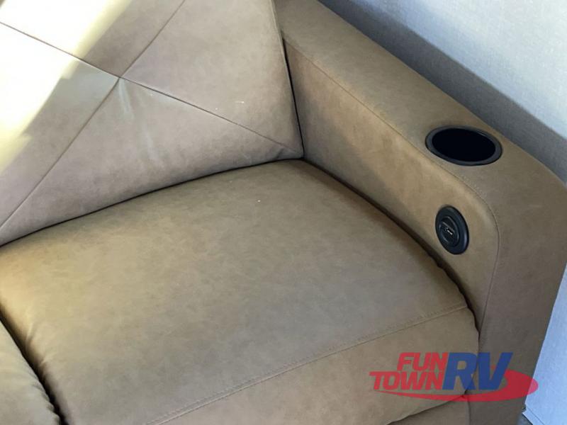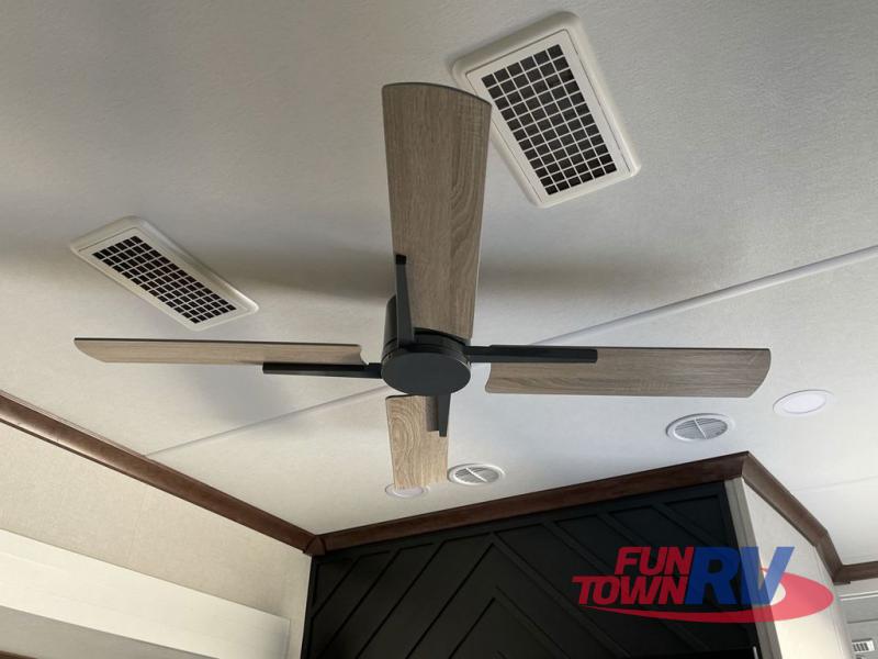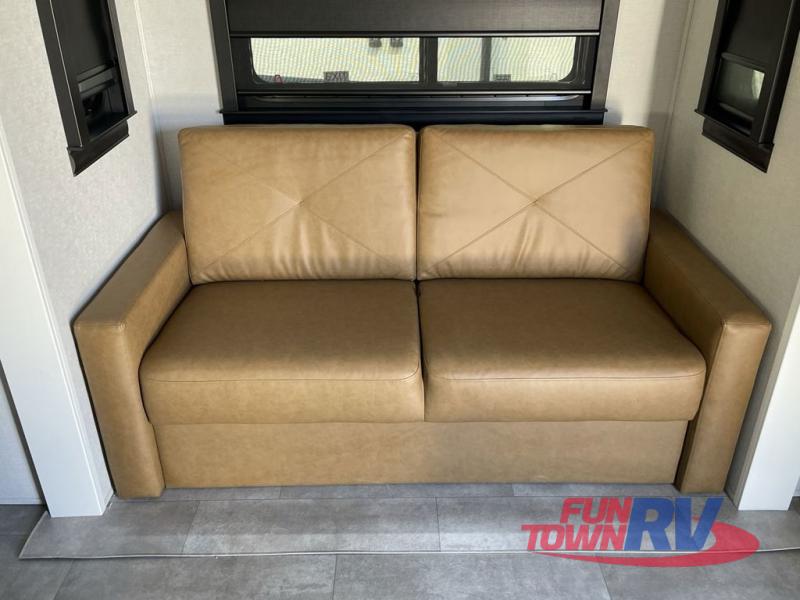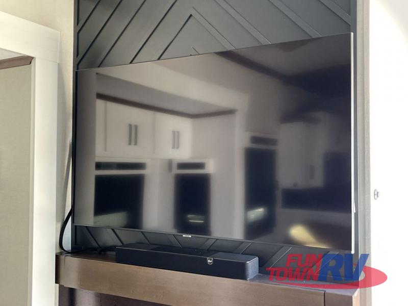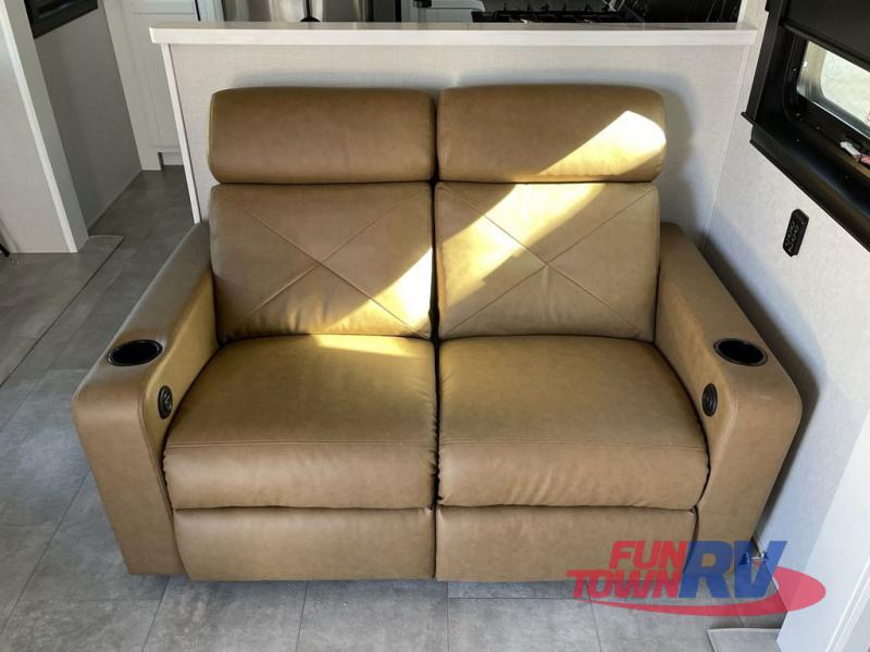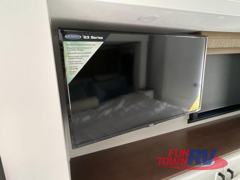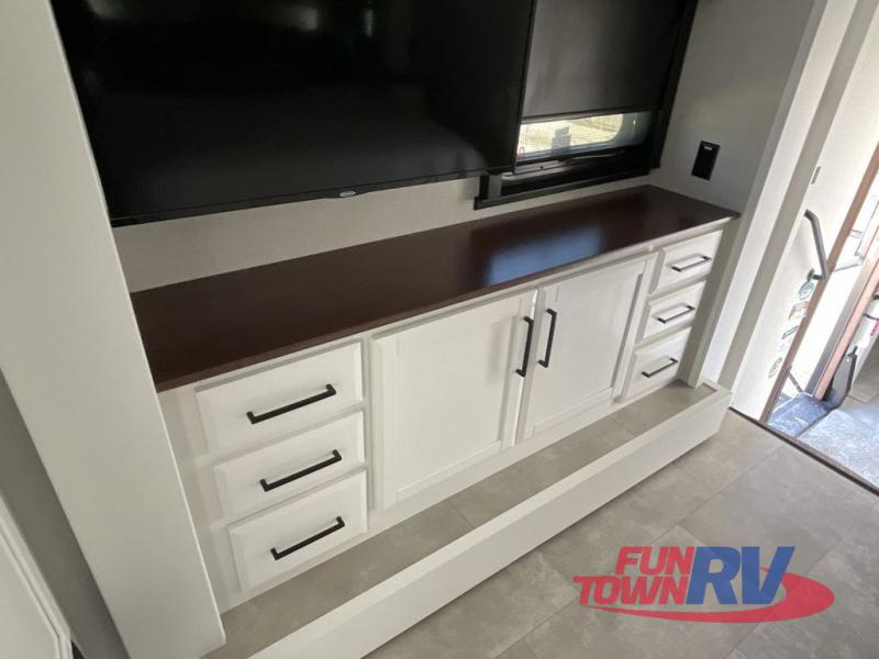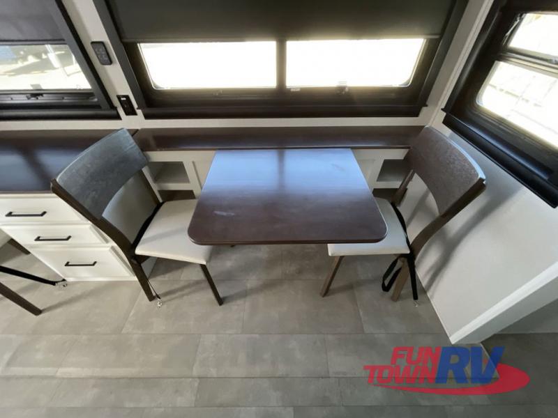 Show your family a good time with this RiverStone fifth wheel! You will get to stay in a super comfortable master suite at the front of this unit which has a dual-sink vanity in the full bathroom. The bedroom offers you a king-size bed that you can rest on while you watch the 40" LED TV across from you, and there is a half bathroom just outside the bedroom for your friends or family to use. If you've decided to bring work with you on the road, you'll be grateful to find a desk in the living area, and the pull-out dinette is a great place to sit down for meals. Work your magic in the kitchen and prepare something delicious on the four-burner range for everyone to eat.