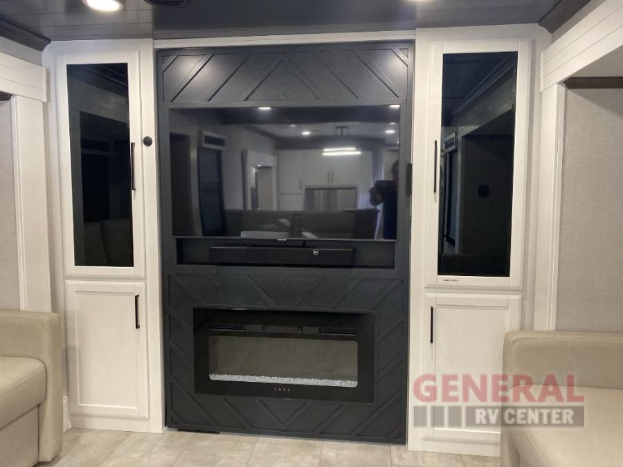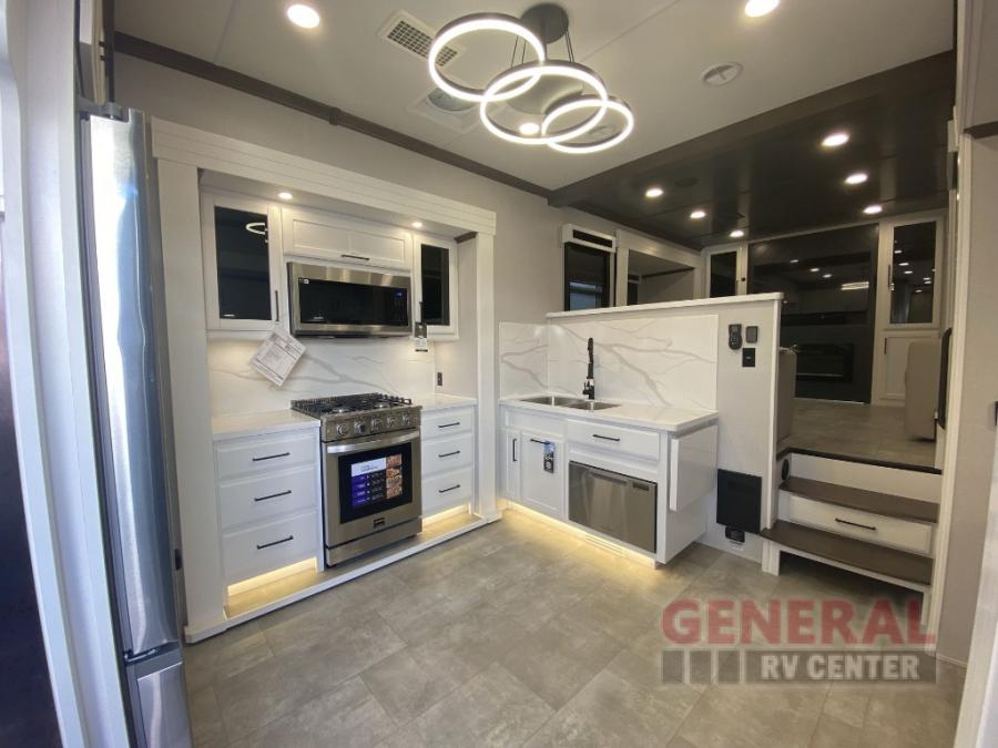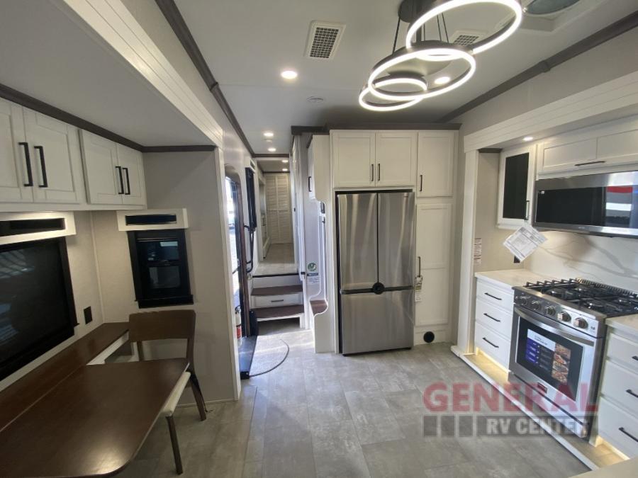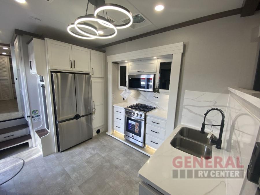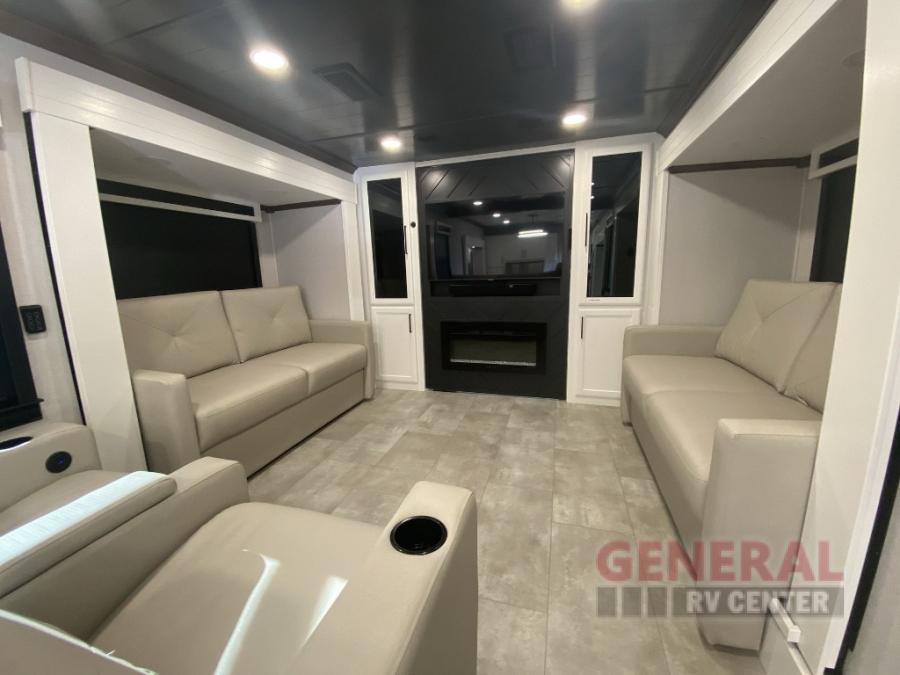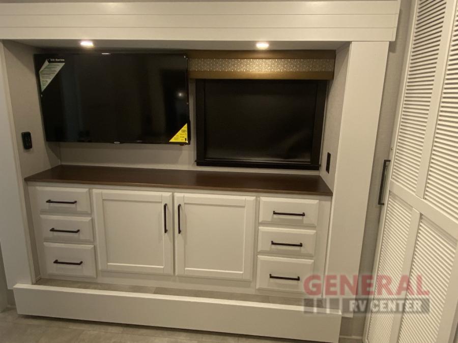 Pack your bags and head to your most comfortable camping trip ever in this packed out fifth wheel! The rear private bedroom has a 72" x 80" king bed slide for a good night's rest, a rear large wardrobe with the washer and dryer next to it, and even a dresser with a 40" LED TV. Get ready in the full bathroom with the shower then head to either the pull-out dinette to read the morning paper or whip up some scrambled eggs on the three burner cooktop in the middle kitchen. The kitchen even has two pantries for all your favorite snacks and a coat rack to hang your jacket. You can relax in the evenings on the two E-Z Glide sofa beds or the theater sofa across from the Samsung LED Smart TV. What's behind the swiveling entertainment center is where the real convenience is found with this model; a hidden front office with ample counter space to get your work done!
