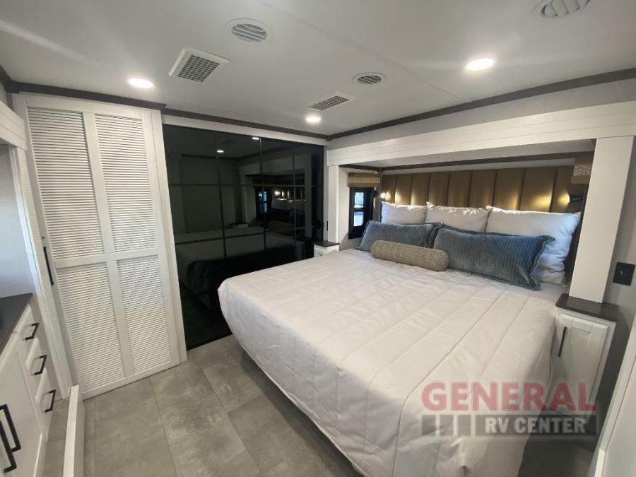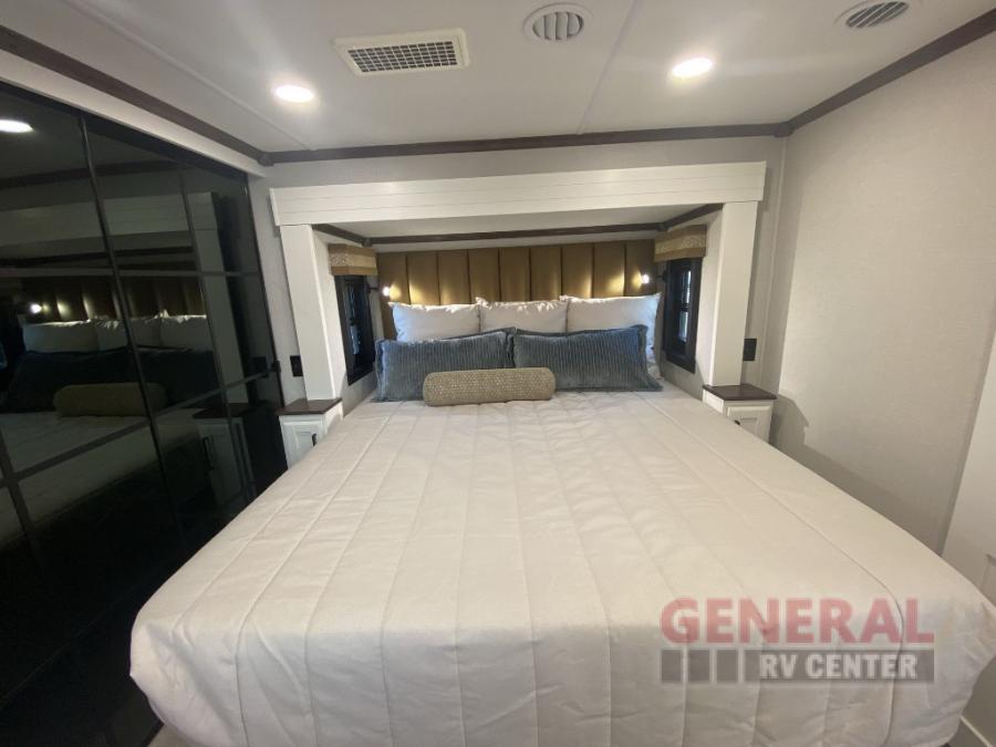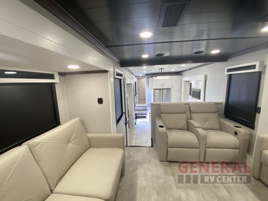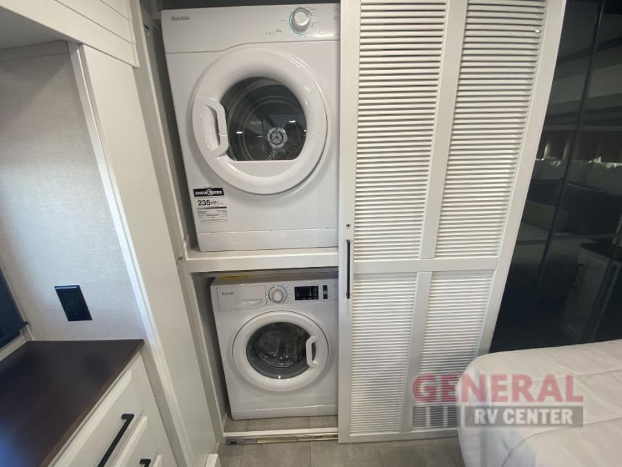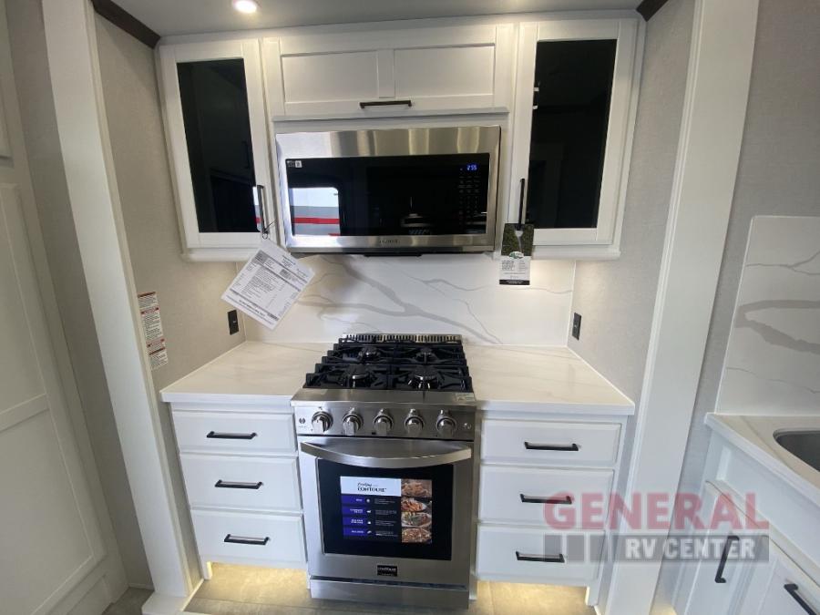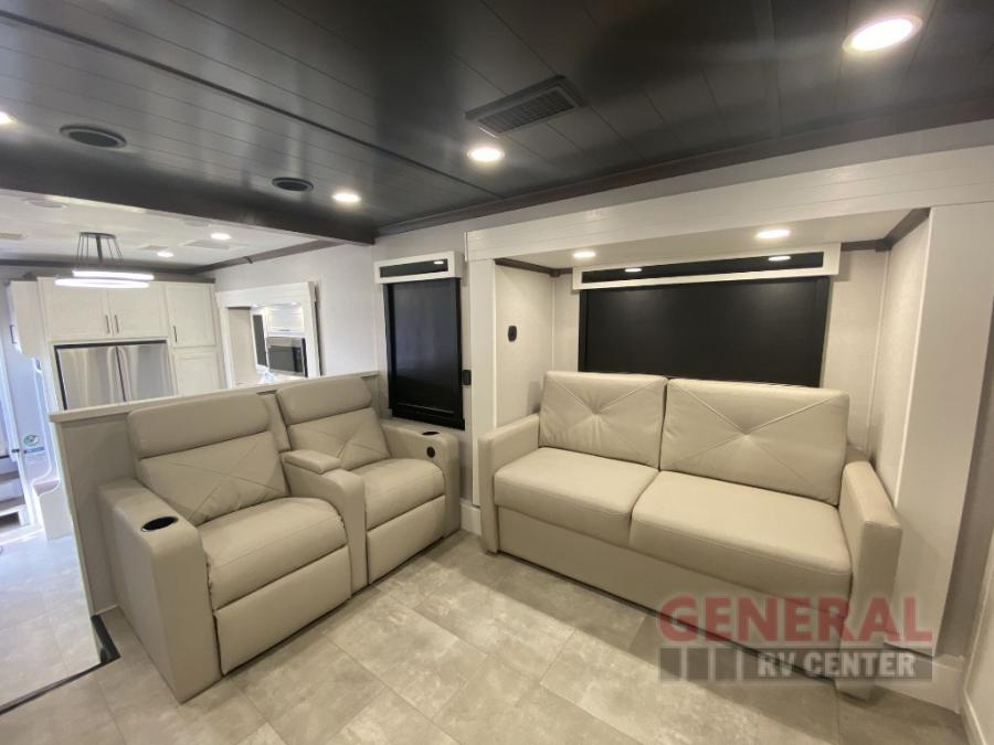 Pack your bags and head to your most comfortable camping trip ever in this packed out fifth wheel! The rear private bedroom has a 72" x 80" king bed slide for a good night's rest, a rear large wardrobe with the washer and dryer next to it, and even a dresser with a 40" LED TV. Get ready in the full bathroom with the shower then head to either the pull-out dinette to read the morning paper or whip up some scrambled eggs on the three burner cooktop in the middle kitchen. The kitchen even has two pantries for all your favorite snacks and a coat rack to hang your jacket. You can relax in the evenings on the two E-Z Glide sofa beds or the theater sofa across from the Samsung LED Smart TV. What's behind the swiveling entertainment center is where the real convenience is found with this model; a hidden front office with ample counter space to get your work done!