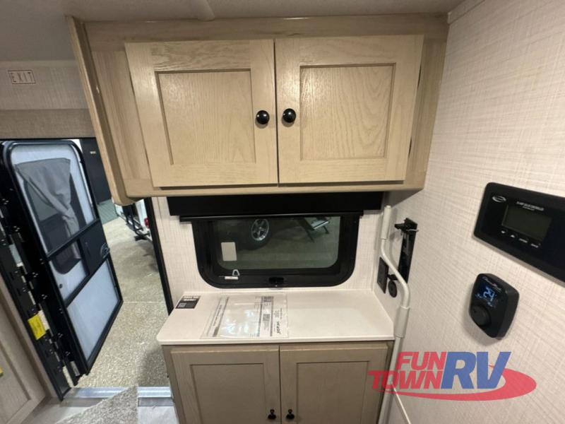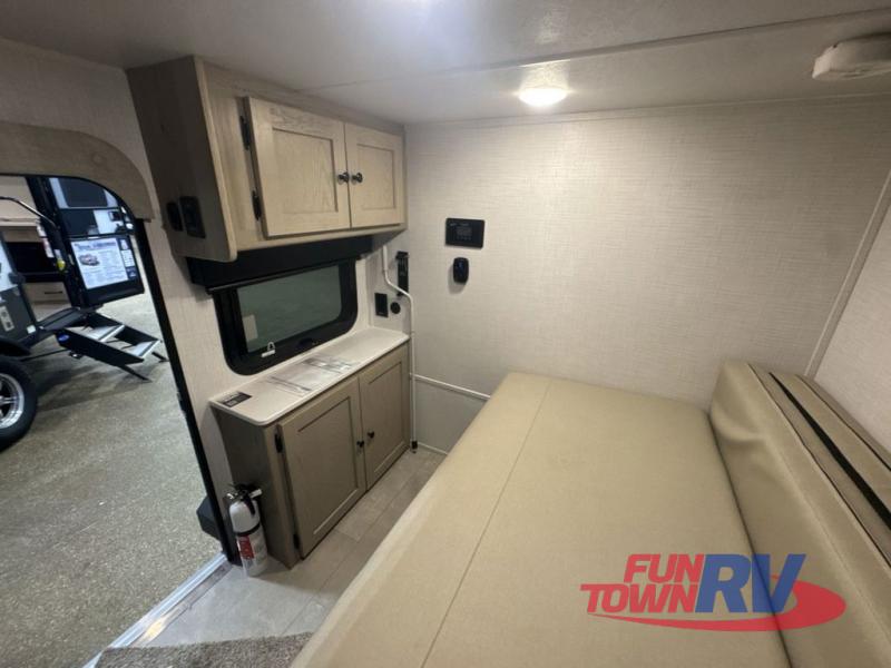 This is the perfect trailer to take on weekend trips to the lake! You'll enjoy a gaucho bed that can convert to your sleeping space at night, and there is a wardrobe to keep your clothes tidy. There is also a shelf here for more storage space! The outside kitchen includes a 12V refrigerator and a convection microwave, plus a griddle to cook meals on.