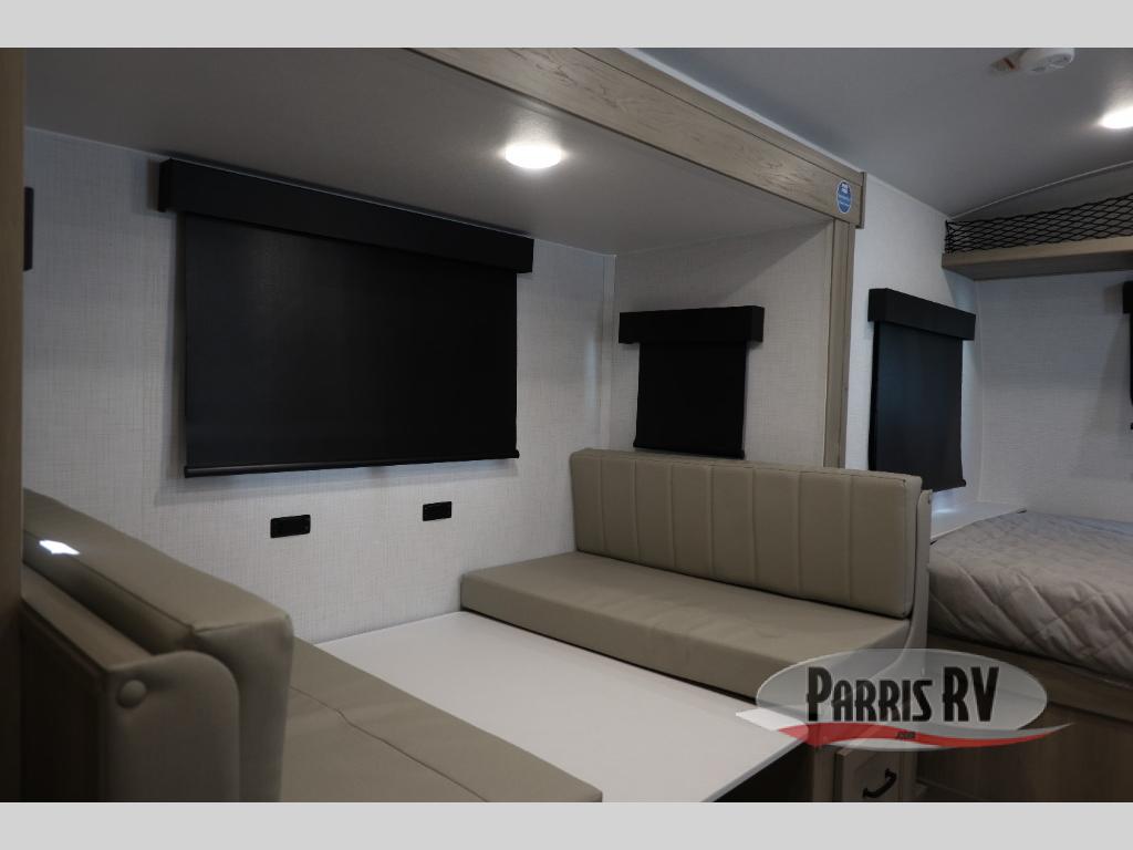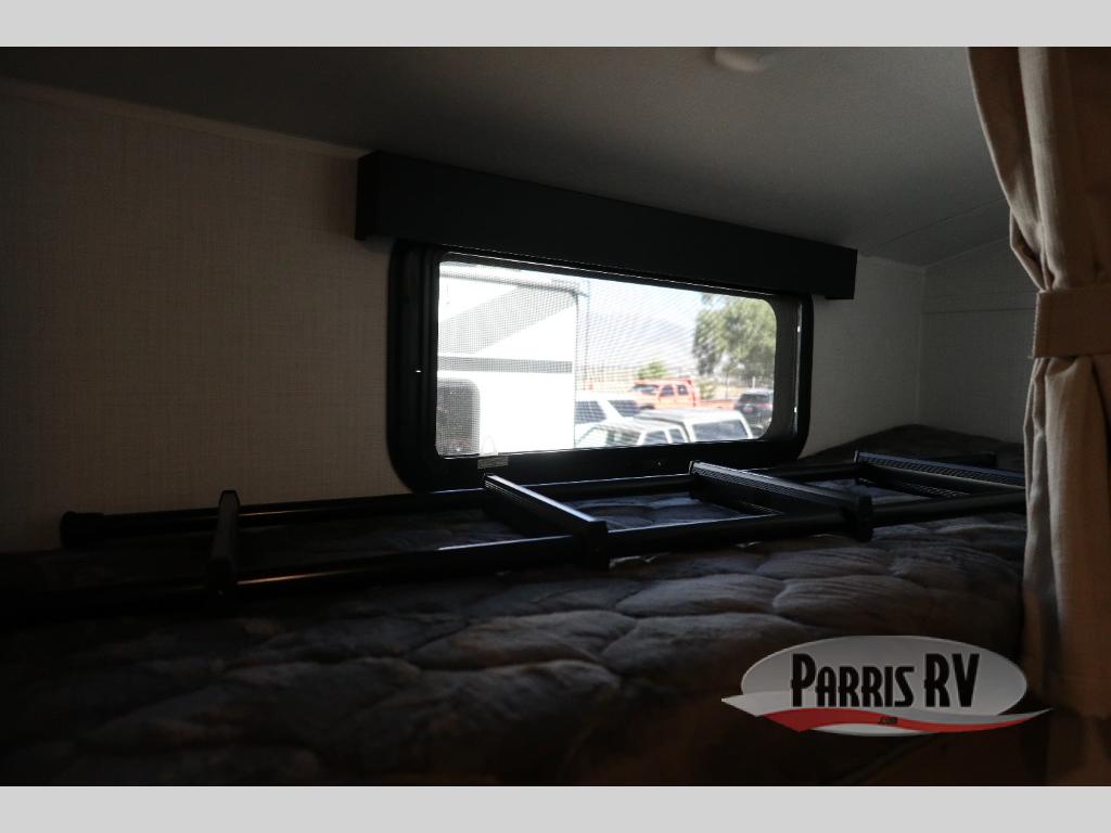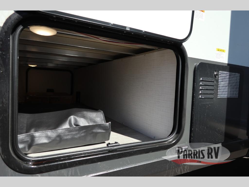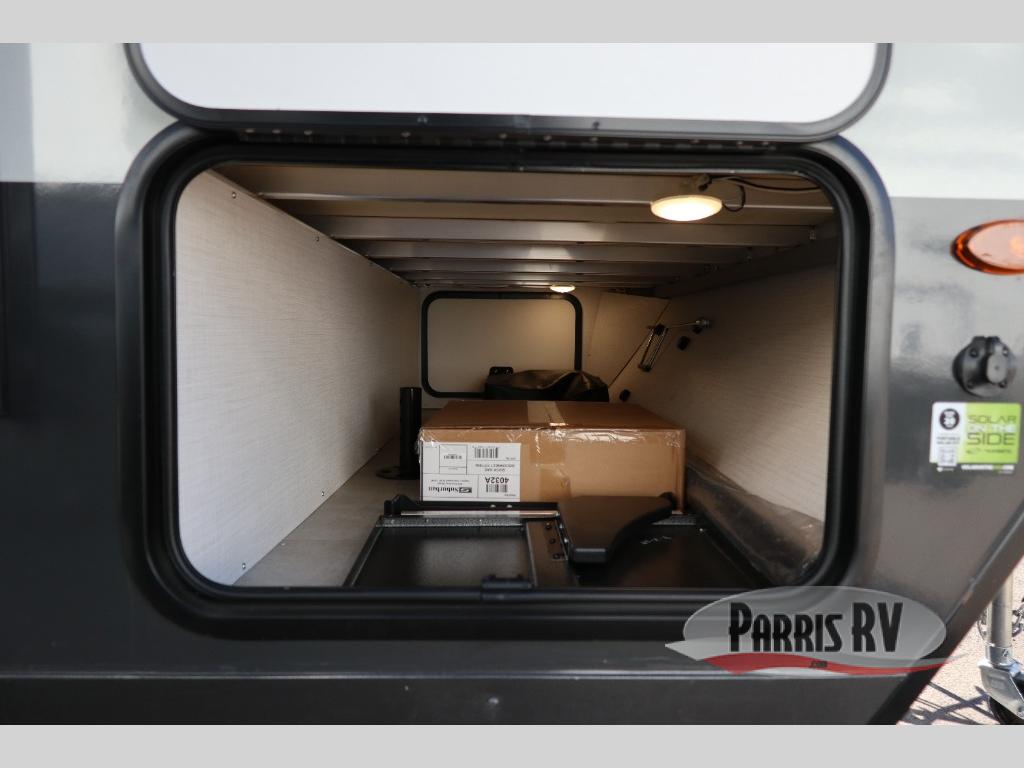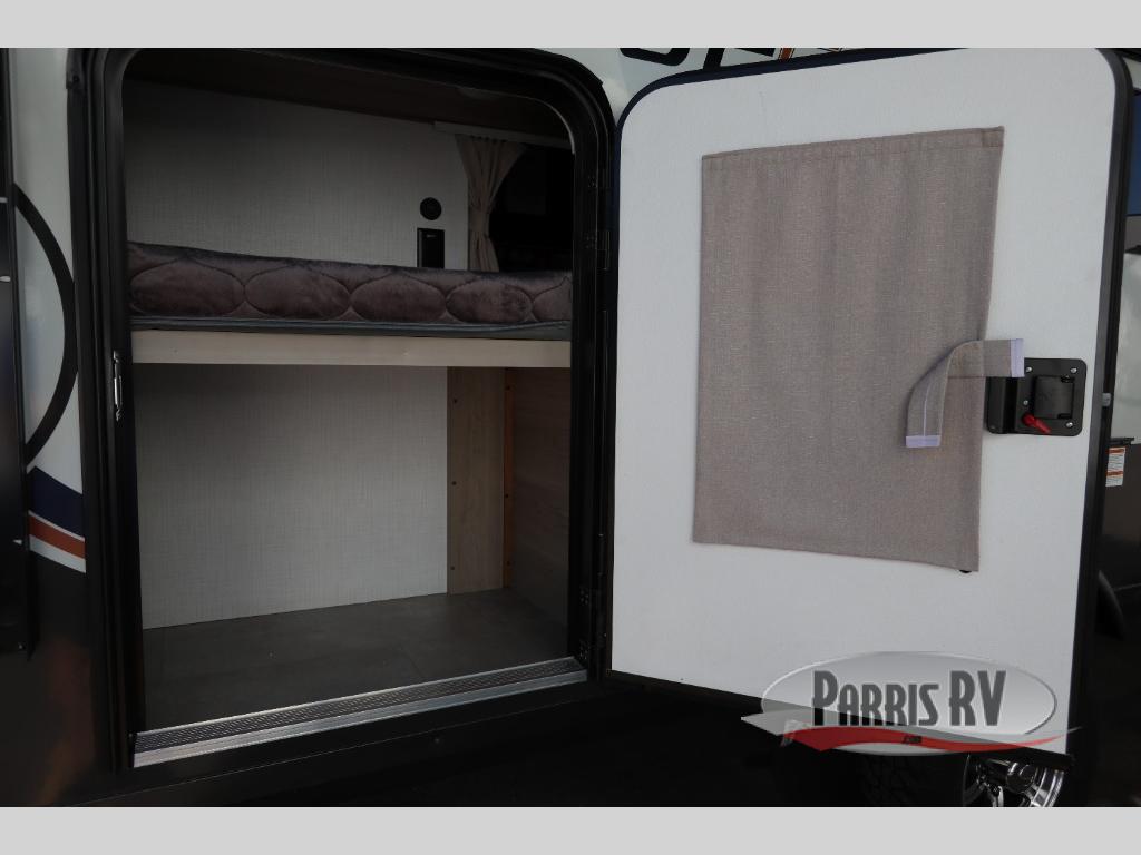 You're going to love camping with your family or friends in this spacious bunk model! The bunk beds will be perfect for little ones, while you take the front full-size bed. There is also a 44" booth dinette within the slide out for additional sleeping and seating space. The kitchen includes everything the chef will need to prepare meals each day, including a recessed cooktop, microwave oven, and a 12V refrigerator for perishables. If the weather is nice, you may just find the chef outdoors cooking on the outside griddle under the 14' power awning. And check out the exterior bike door that will be perfect for bikes, luggage, or extra camp gear. The optional Power Package available on this model includes three 200W solar panels, a 460 Ah Mastervolt MLI lithium-ion battery, two smart remotes, and more off-grid features!