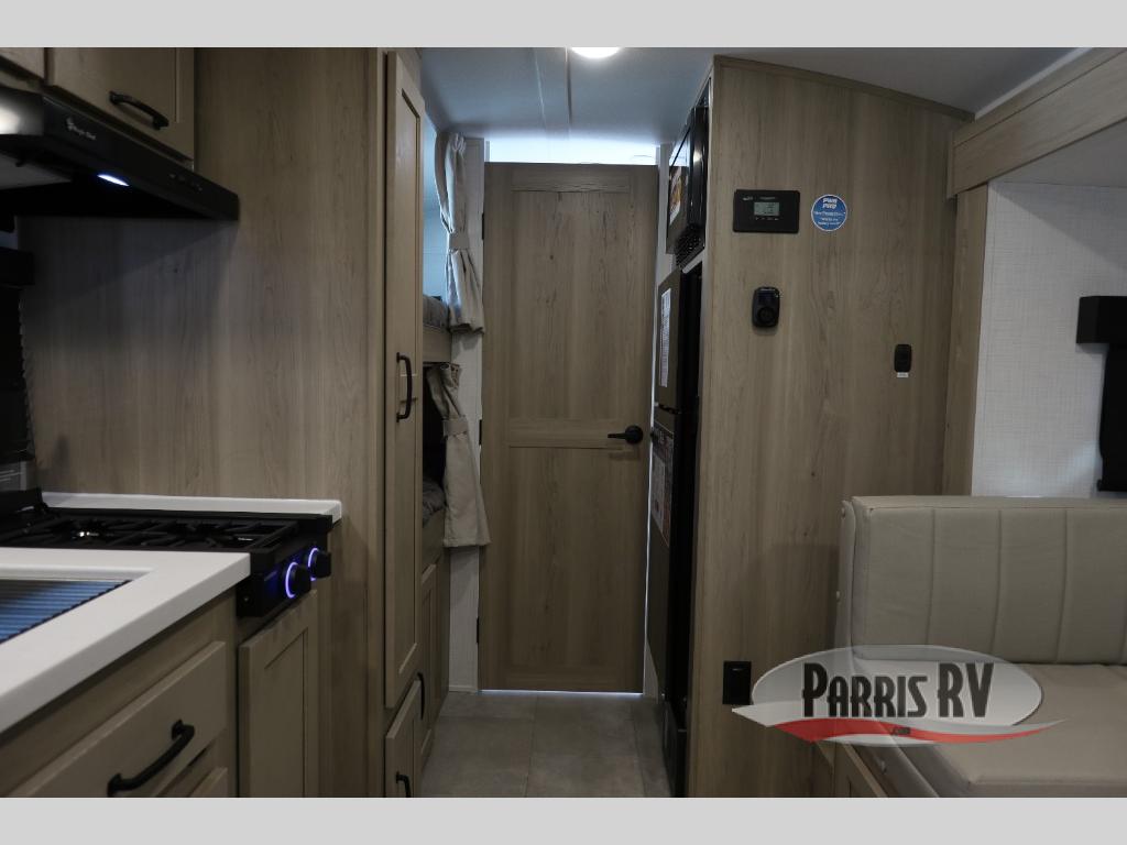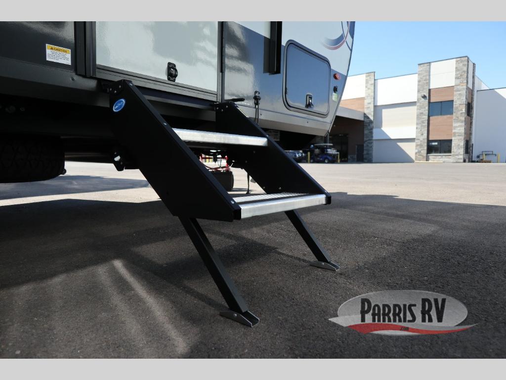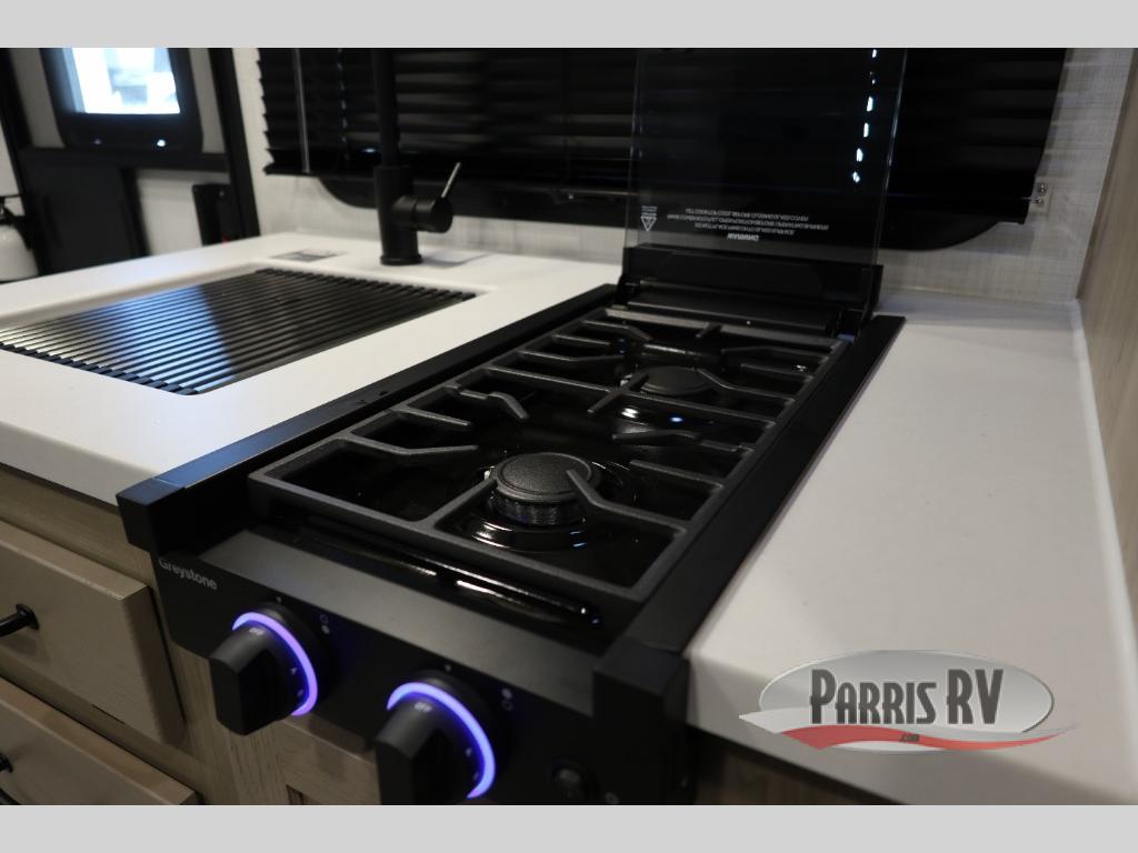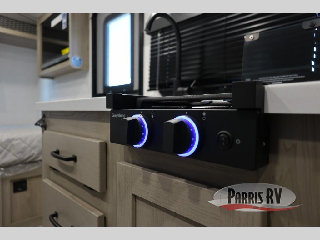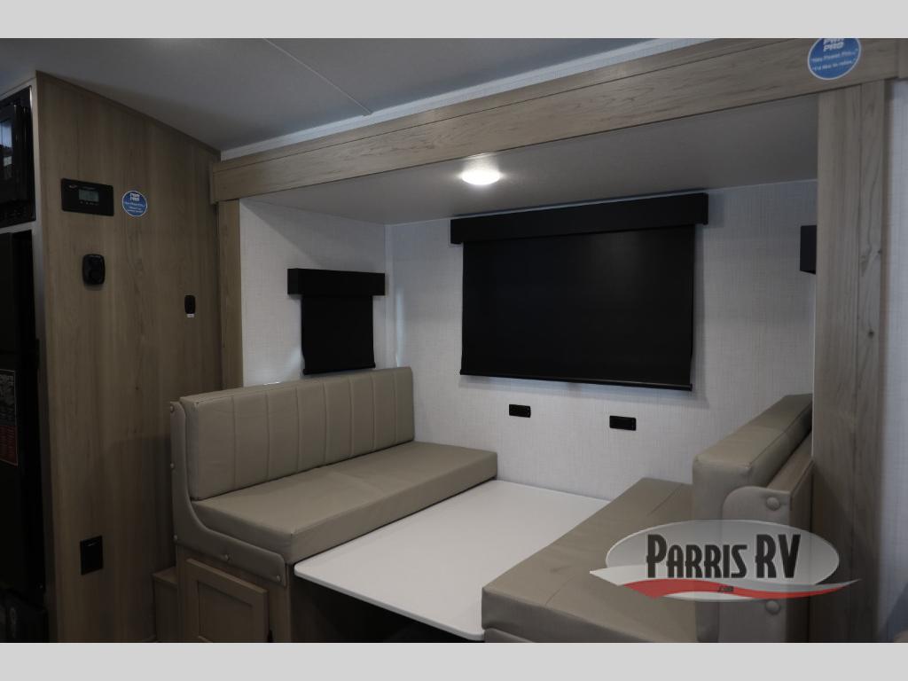 You're going to love camping with your family or friends in this spacious bunk model! The bunk beds will be perfect for little ones, while you take the front full-size bed. There is also a 44" booth dinette within the slide out for additional sleeping and seating space. The kitchen includes everything the chef will need to prepare meals each day, including a recessed cooktop, microwave oven, and a 12V refrigerator for perishables. If the weather is nice, you may just find the chef outdoors cooking on the outside griddle under the 14' power awning. And check out the exterior bike door that will be perfect for bikes, luggage, or extra camp gear. The optional Power Package available on this model includes three 200W solar panels, a 460 Ah Mastervolt MLI lithium-ion battery, two smart remotes, and more off-grid features!