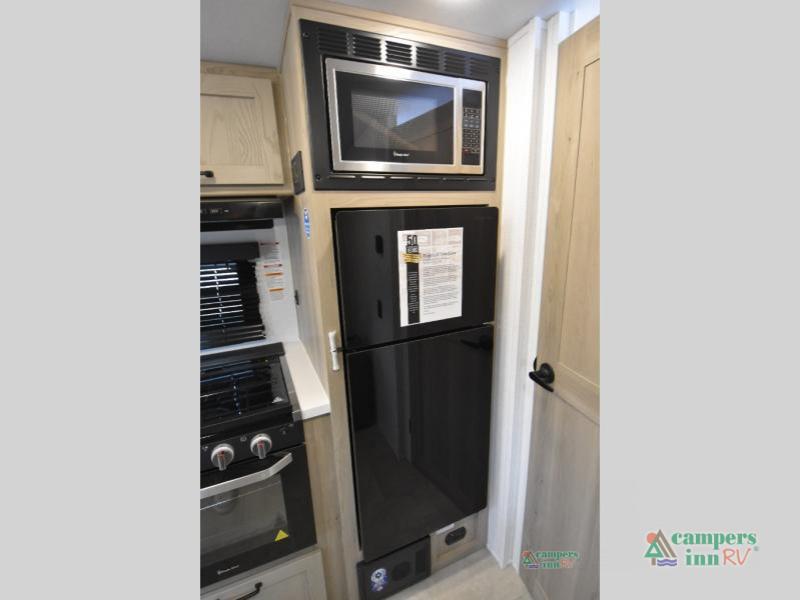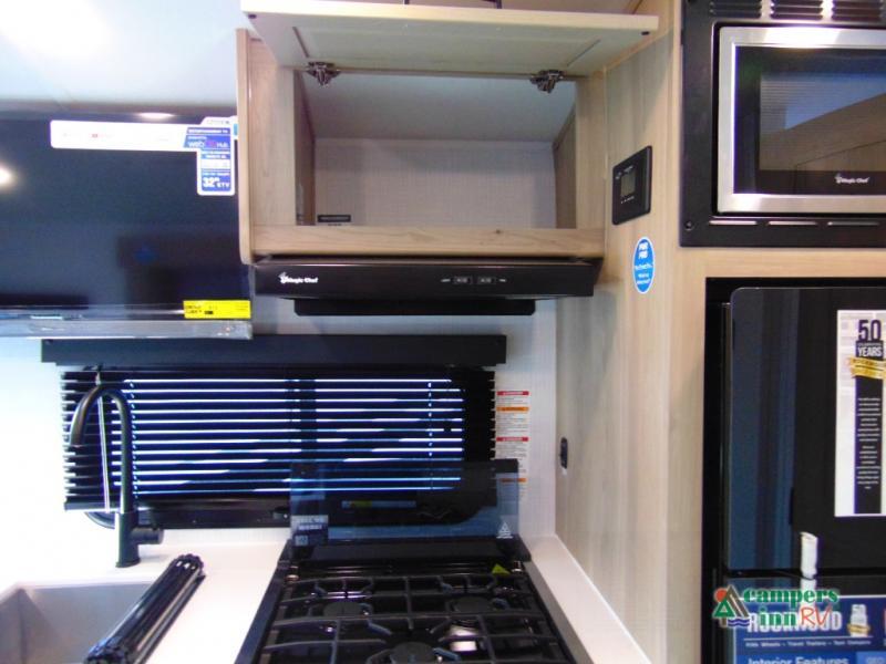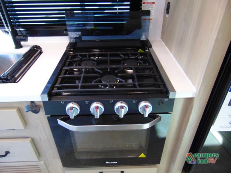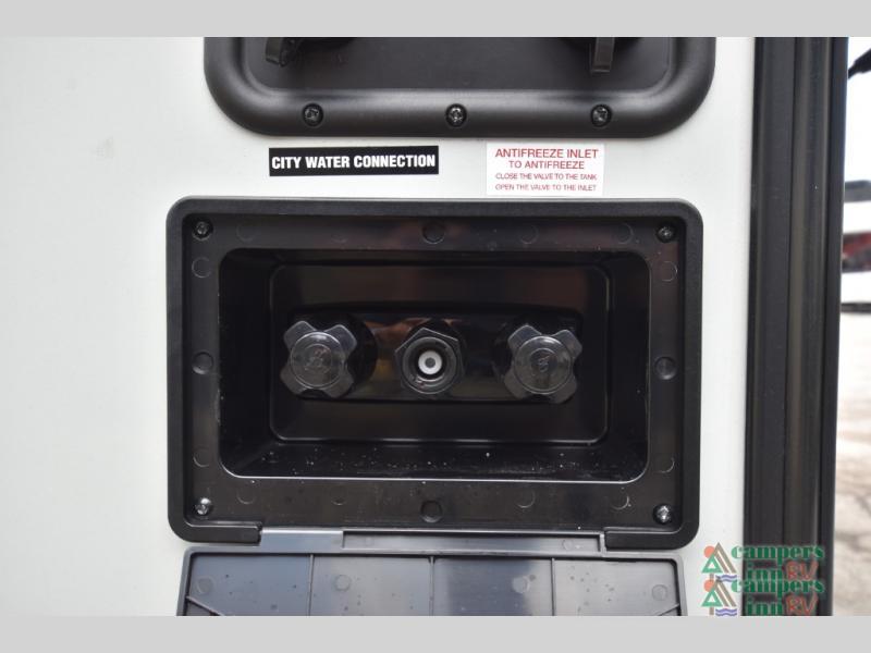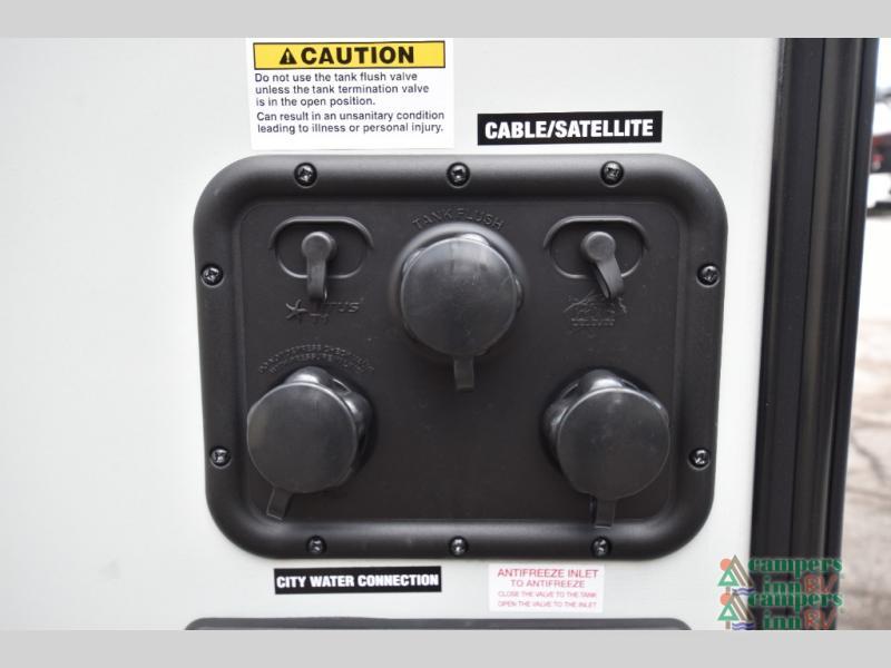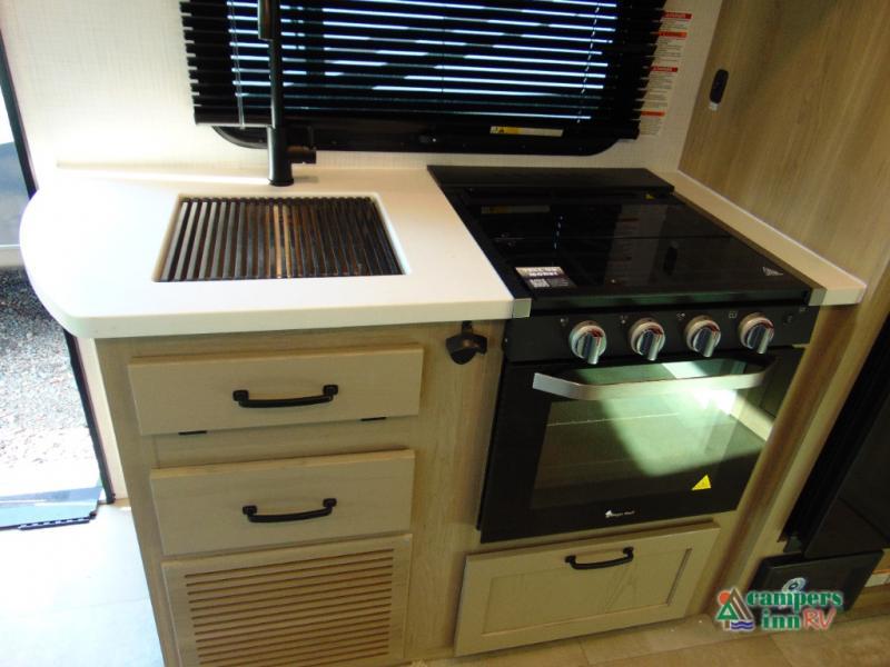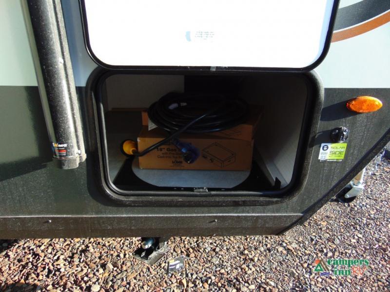 This travel trailer will feel more like home with its front bedroom and walk-around full-size bed. You'll enjoy the 32" 12V TV as you relax on the 72" sofa with a table and cupholders. The full rear bath includes a spacious shower to clean up in each day and there is a linen closet for clean towels. When you're ready to prepare dinner you'll have a three burner cooktop and microwave oven indoors, and a griddle outdoors! And don't forget the exterior storage allows you to bring along beach toys and tackle boxes. The optional Power Package available on this model includes three 200W solar panels, a side solar plug-in, a 3kW 160A inverter, and more off-grid features!