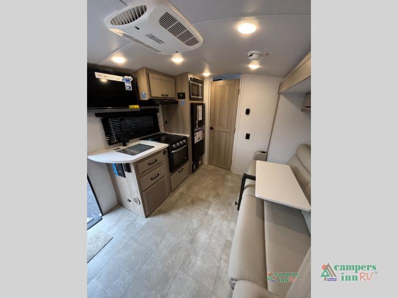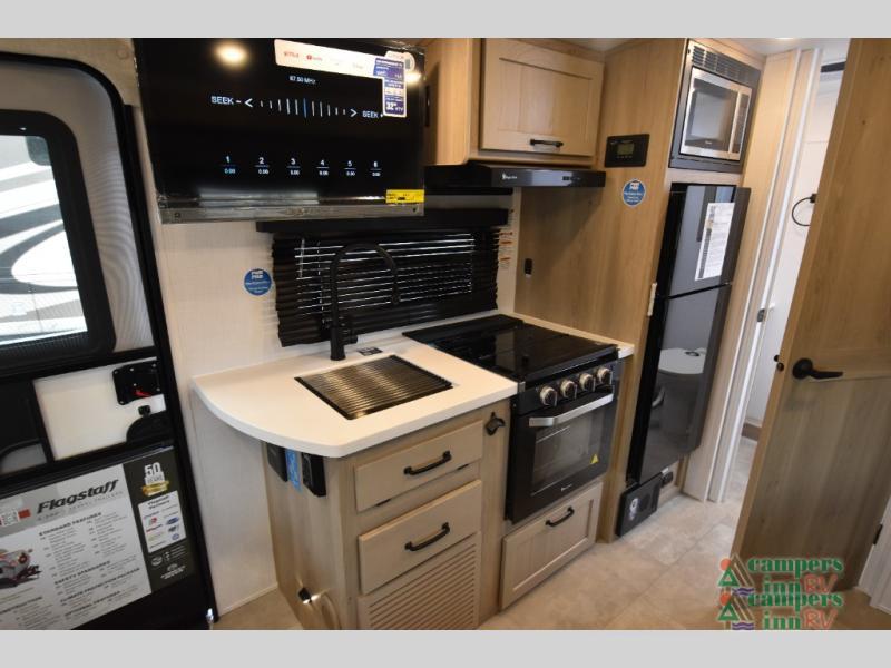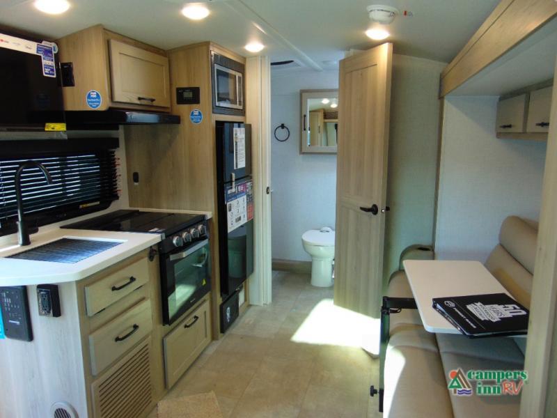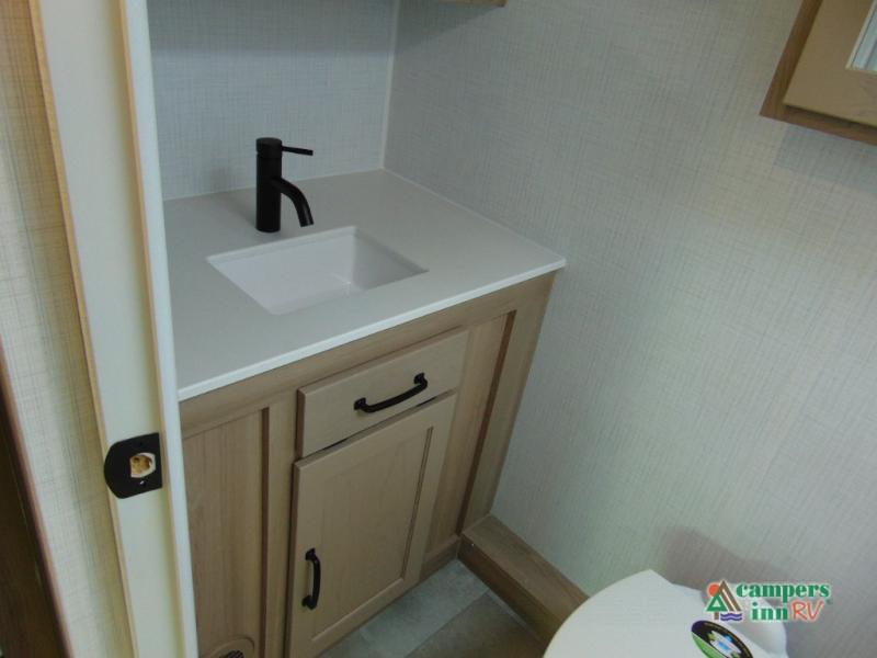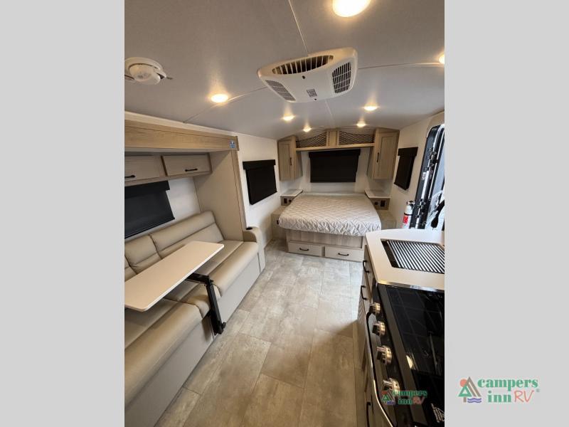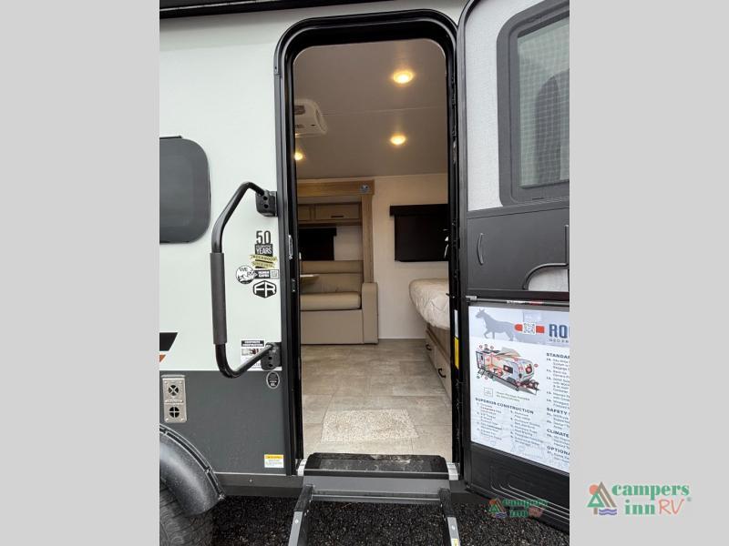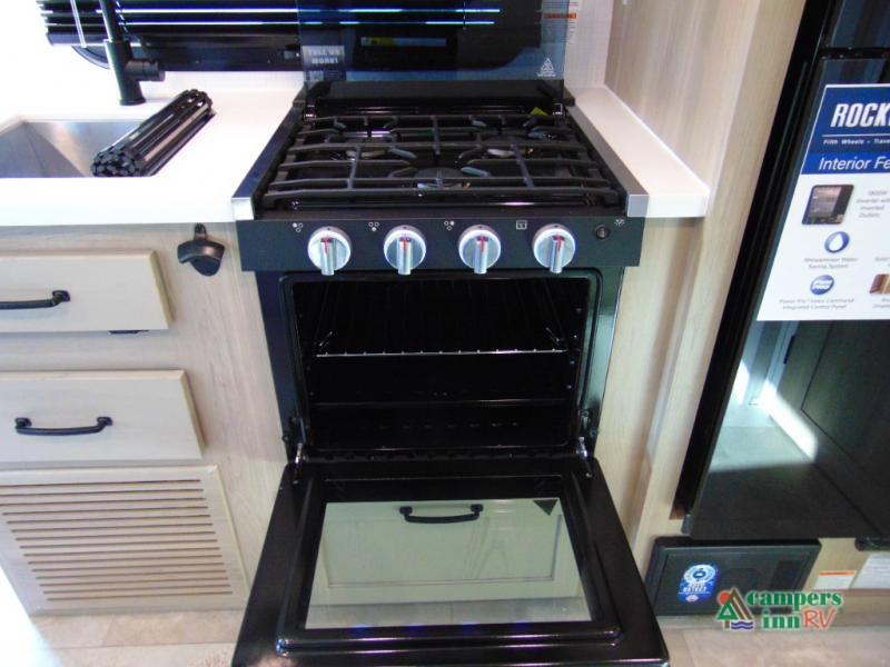 This travel trailer will feel more like home with its front bedroom and walk-around full-size bed. You'll enjoy the 32" 12V TV as you relax on the 72" sofa with a table and cupholders. The full rear bath includes a spacious shower to clean up in each day and there is a linen closet for clean towels. When you're ready to prepare dinner you'll have a three burner cooktop and microwave oven indoors, and a griddle outdoors! And don't forget the exterior storage allows you to bring along beach toys and tackle boxes. The optional Power Package available on this model includes three 200W solar panels, a side solar plug-in, a 3kW 160A inverter, and more off-grid features!