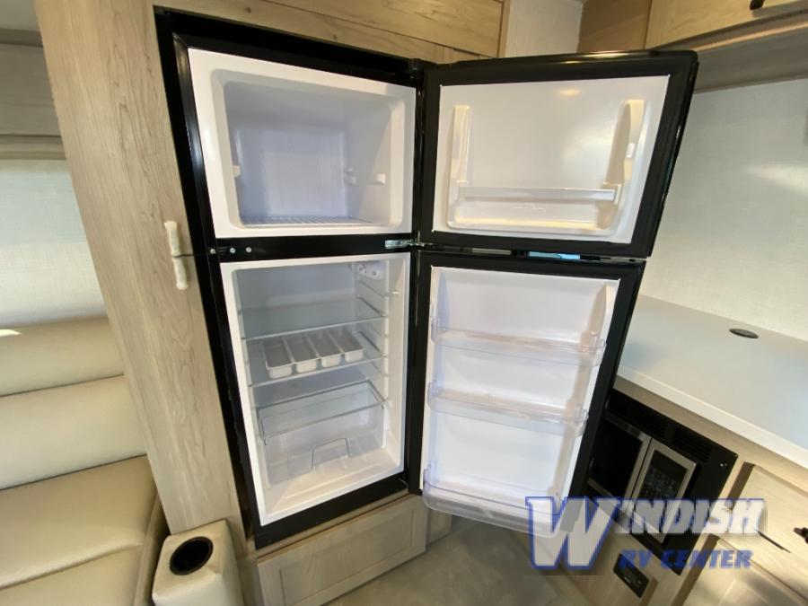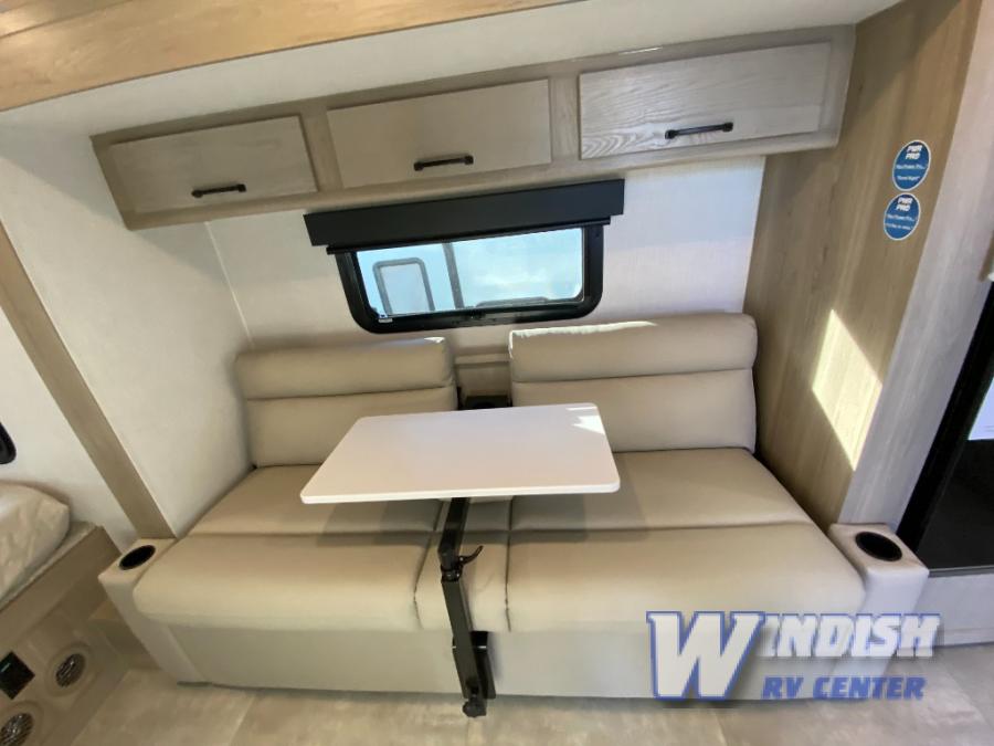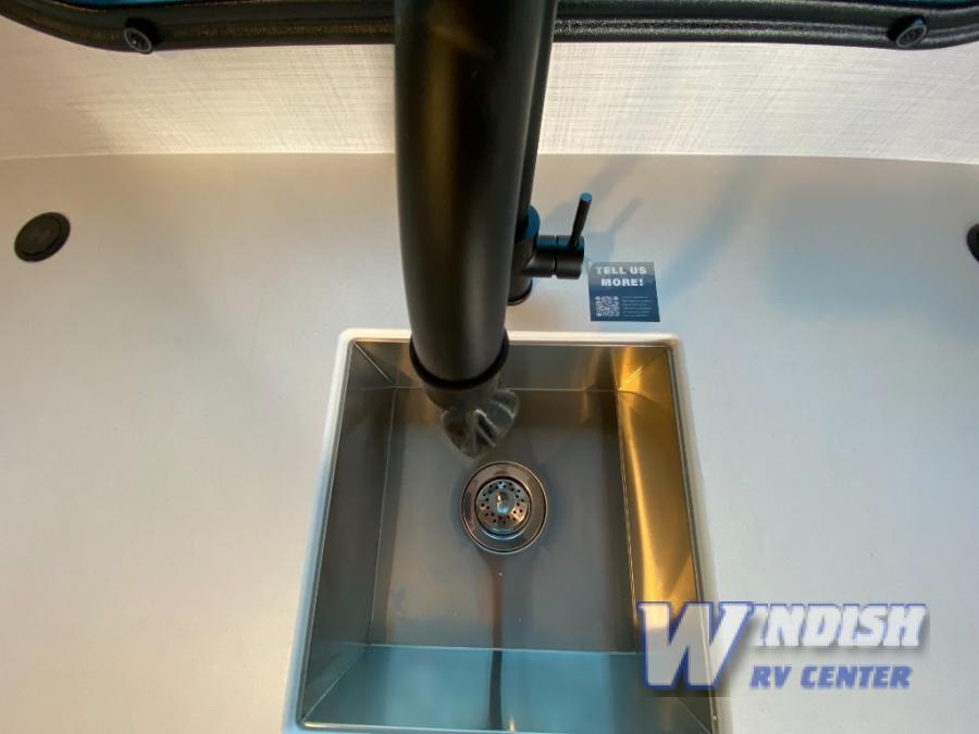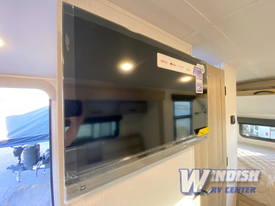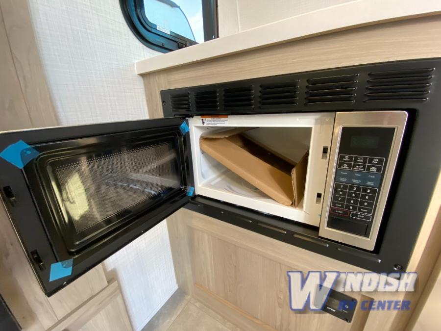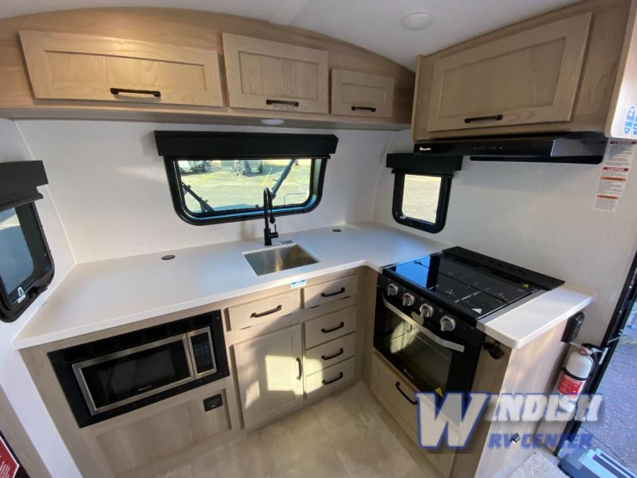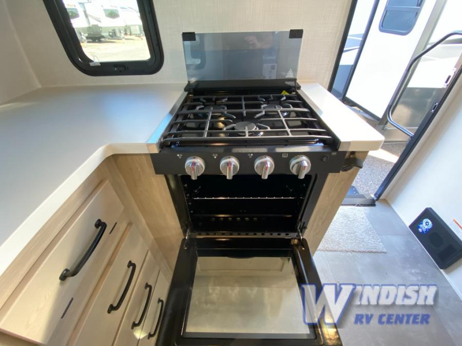 Are you looking for a lightweight trailer with at-home comforts? Take a look at this single slide out unit that can sleep three to four each night. There is a queen-size bed in the back with a 26" x 80" flip-up bunk for cozy sleeping space, a 72" sofa with cupholders to relax on, plus a 32" 12V TV for movie nights! The front kitchen includes a 12V refrigerator to store food, plus a microwave oven and a gas oven to cook meals each day.