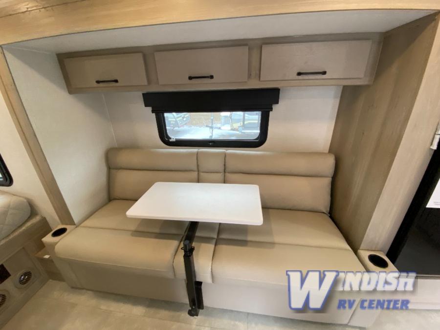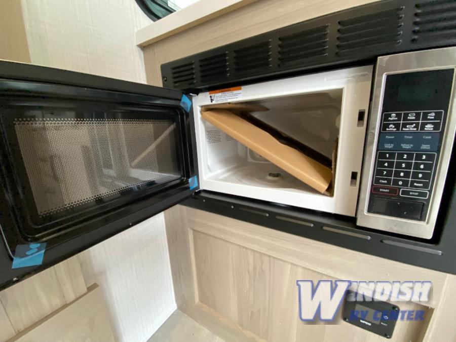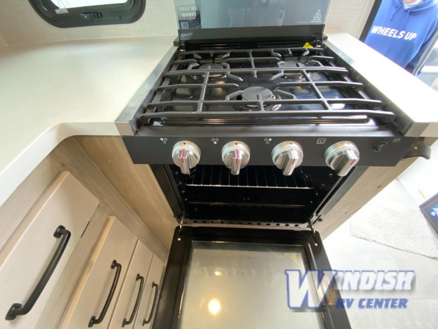 Are you looking for a lightweight trailer with at-home comforts? Take a look at this single slide out unit that can sleep three to four each night. There is a queen-size bed in the back with a 26" x 80" flip-up bunk for cozy sleeping space, a 72" sofa with cupholders to relax on, plus a 32" 12V TV for movie nights! The front kitchen includes a 12V refrigerator to store food, plus a microwave oven and a gas oven to cook meals each day.