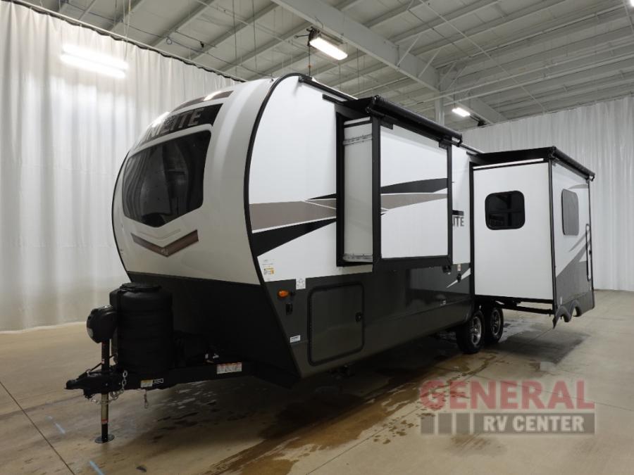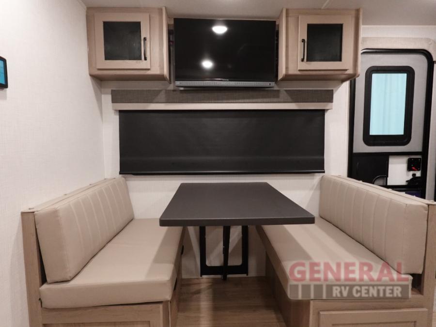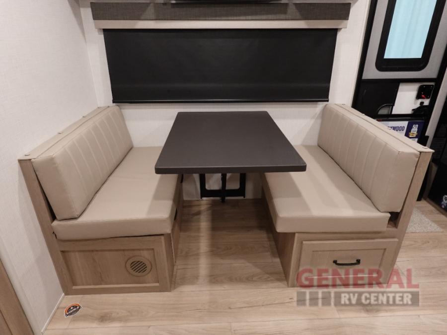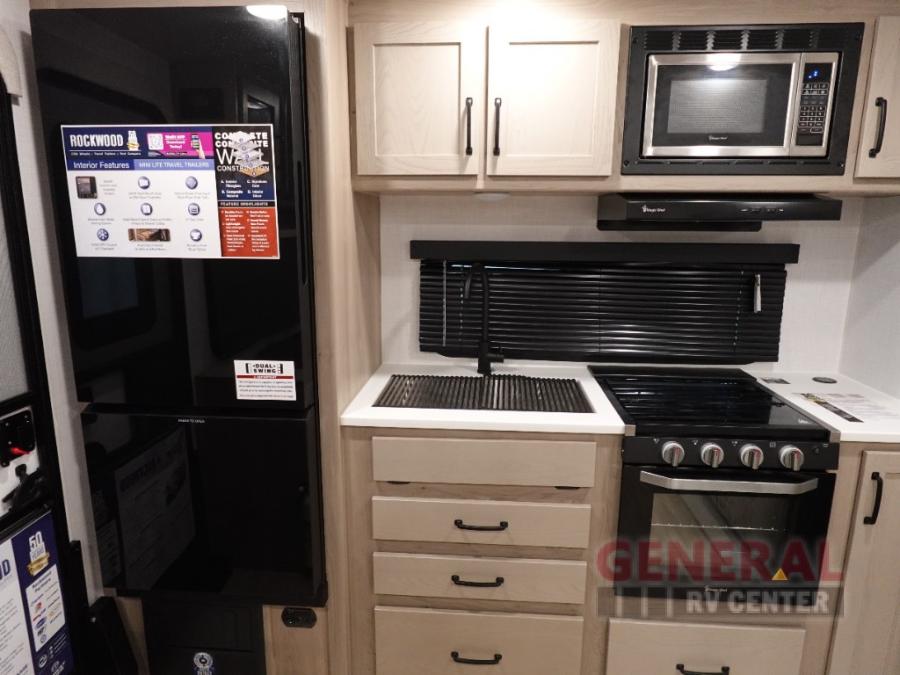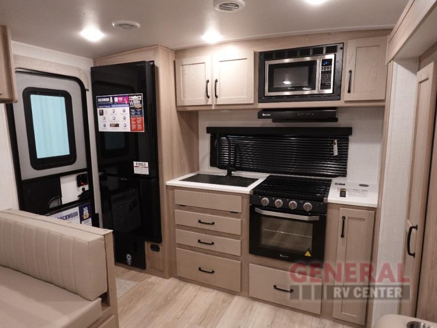 Each Rockwood Mini Lite travel trailer by Forest River is constructed with a fully laminated one-piece walkable roof, sleek frameless windows, and a six-sided full aluminum frame for strength and durability. The 12V thermostatically controlled heated tanks, plus radiant foil in the underbelly and slide out floors will allow you to camp well into the colder months, and the 200W roof solar panel will be perfect for a little off-gridding. Each model includes solid surface kitchen countertops, solid wood cabinet doors, night roller shades, plus many more interior features. Having an AIR 360+ omnidirectional antenna with WiFi prep on board gives you the option to get some work done if it's needed, and the power tongue jack provides hassle-free set up, so you can enjoy more time relaxing!