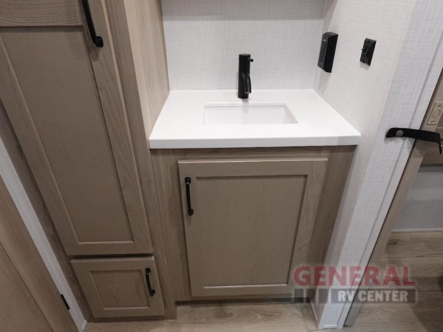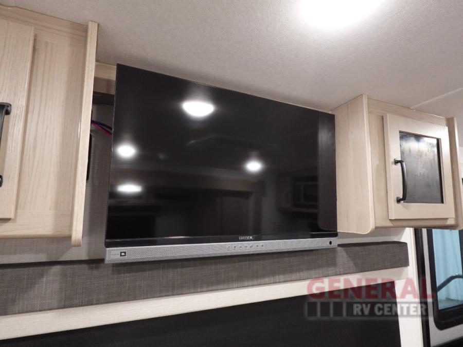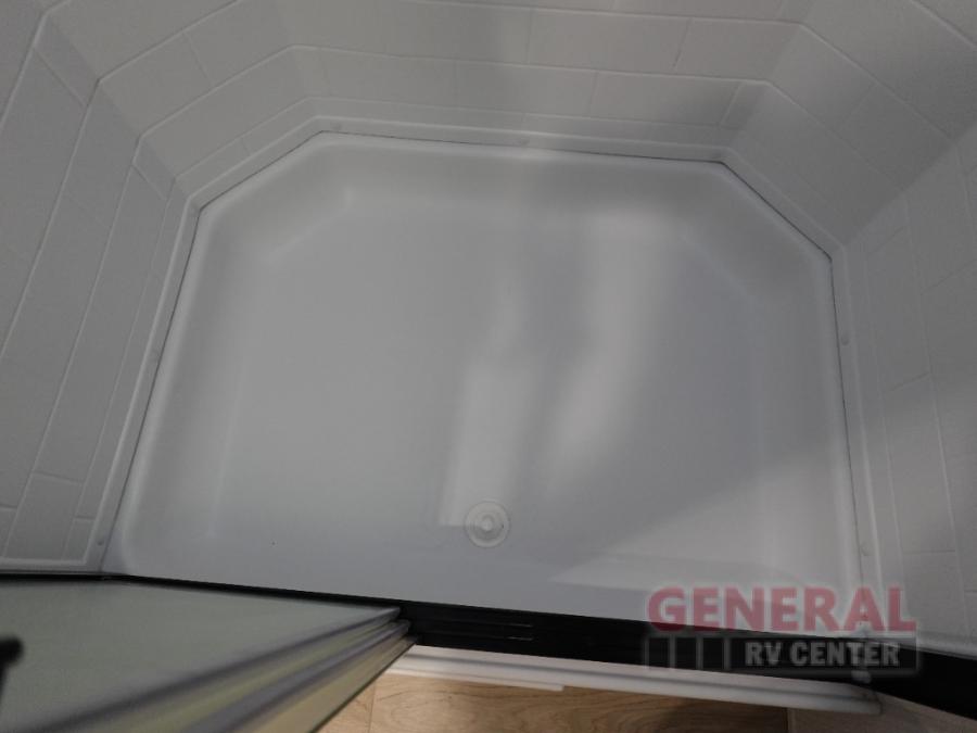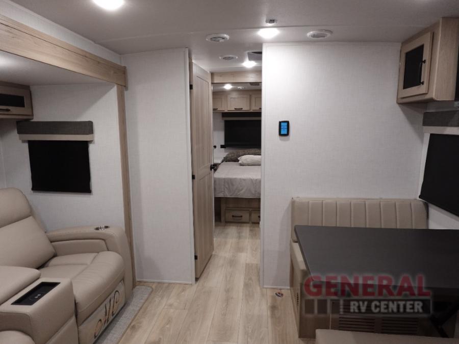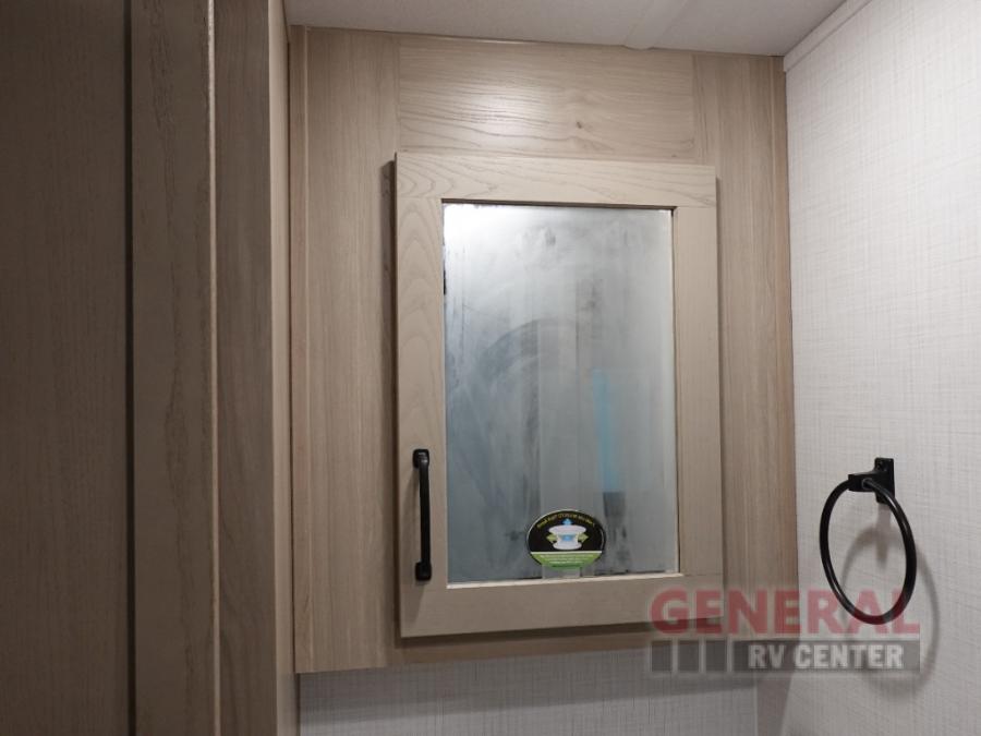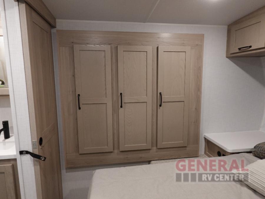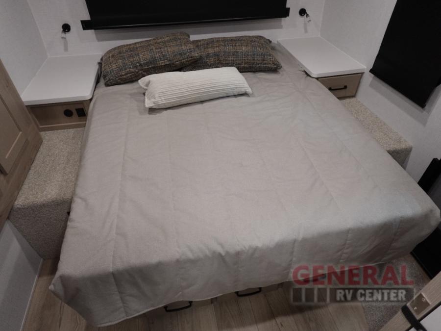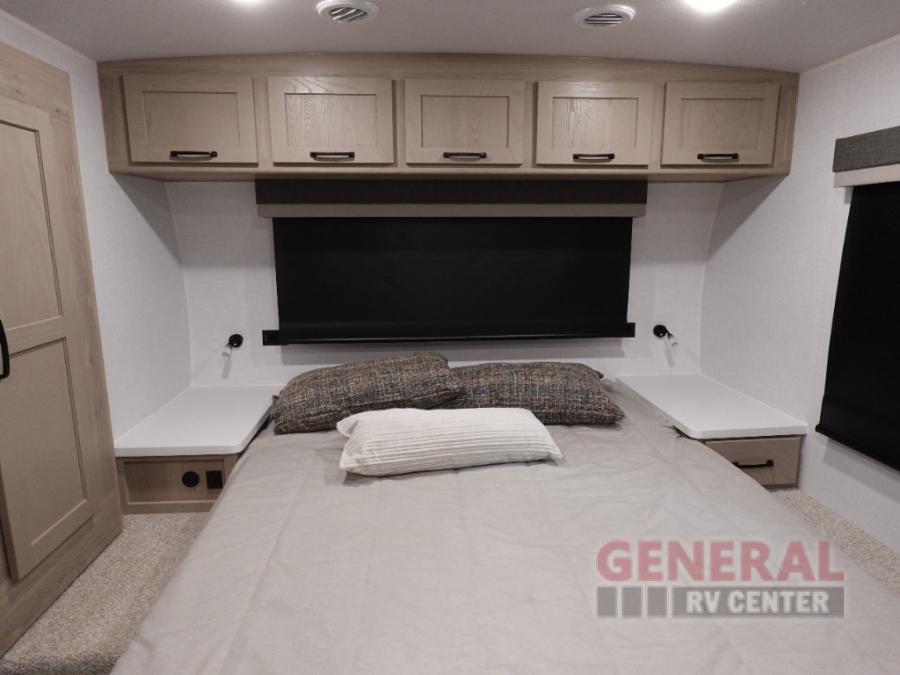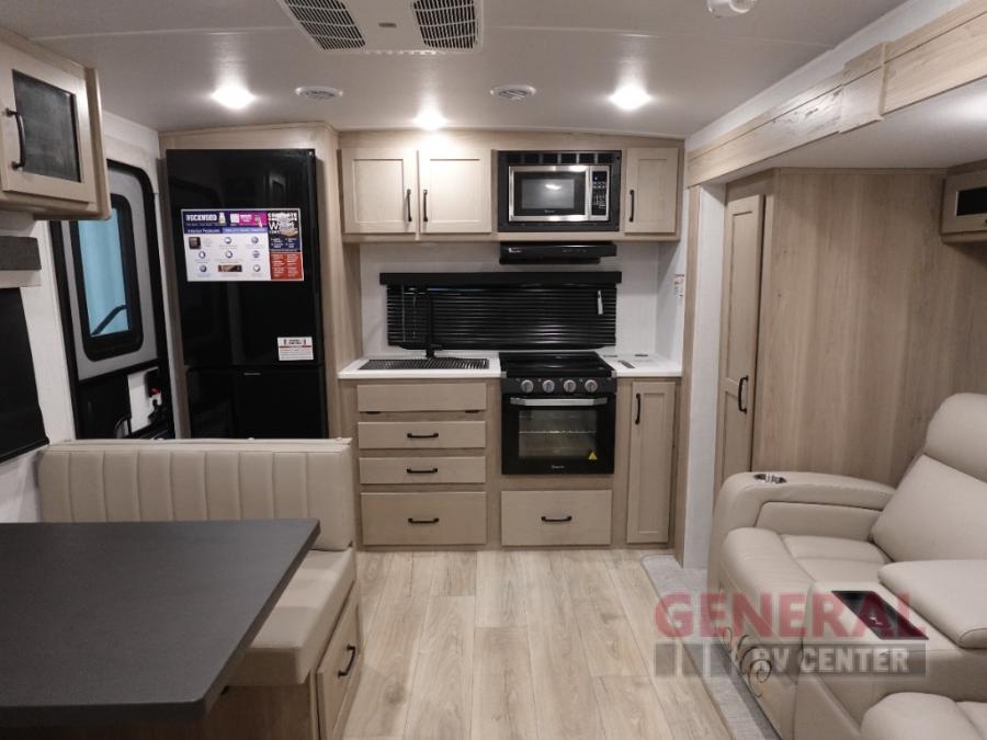 You and your spouse will have a great time camping in this travel trailer! You will have your own RV queen bed to sleep on in the front private bedroom, and an optional TV can be added if you enjoy the morning news in bed. Breakfast can be made on the three burner cooktop in the rear kitchen, or head outdoors to cook on the outside griddle. The 67" theater seating with cupholders will provide a place to relax and dine together, and the spacious walk-through bath will allow you to clean up before you head out for the day. This model includes plenty of storage space, including a pantry for your snacks, a wardrobe slide out in the bedroom, plus a drop-frame pass-through storage for larger camp gear!